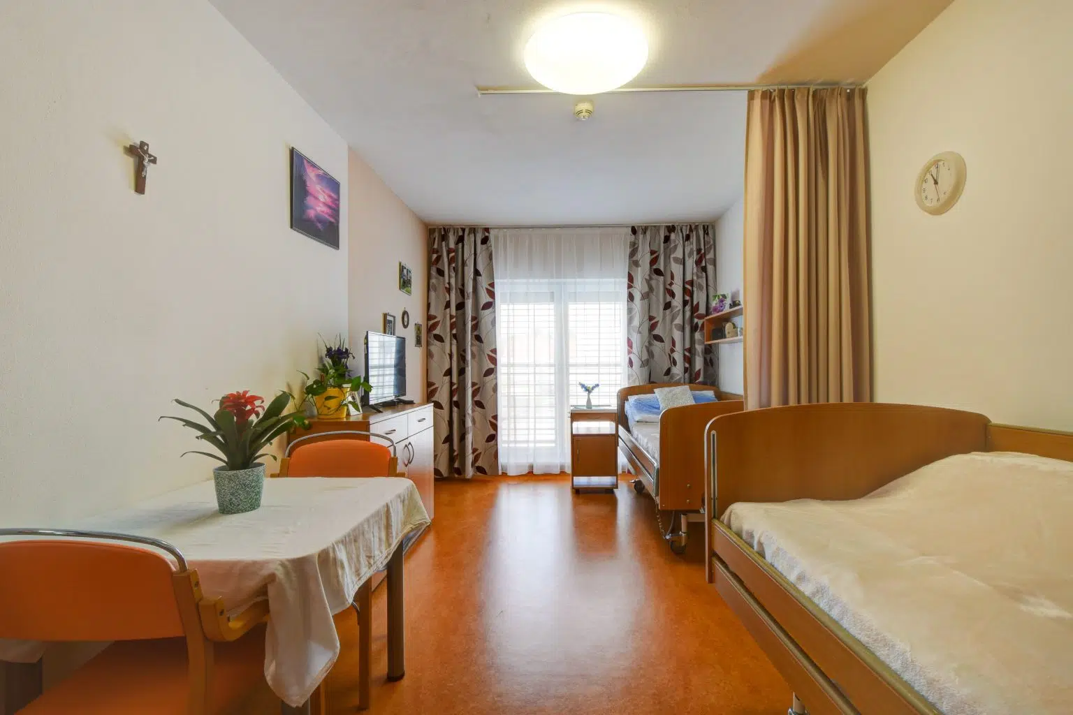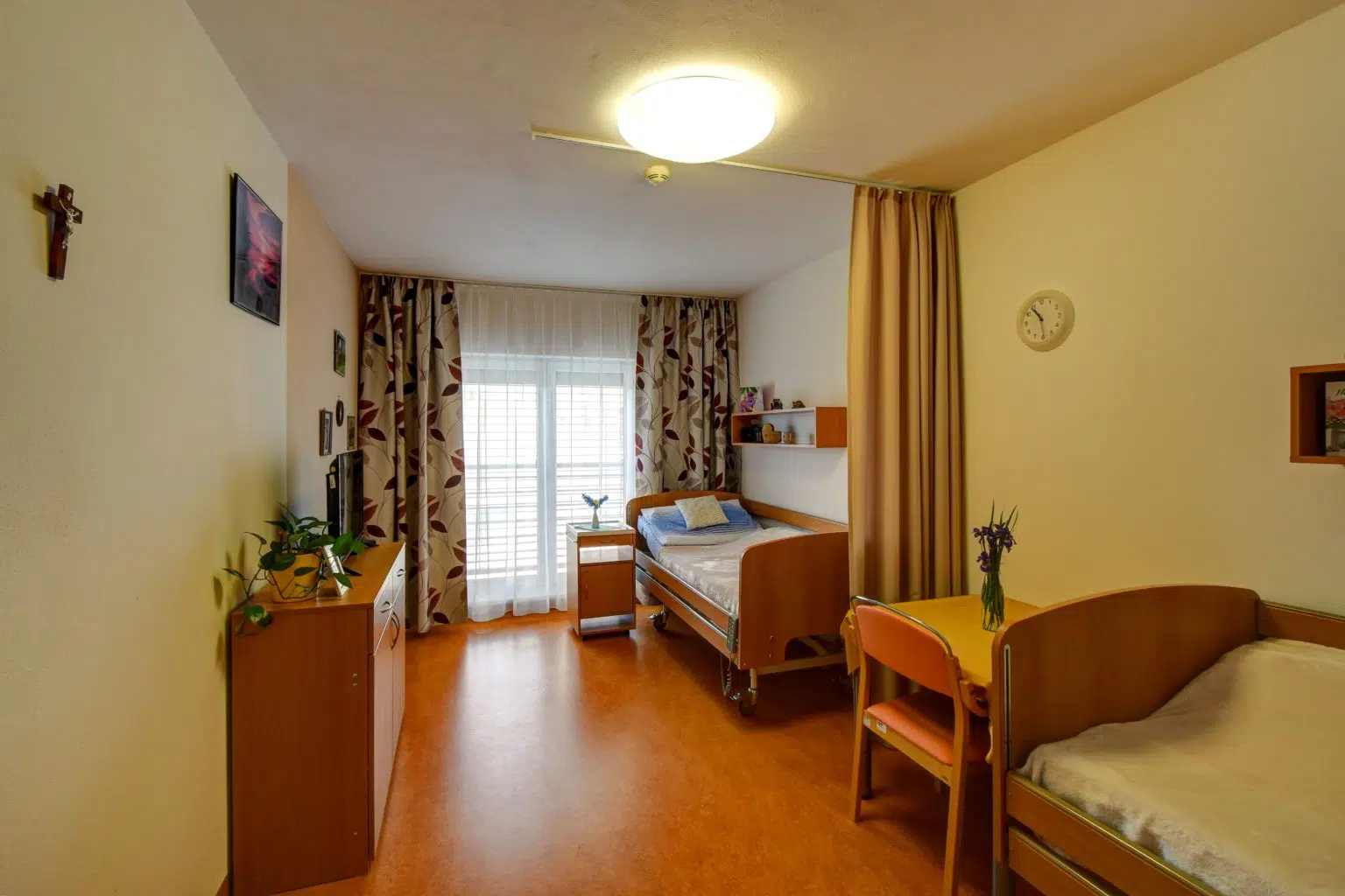 Pokoje jsou navrženy tak, aby každý klient měl soukromí, komfort a pocit bezpečí. Nabízíme jednolůžkové, dvoulůžkové a třílůžkové pokoje, vybavené nábytkem na míru: elektricky polohovací postele s antidekubitní matrací, uzamykatelné skříně s trezorem, police, stůl, židle a noční stolek. Klienti si mohou pokoj vyzdobit vlastními předměty – fotografie, knihy, oblíbené dekorace.