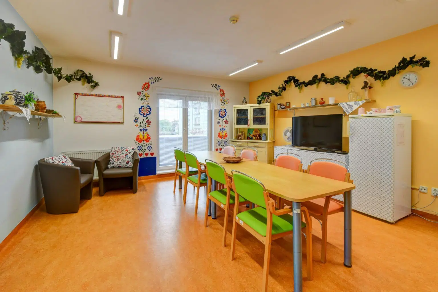 Na každém patře je klientům k dispozici společenská klubovna. Unikátem našeho interiéru jsou stylové retro-koutky vybavené dobovými předměty, které využíváme pro vzpomínkovou terapii a navození příjemných pocitů spojených s mládím.