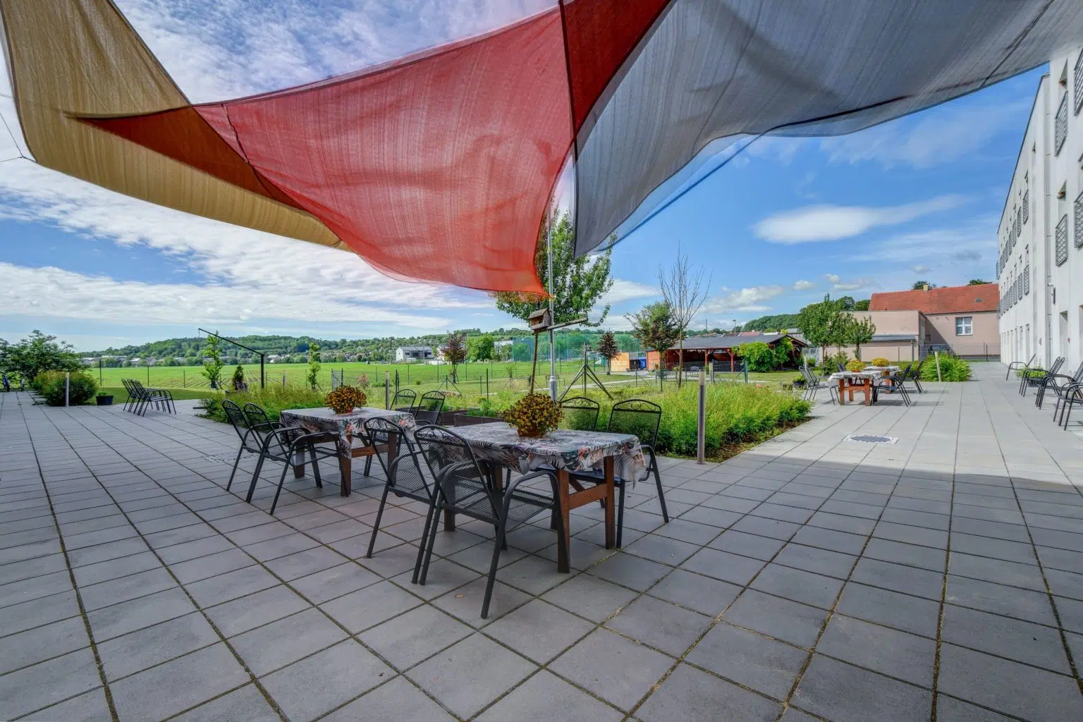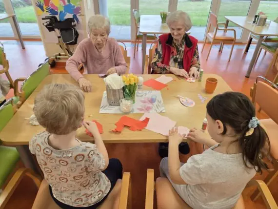 Velký důraz klademe na mezigenerační kontakt. Spolupracujeme s mateřskými a základními školami, jejichž návštěvy přinášejí energii, radost a nové podněty. Děti, studenti i rodinní příslušníci se účastní společných aktivit – naše dveře jsou vždy otevřené. K posezení i v deštivém počasí slouží prostorná venkovní zastřešená pergola. Zajímavým prostorem je naše retro kavárna.