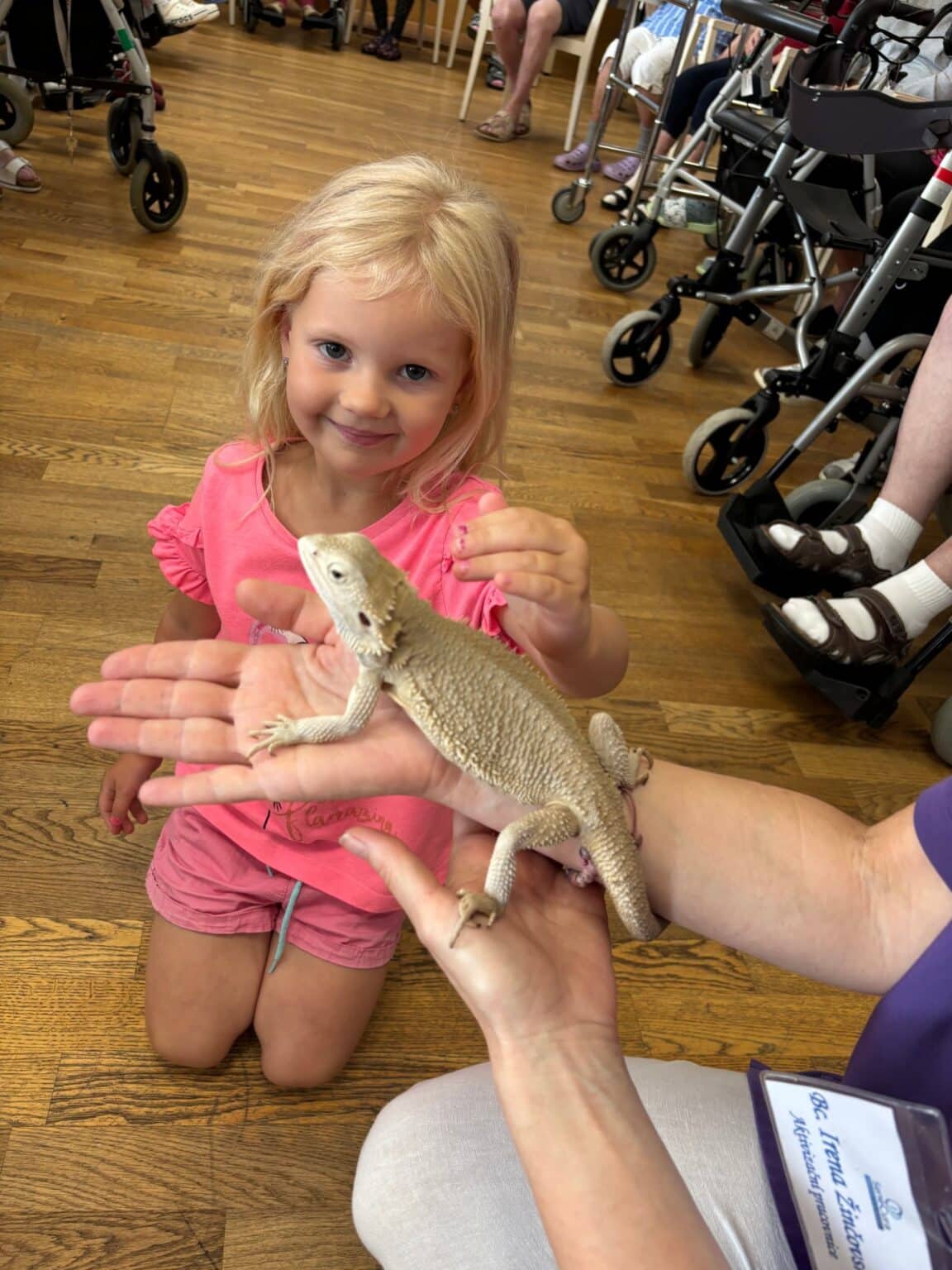 Mezi zvířecí návštěvníky patřila například agama, gekoni, chameleon, tilikva obrovská, ježek bělobřichý, několik druhů želv a také oblíbená morčata – jedno z nich dokonce bez srsti! Chovatel o každém zvířeti poutavě vyprávěl – dozvěděli jsme se, čím se živí, odkud pocházejí, jaká mají specifika i jak o ně pečovat. Výklad byl velmi zajímavý a obohacující, a to nejen pro milovníky zvířat.