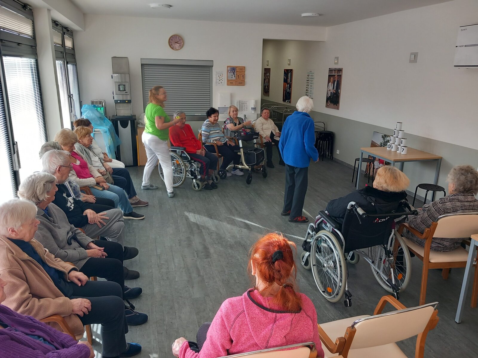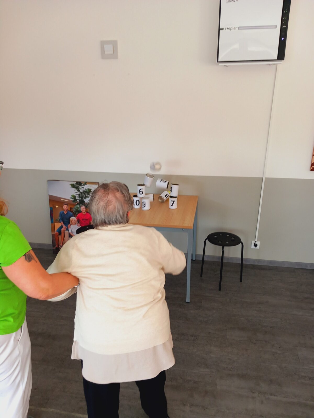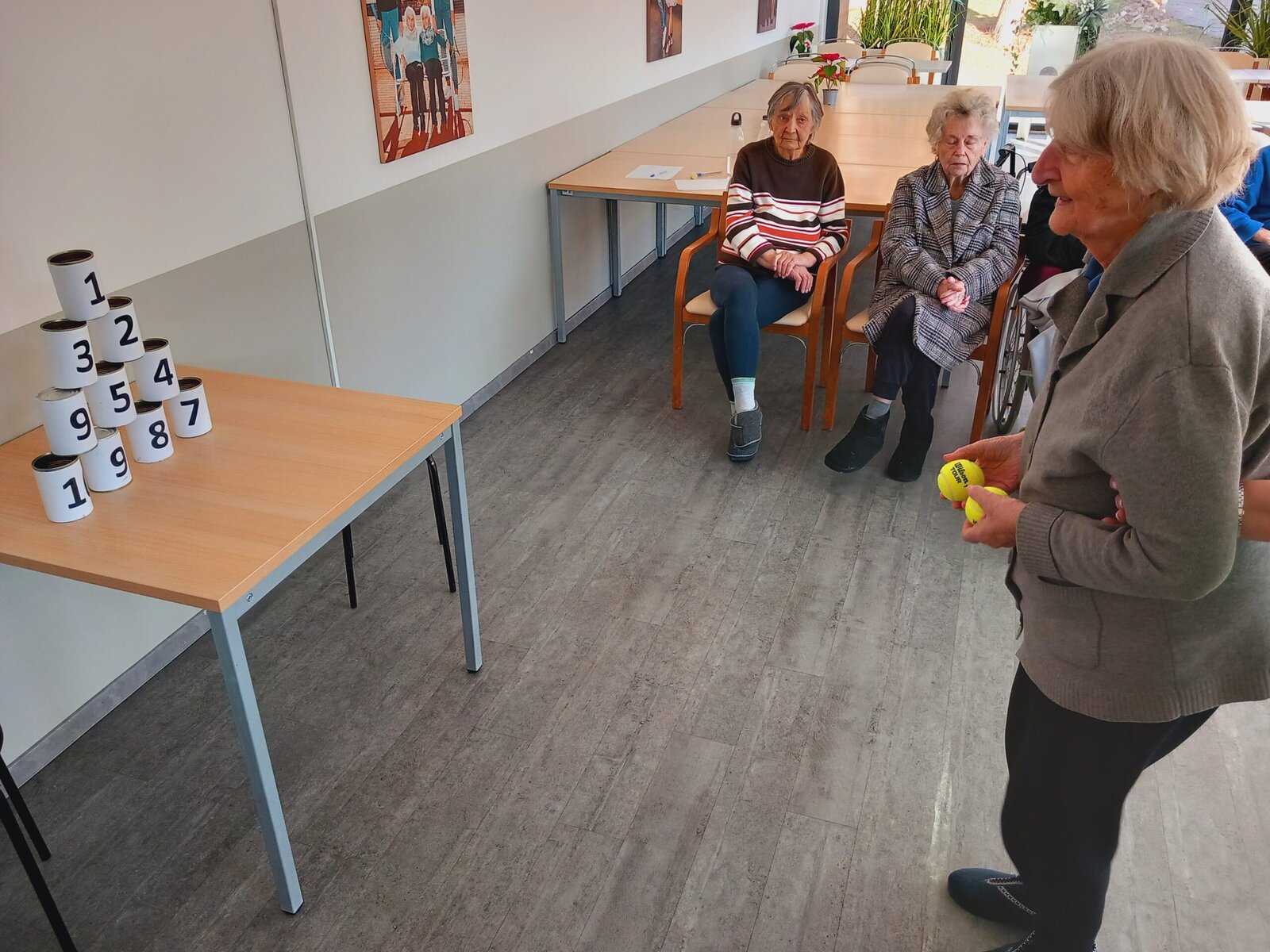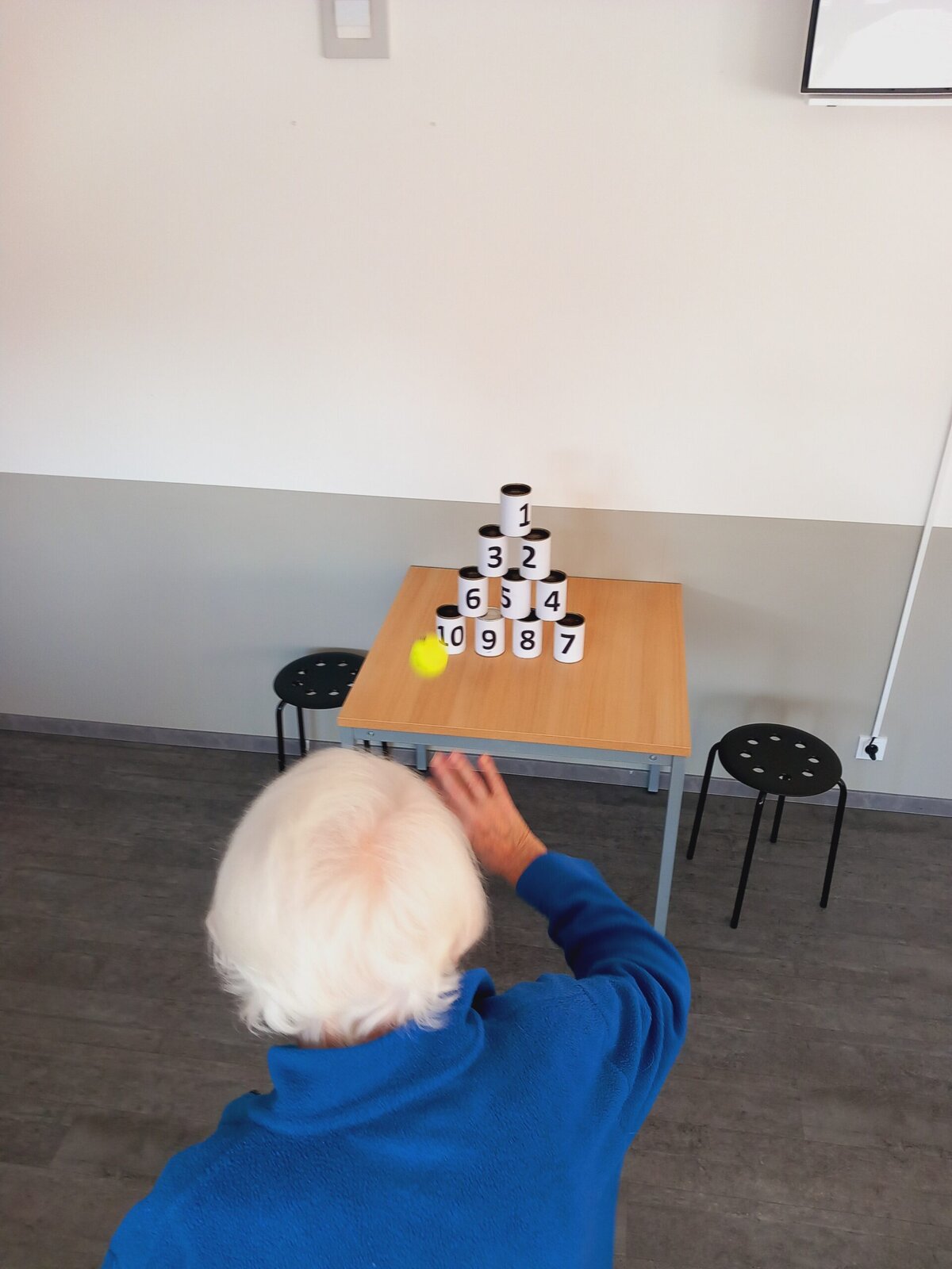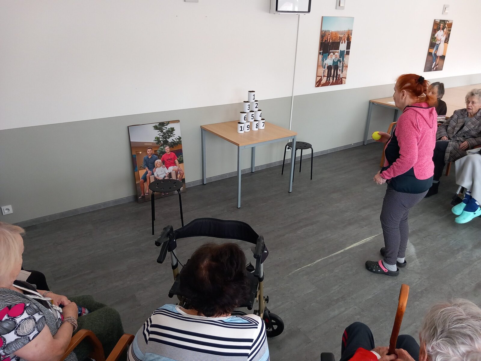 Shazování plechovek s čísly tenisovým míčkem je nejen zábavné, ale také skvělé pro podporu hrubé motoriky a zdravé soutěživosti mezi klienty – samozřejmě v tom nejlepším smyslu! Plechovky byly pečlivě očíslované a každý klient získával body podle toho, kolik plechovek se mu podařilo shodit.