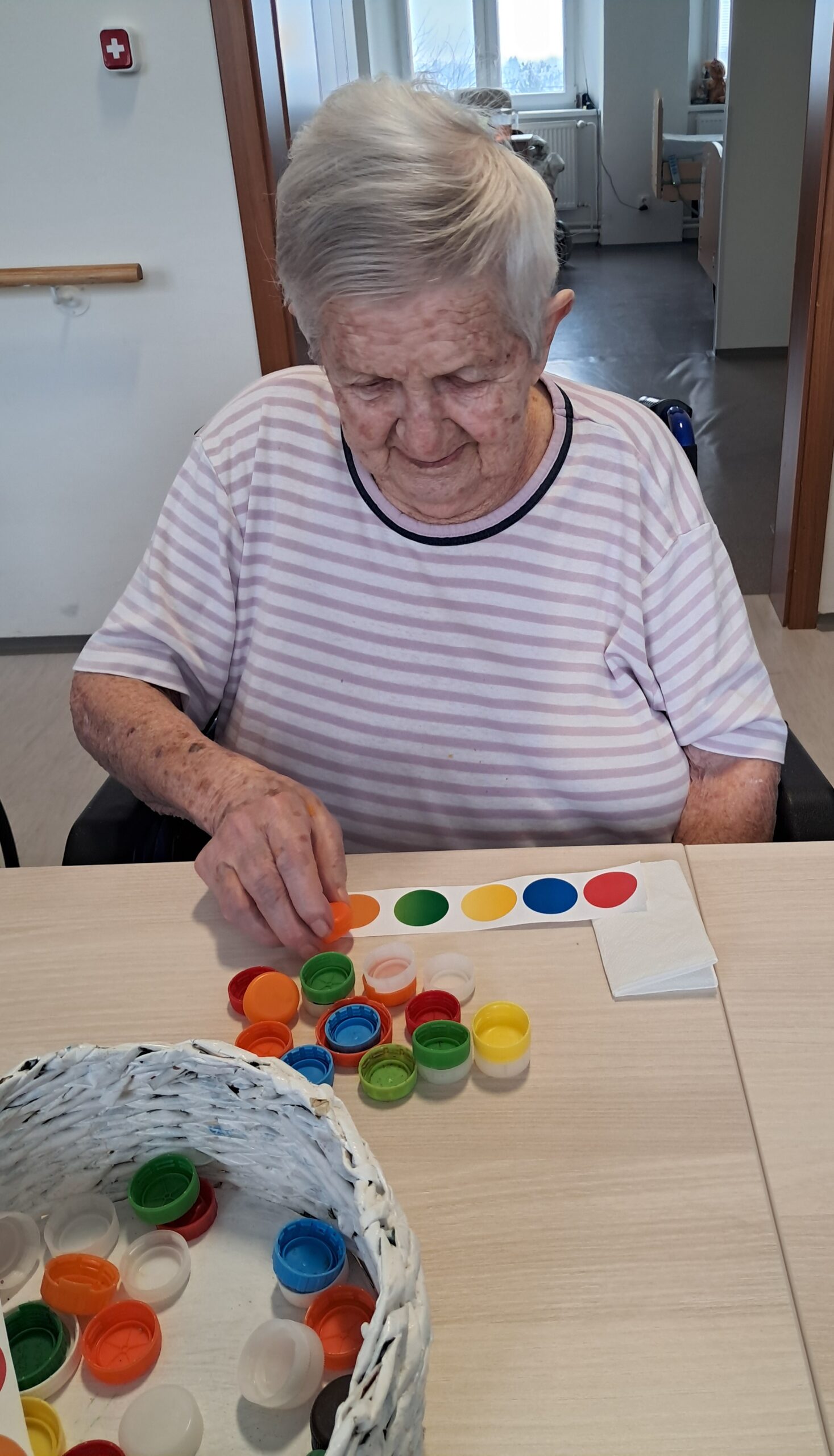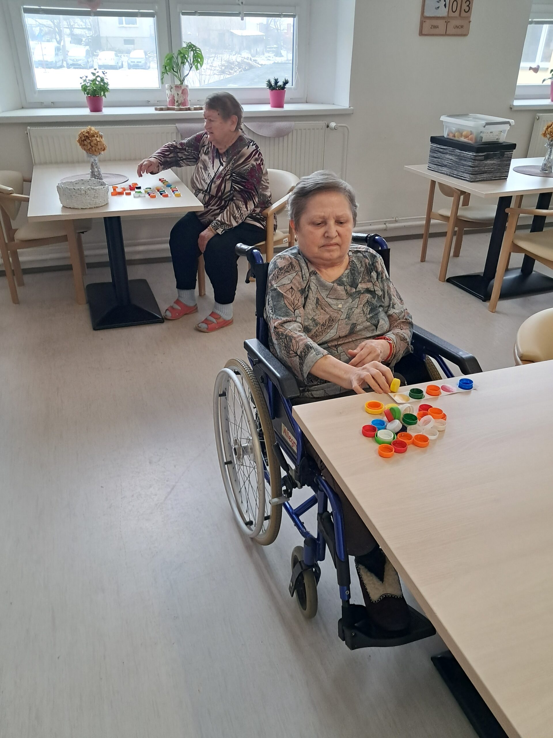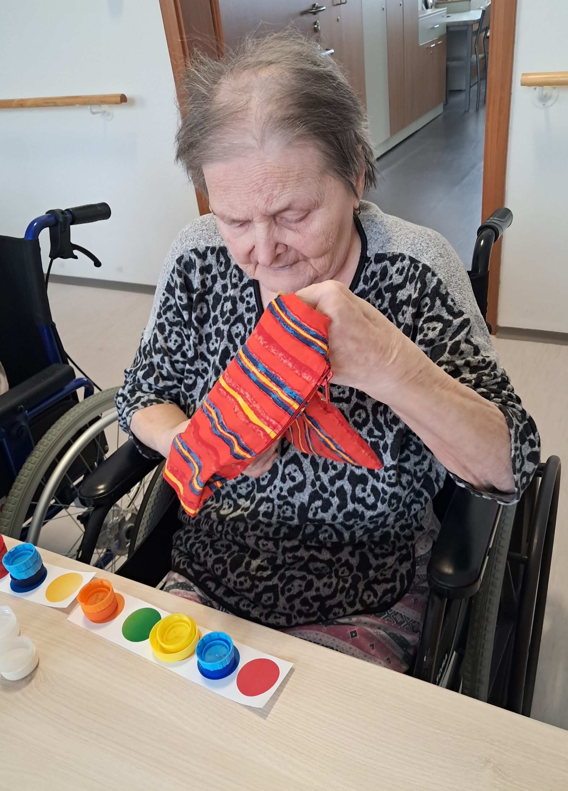 Dopoledne proběhla smyslová aktivizace, jejímž cílem bylo podpořit vnímání, soustředění a jemnou motoriku. Klienti pomocí hmatu poznávali předměty ukryté v pytlíčcích, podle čichu rozlišovali různé vůně a ukládáním barevných koleček na předlohy procvičovali rozlišování barev a pozornost. Aktivita klientům přinesla nové podněty, pocit úspěchu a příjemně strávený čas.