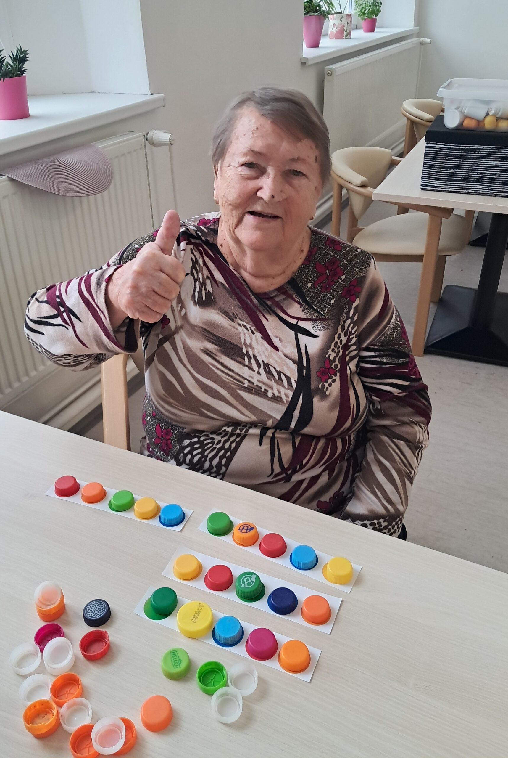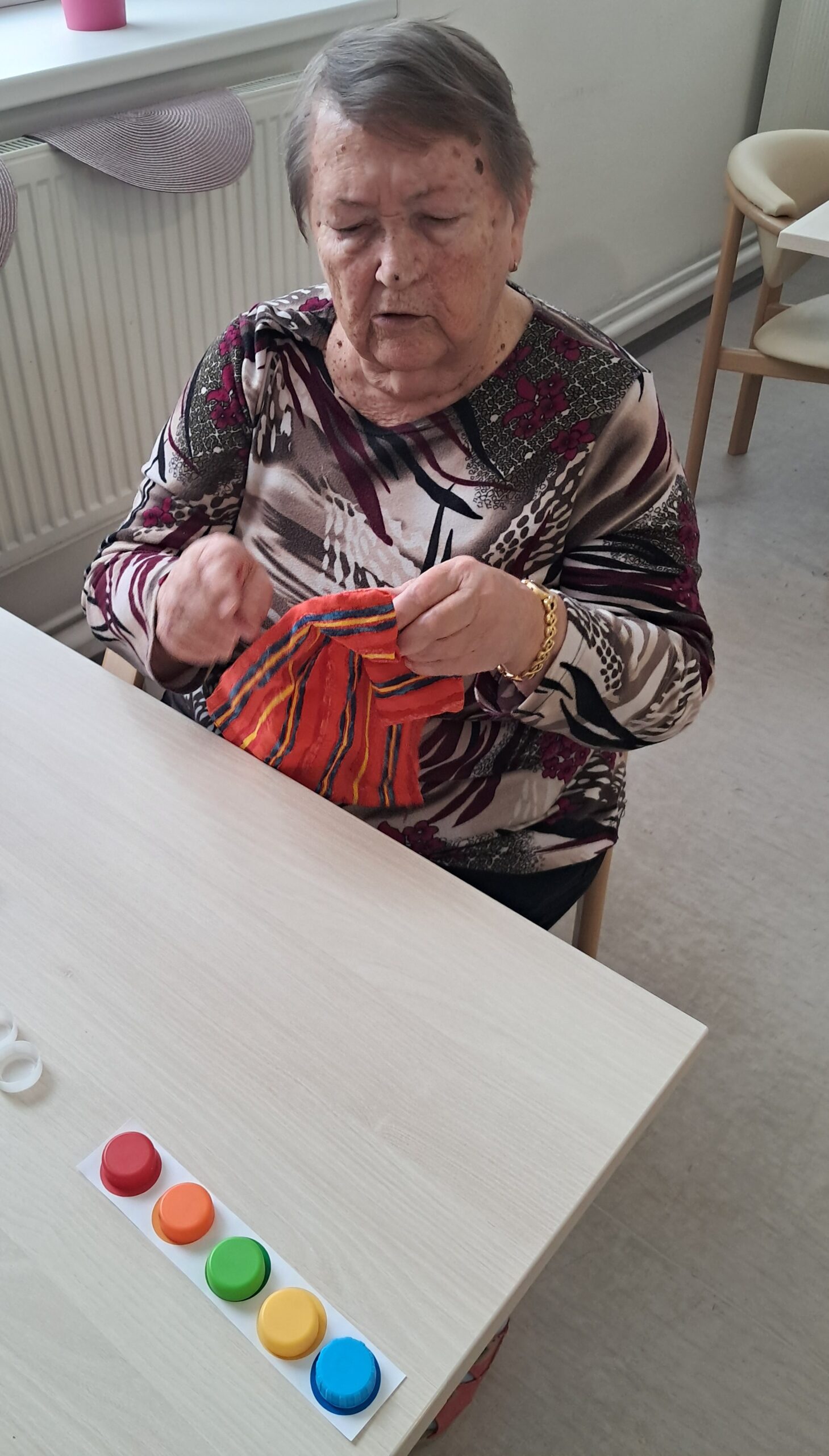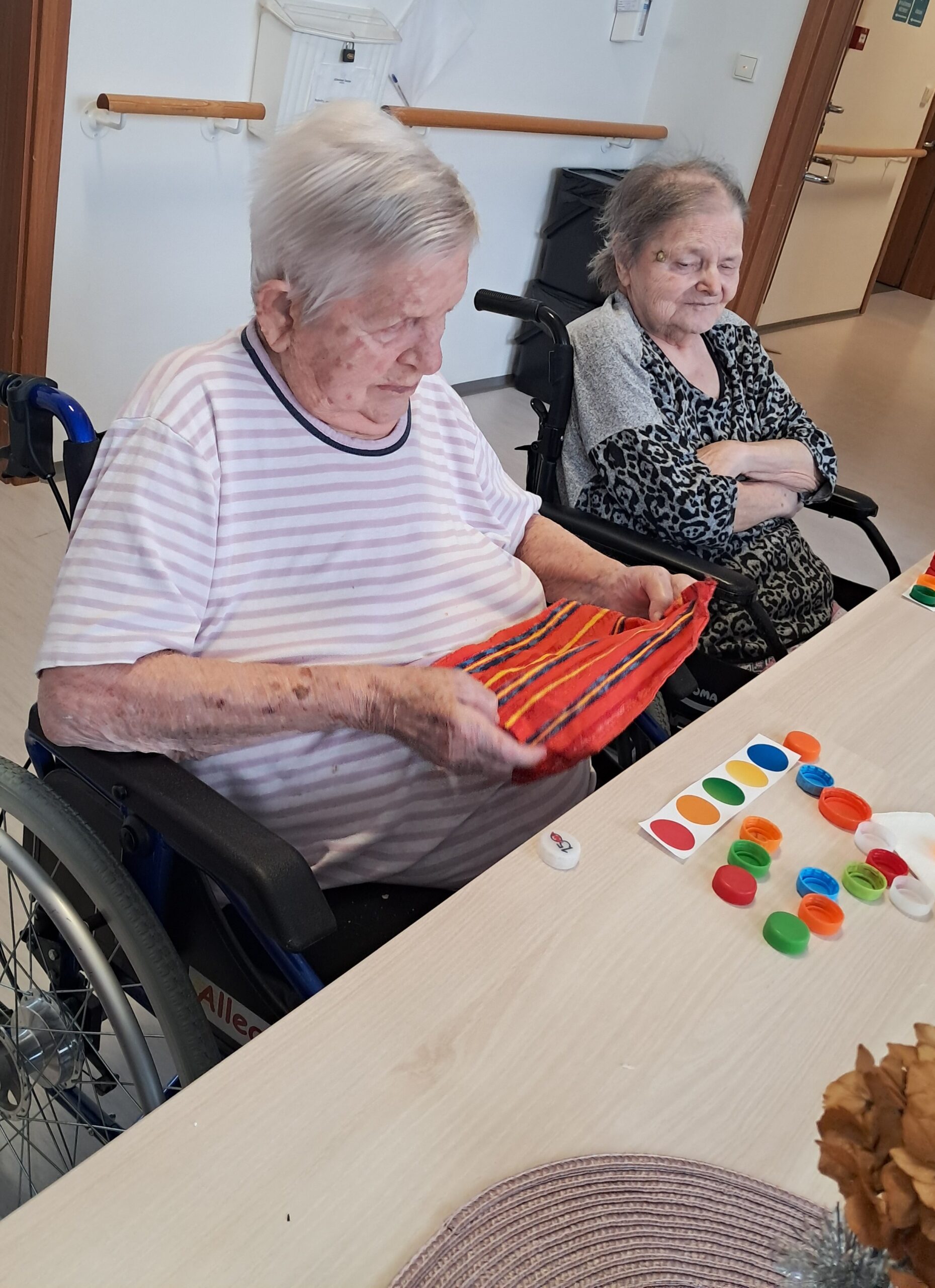 Dopoledne proběhla smyslová aktivizace, jejímž cílem bylo podpořit vnímání, soustředění a jemnou motoriku. Klienti pomocí hmatu poznávali předměty ukryté v pytlíčcích, podle čichu rozlišovali různé vůně a ukládáním barevných koleček na předlohy procvičovali rozlišování barev a pozornost. Aktivita klientům přinesla nové podněty, pocit úspěchu a příjemně strávený čas.