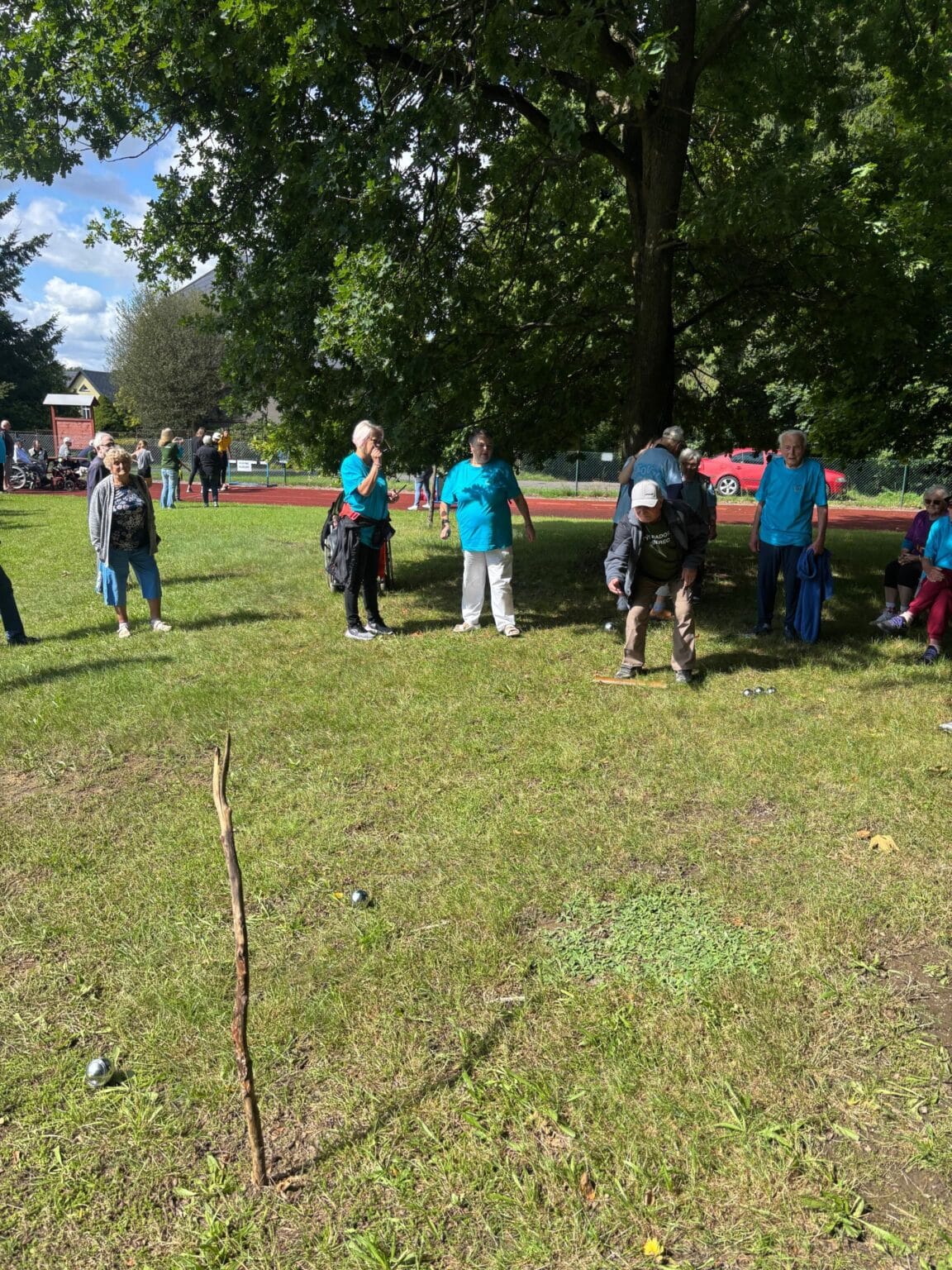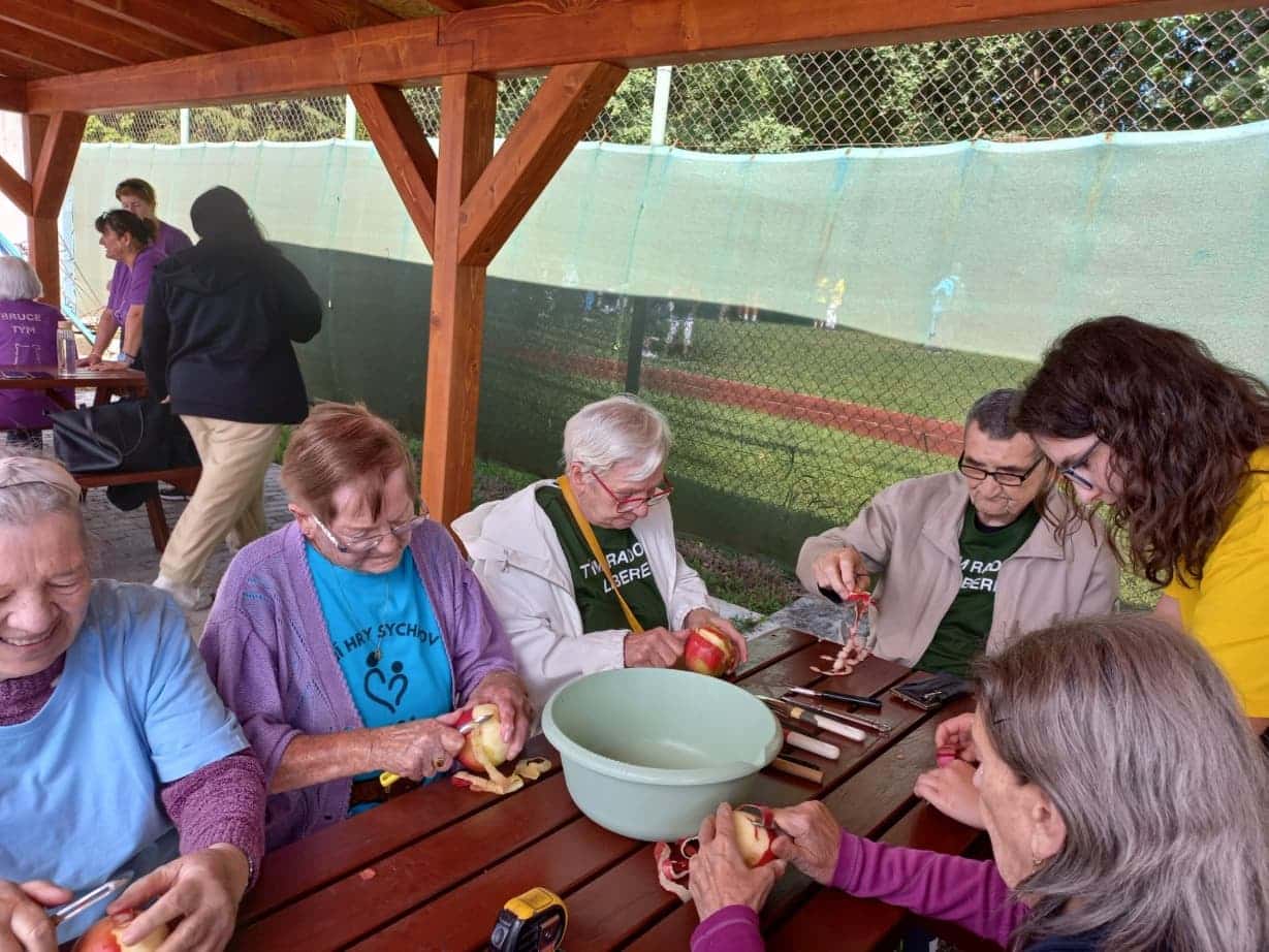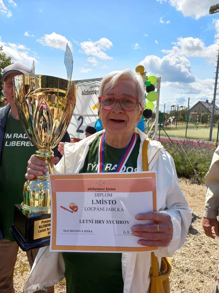 Naši klienti se zúčastnili hned několika soutěžních disciplín, které byly přizpůsobeny jejich možnostem – od kuželek a pétanque přes závod vozíčkářů, kopání na branku až po dovednostní úkoly, jako bylo namotávání provázku na čas nebo loupání co nejdelší jablečné slupky. Právě v této poslední disciplíně se zrodil nový rekord. Naše paní Machiánová s úsměvem a lehkostí oloupala jablko tak šikovně, že vytvořila slupku dlouhou 155 centimetrů. Sama se smíchem poznamenala: „To jablko mi přesně padlo do ruky!“