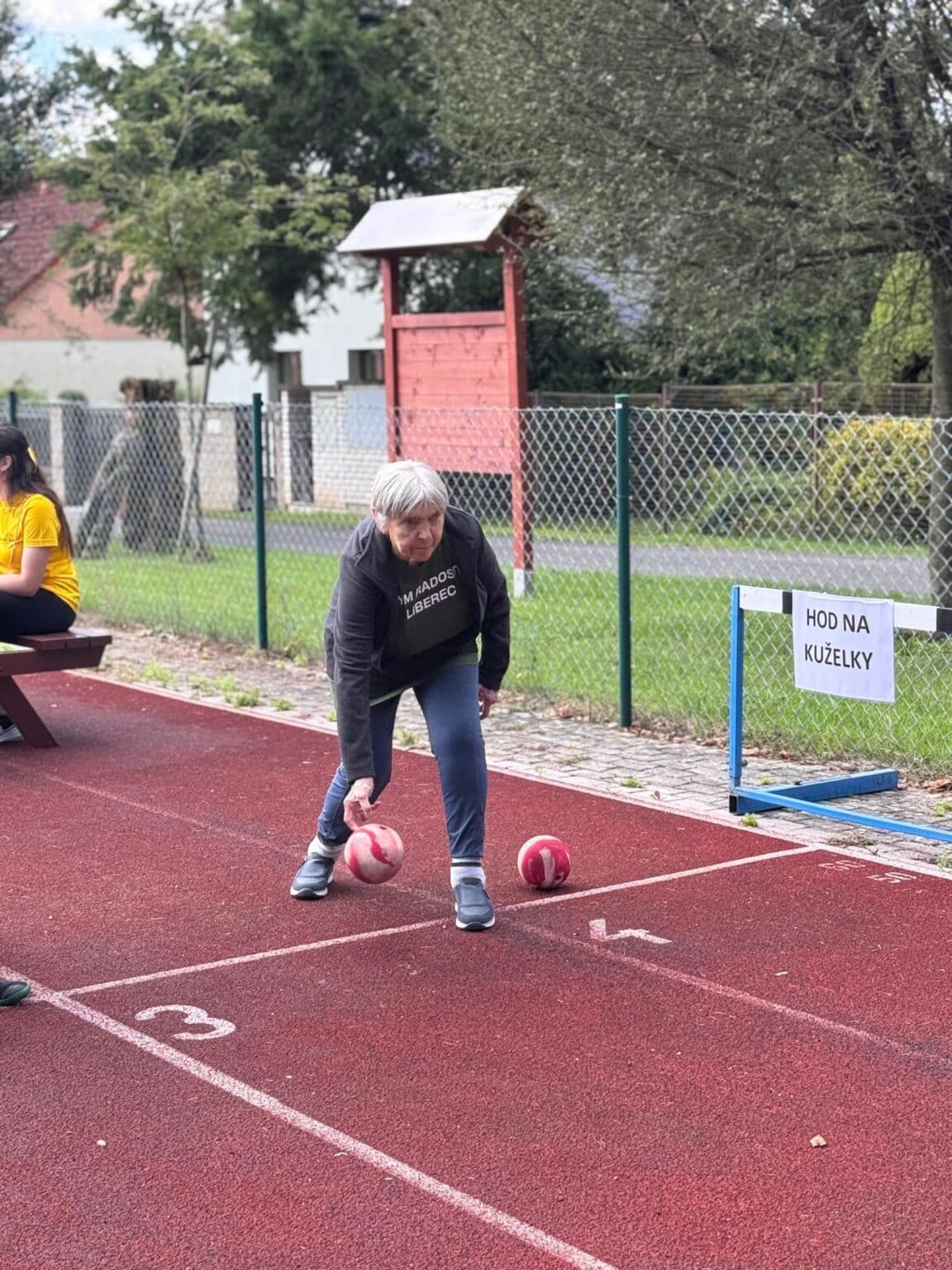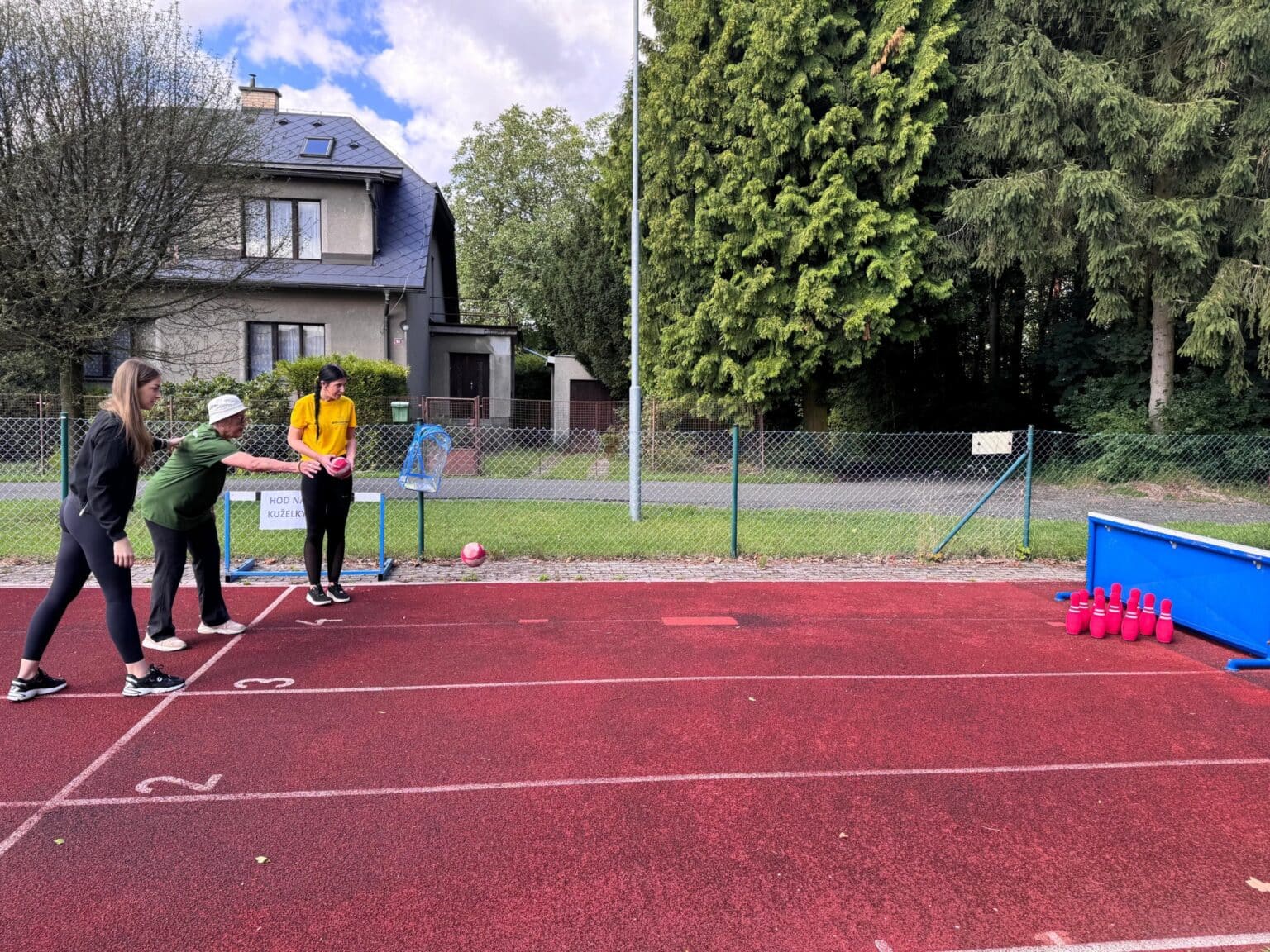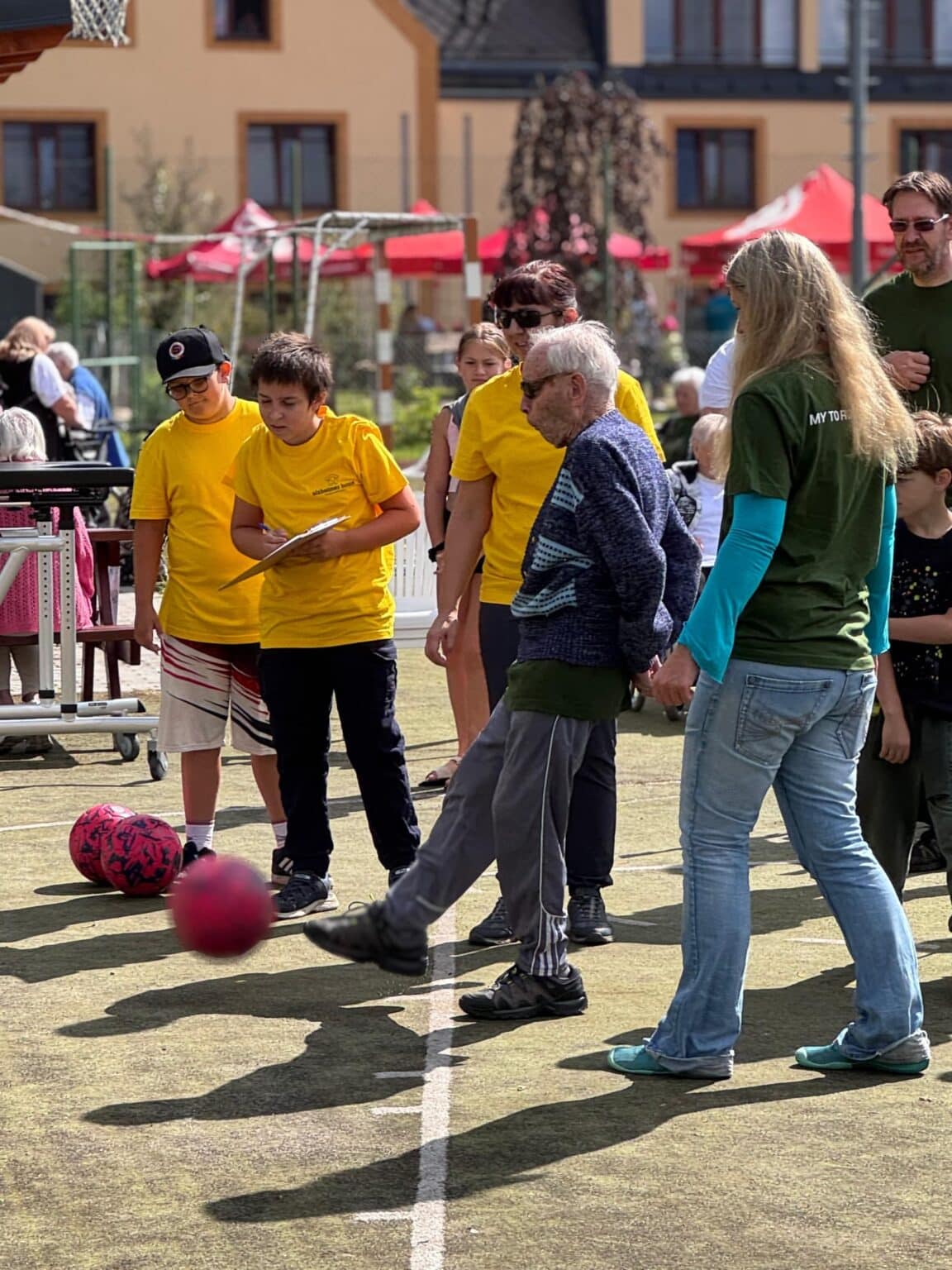 Naši klienti se zúčastnili hned několika soutěžních disciplín, které byly přizpůsobeny jejich možnostem – od kuželek a pétanque přes závod vozíčkářů, kopání na branku až po dovednostní úkoly, jako bylo namotávání provázku na čas nebo loupání co nejdelší jablečné slupky. Právě v této poslední disciplíně se zrodil nový rekord. Naše paní Machiánová s úsměvem a lehkostí oloupala jablko tak šikovně, že vytvořila slupku dlouhou 155 centimetrů. Sama se smíchem poznamenala: „To jablko mi přesně padlo do ruky!“
