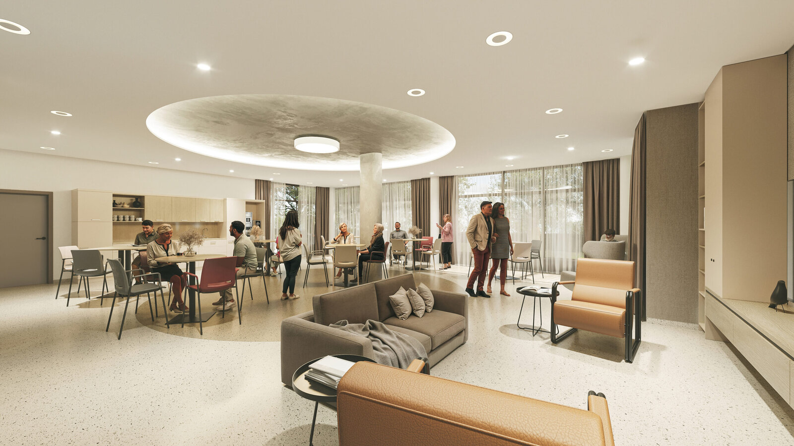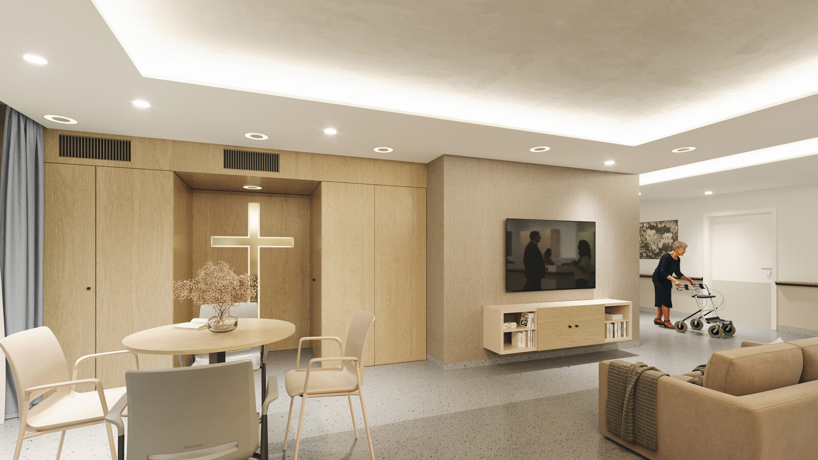 Součástí domova budou také společenské místnosti, jídelny, multifunkční aktivizační prostory, místnosti pro rehabilitaci a služby jako kadeřnictví nebo pedikúra – vše přímo v zařízení a běžně dostupné klientům.