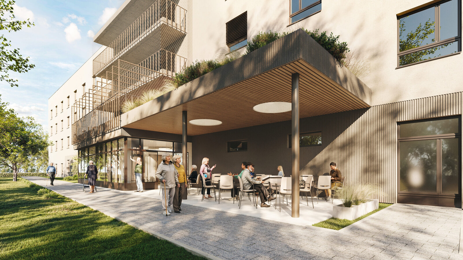 Pokoje v přízemí budou mít navíc přímý vstup do zahrady, která nebude sloužit jen k odpočinku, ale i jako zázemí pro aktivizační programy, terapeutické činnosti či menší kulturní akce.
