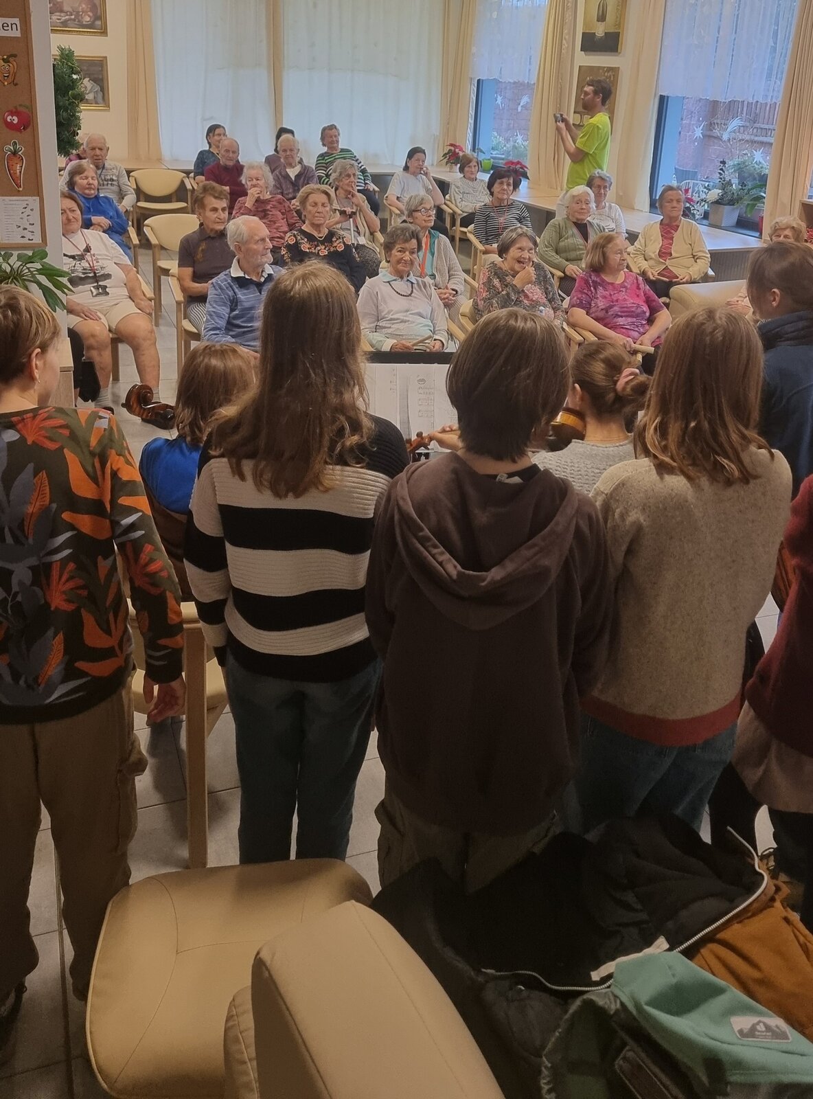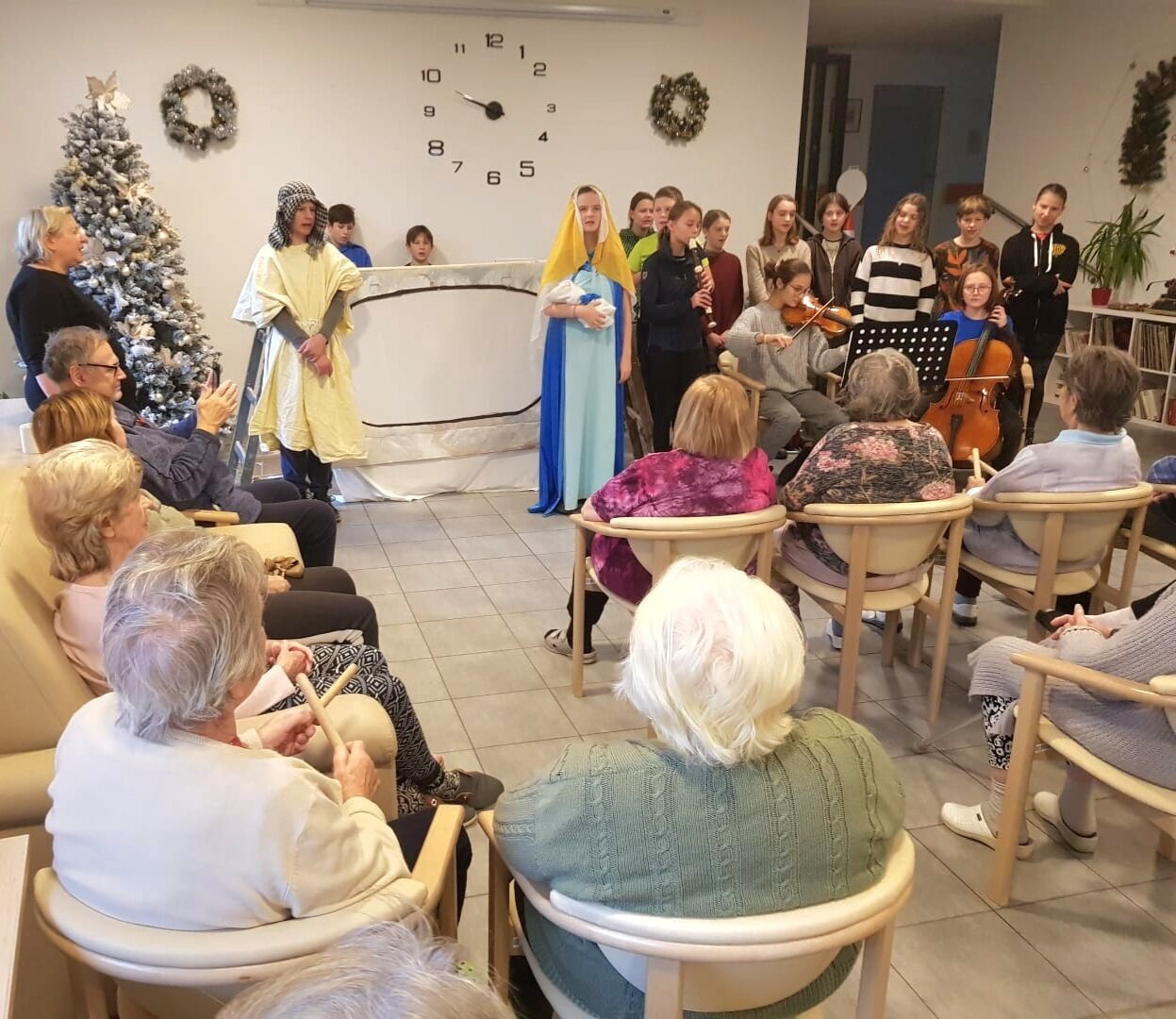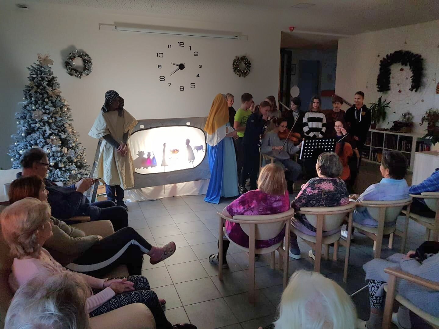 Krásný dopolední zážitek, kdy nám děti z komunitní školy Jeden strom, přišly zahrát vánoční příběh prostřednictvím stínového divadla. Poté jsme zpívali společně vánoční koledy, klienti doprovázeli hraním na hudební nástroje.
