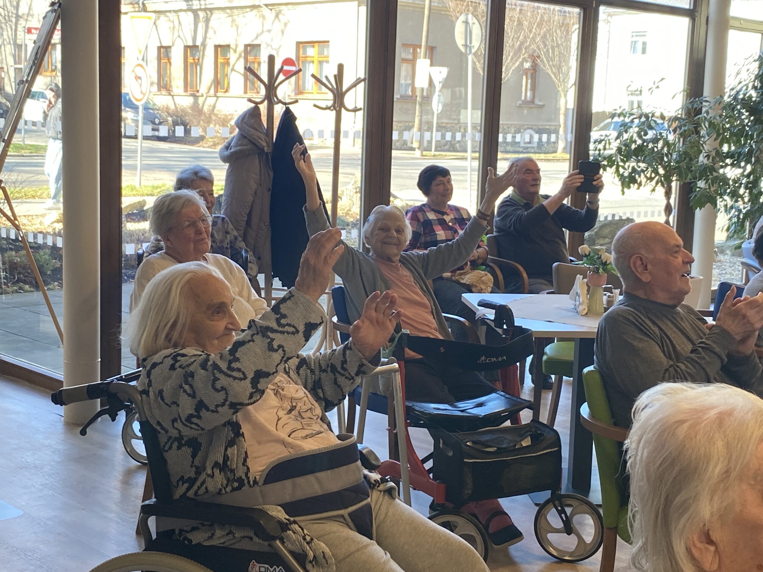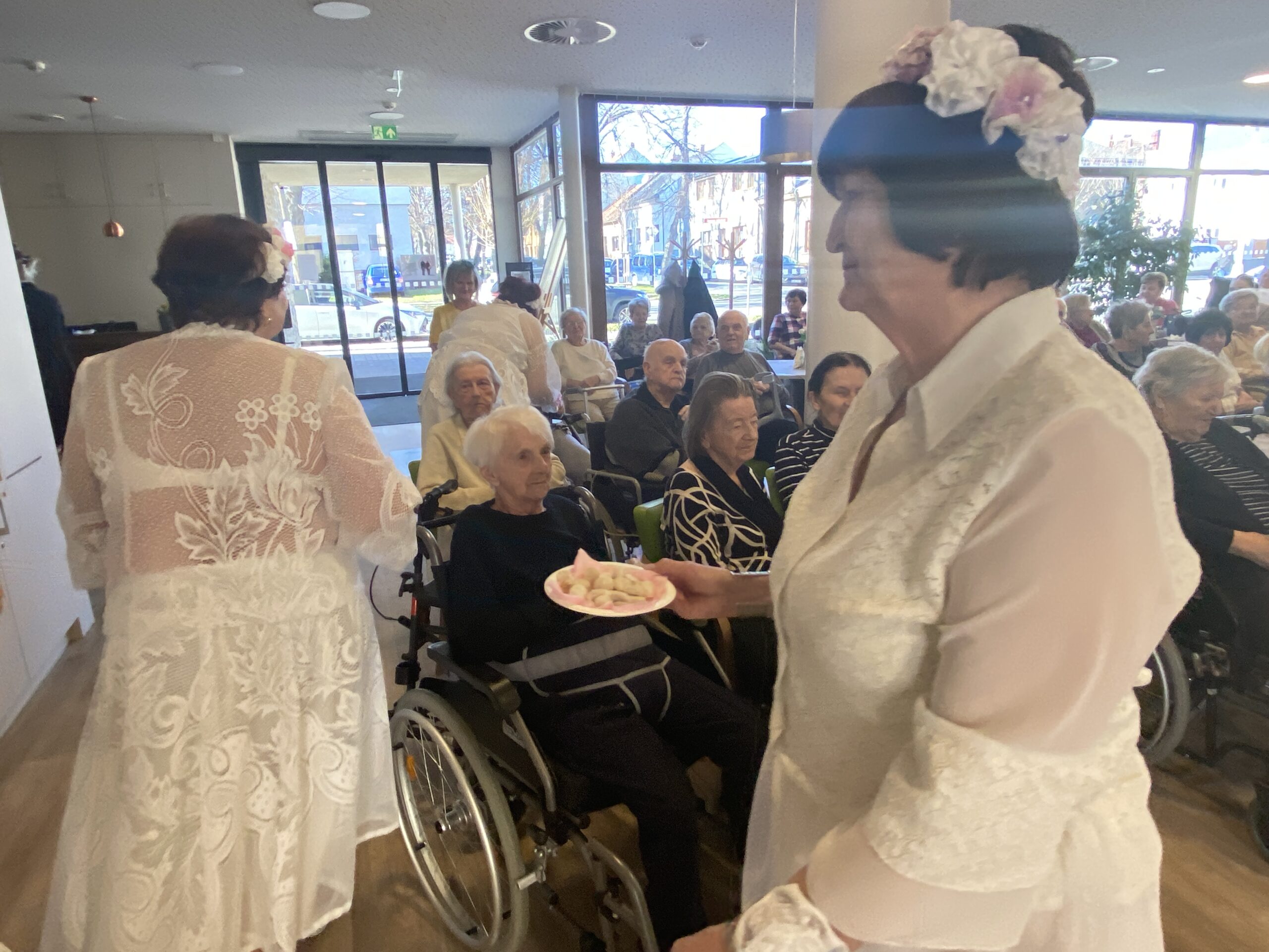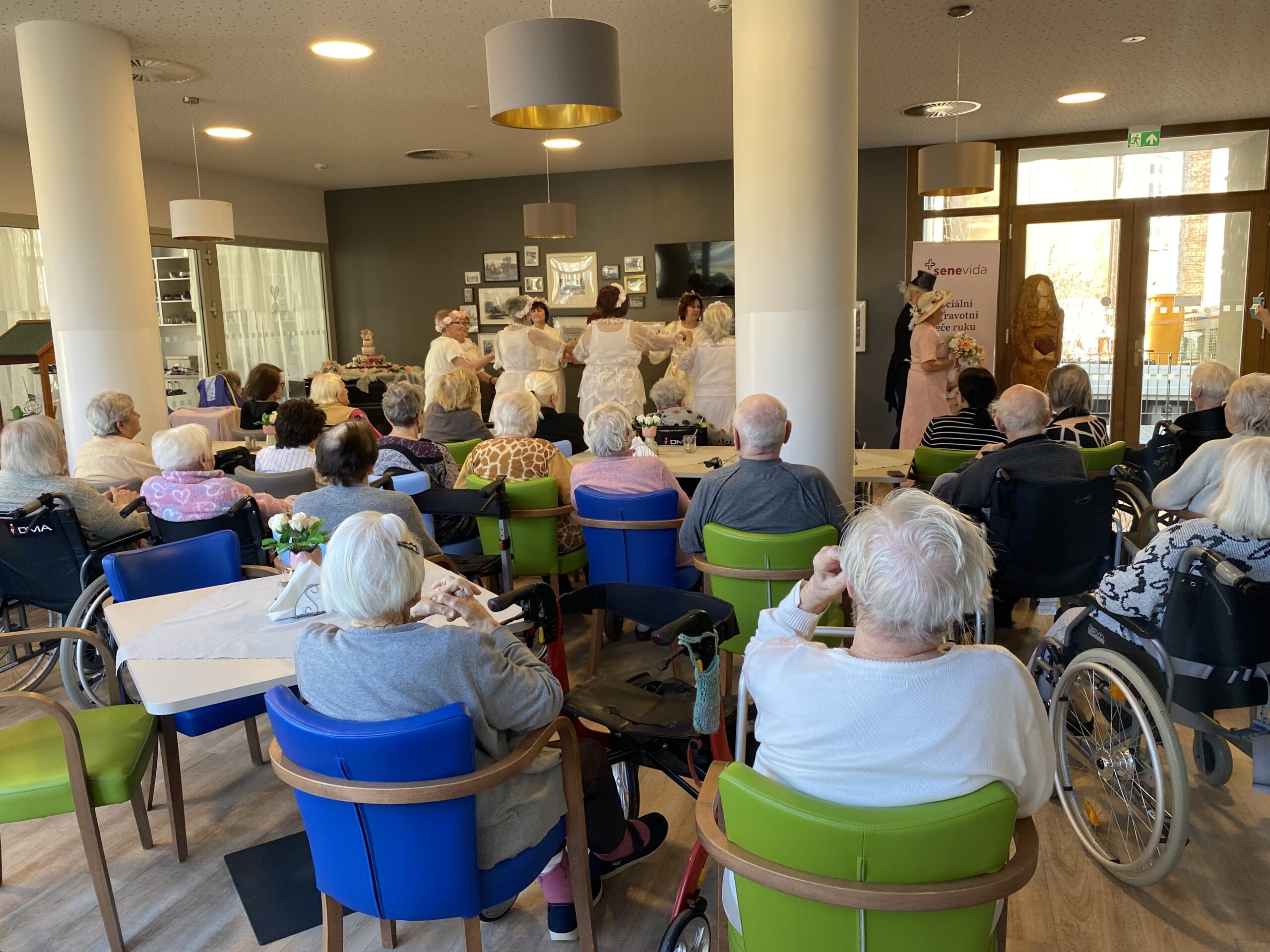 Tentokrát se jejich vystoupení neslo v duchu svatebního pochodu, nechyběly tradiční české slavnostní písně a celý dojem jen dokreslovaly tematické svatební kostýmy. Na závěr vystoupení si naši klienti pochutnali na svatebních koláčcích a věnovali Třídvoračkám hlasitý potlesk.