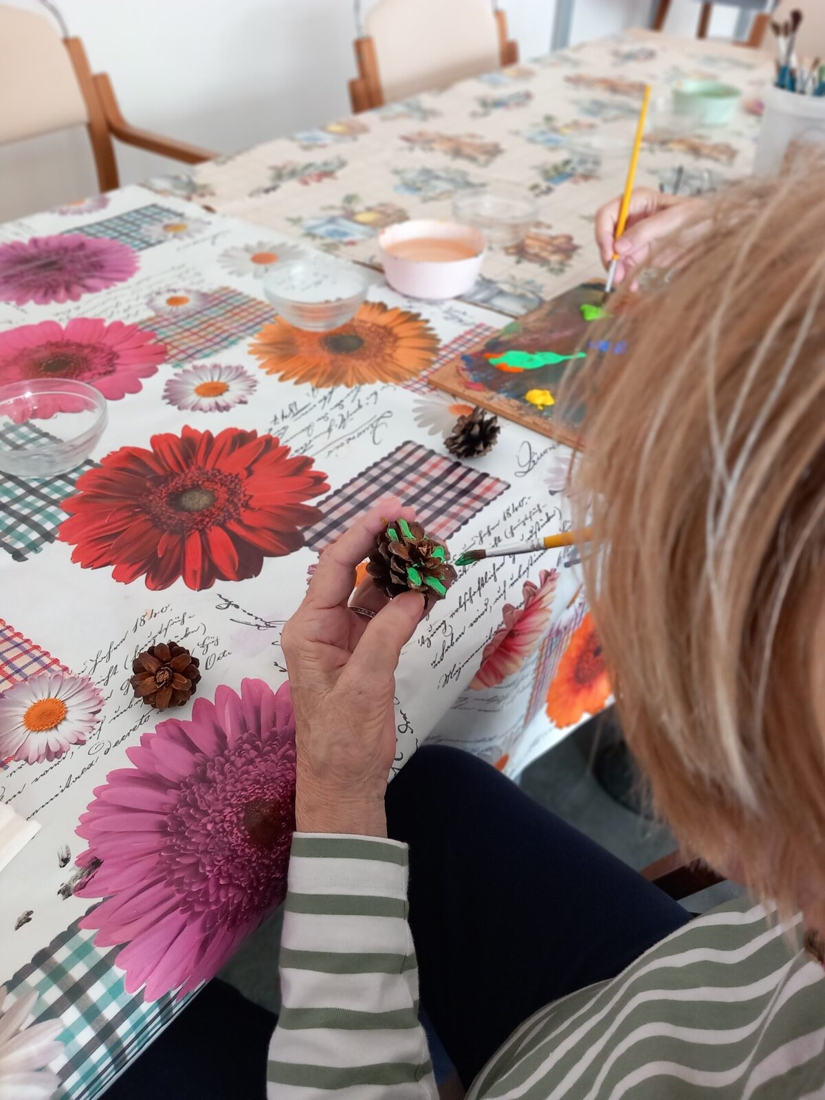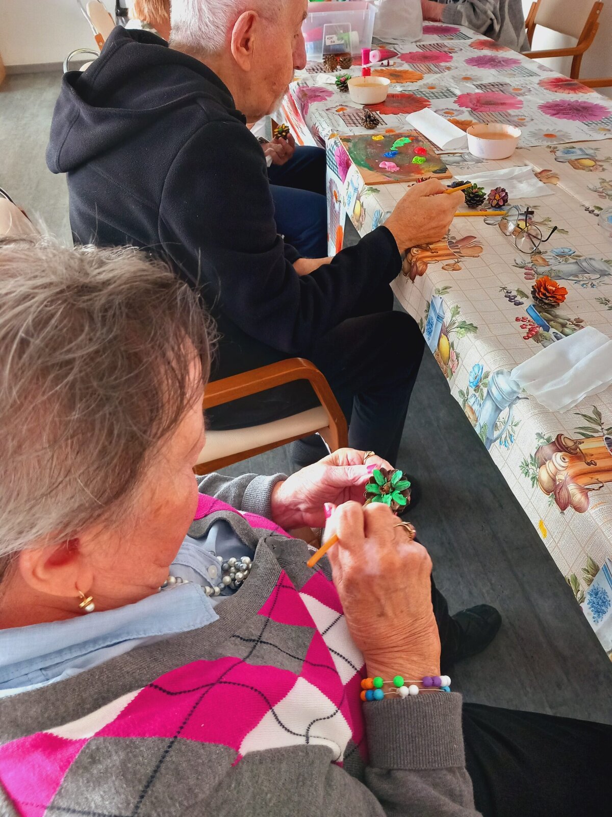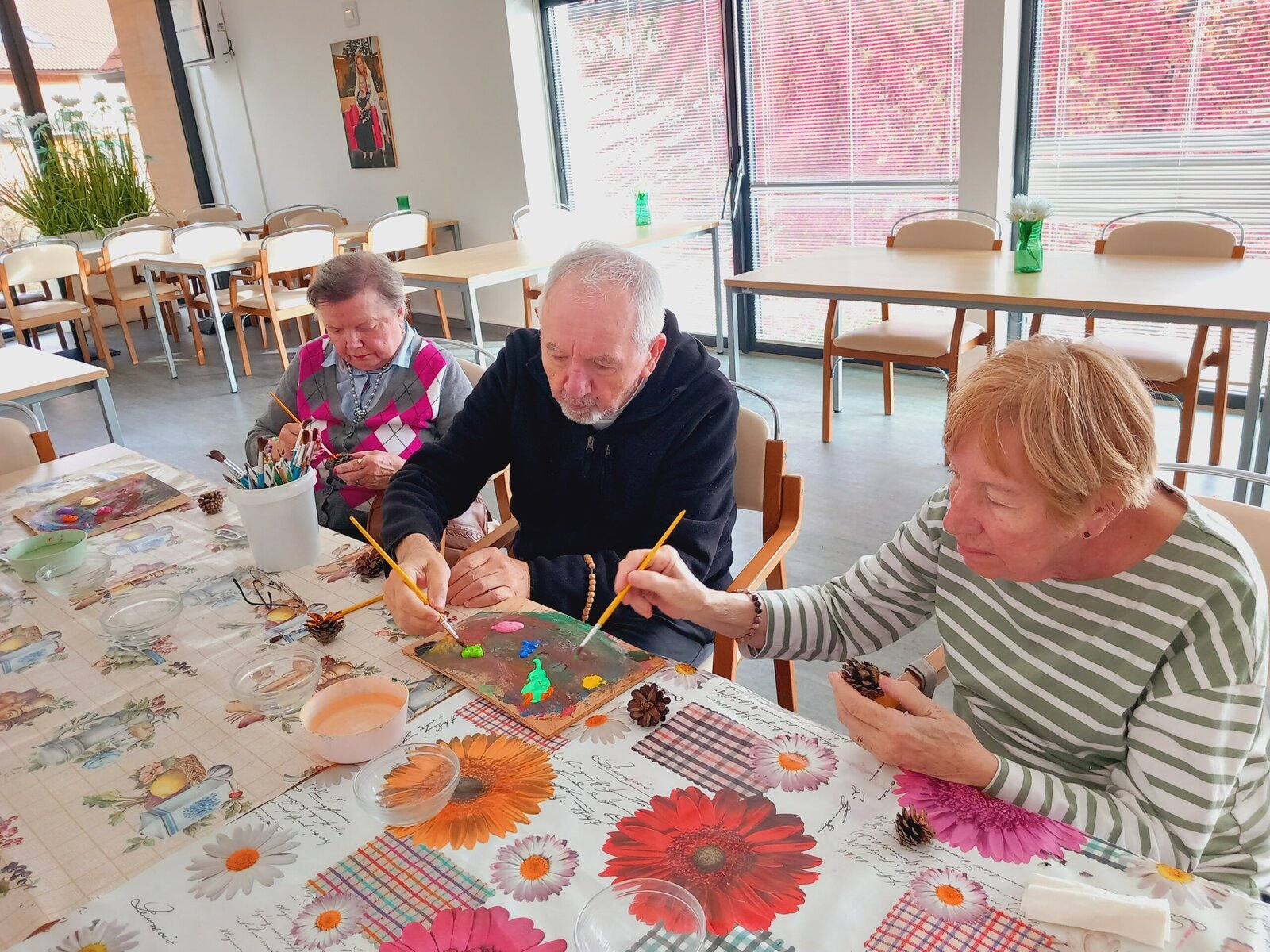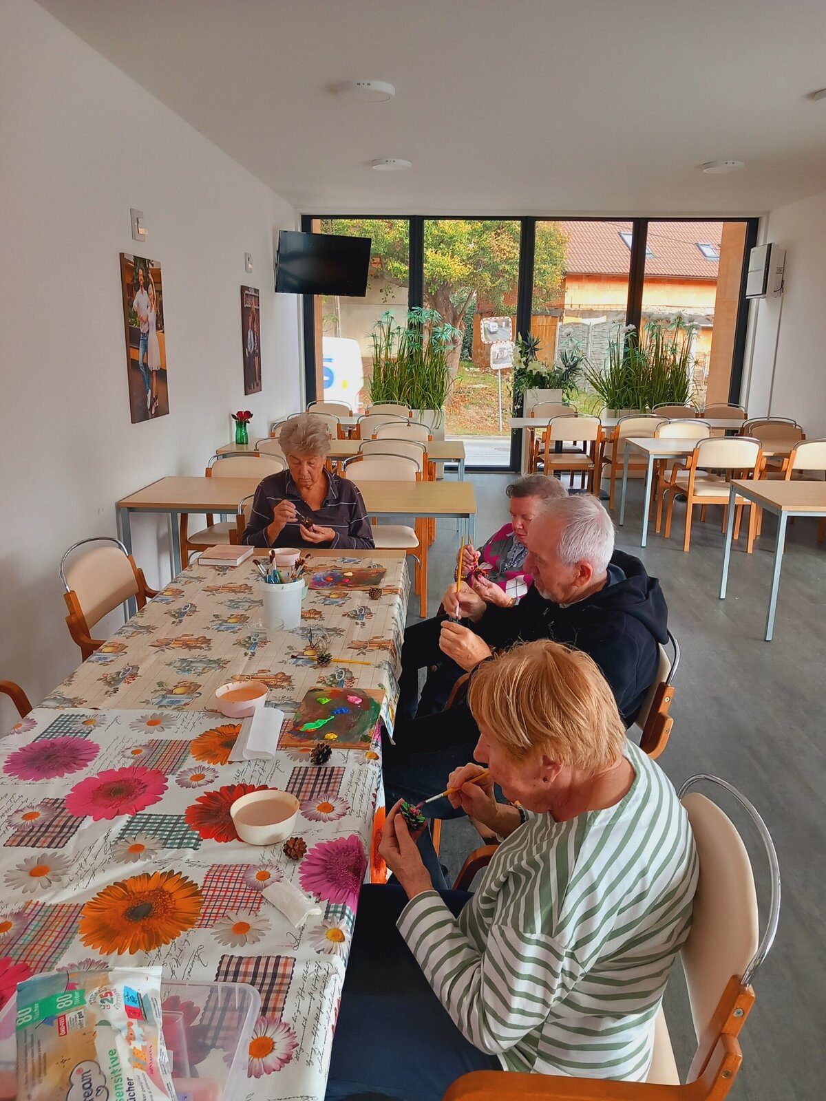 V Senevida Pitkovice jsme malovali na šišky. Z rozpůlených šišek jsme temperami vytvořili barevné květiny. Klienti malovali se zaujetím a podařilo se jim vykouzlit opravdu krásné květiny. Z hotových výrobků vytvoříme obraz pro naše malé přátele z MŠ Křeslice.
