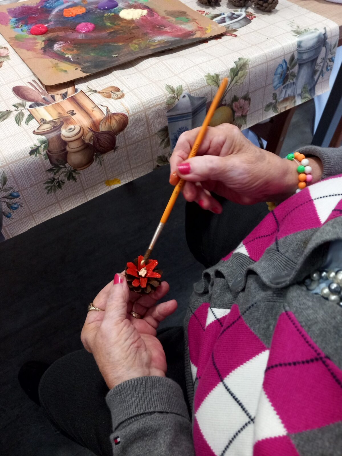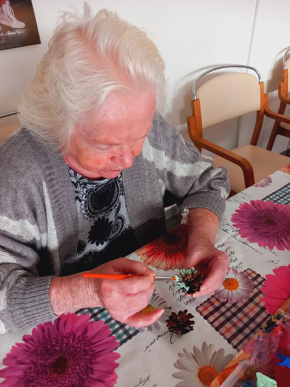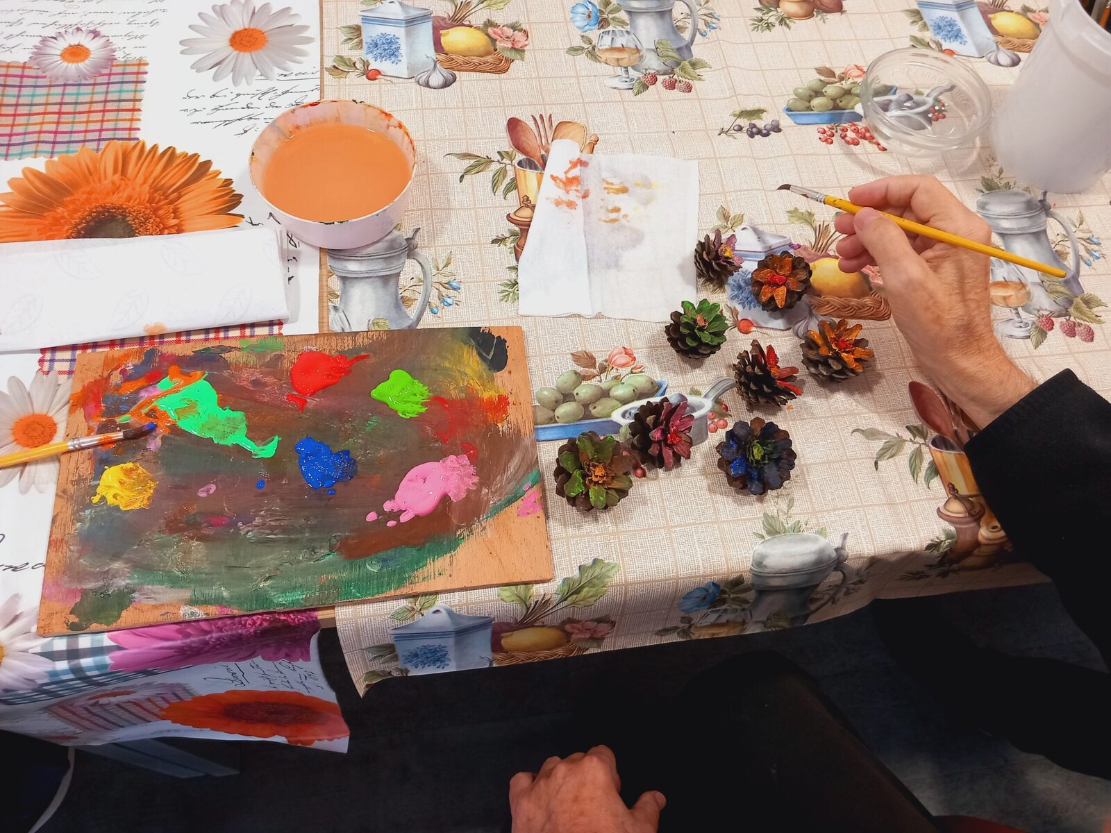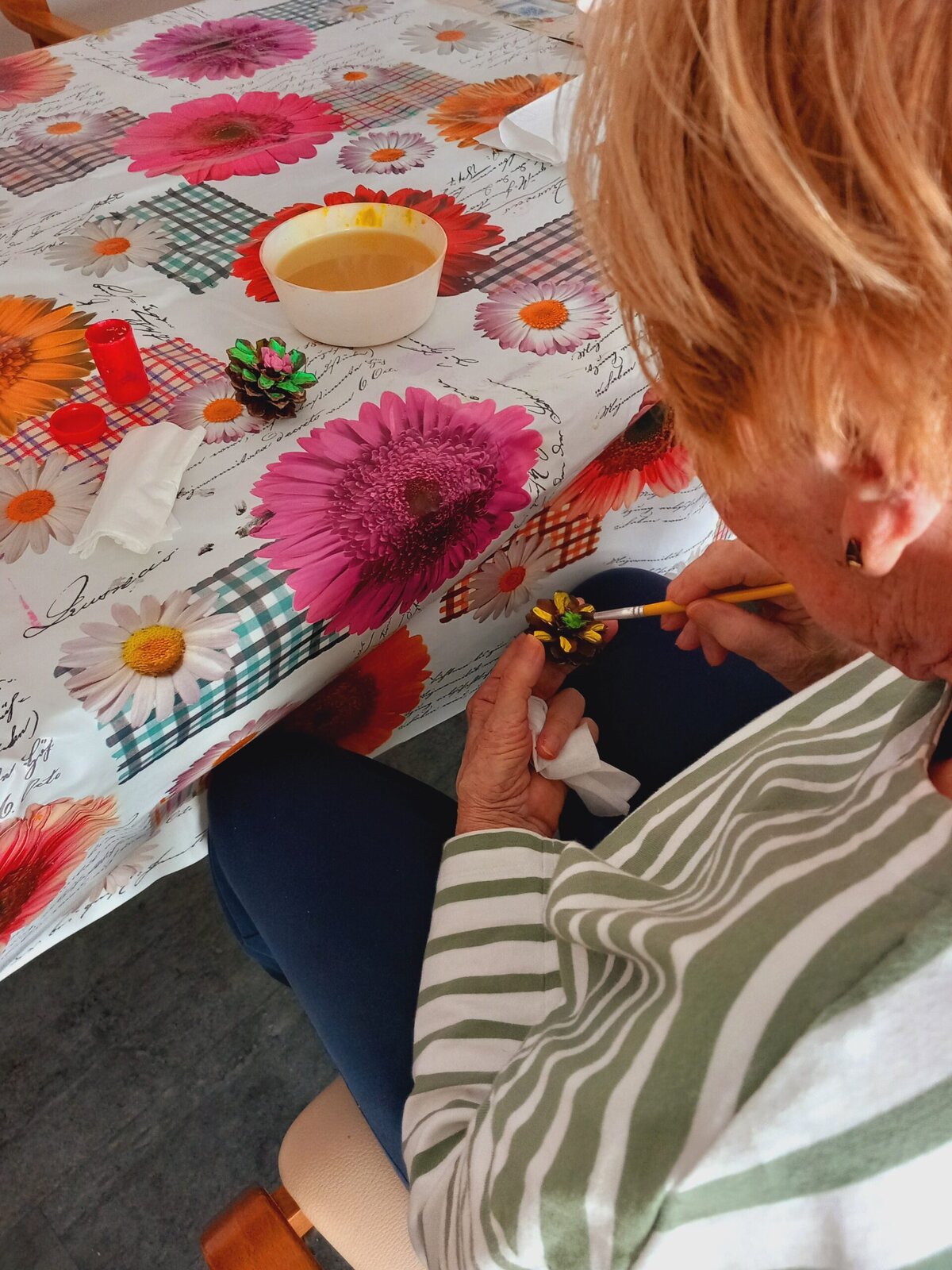 V Senevida Pitkovice jsme malovali na šišky. Z rozpůlených šišek jsme temperami vytvořili barevné květiny. Klienti malovali se zaujetím a podařilo se jim vykouzlit opravdu krásné květiny. Z hotových výrobků vytvoříme obraz pro naše malé přátele z MŠ Křeslice.