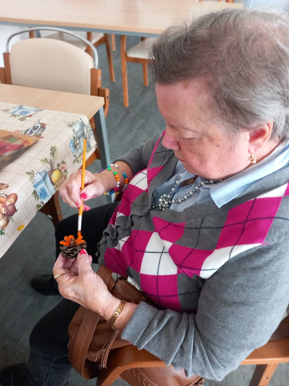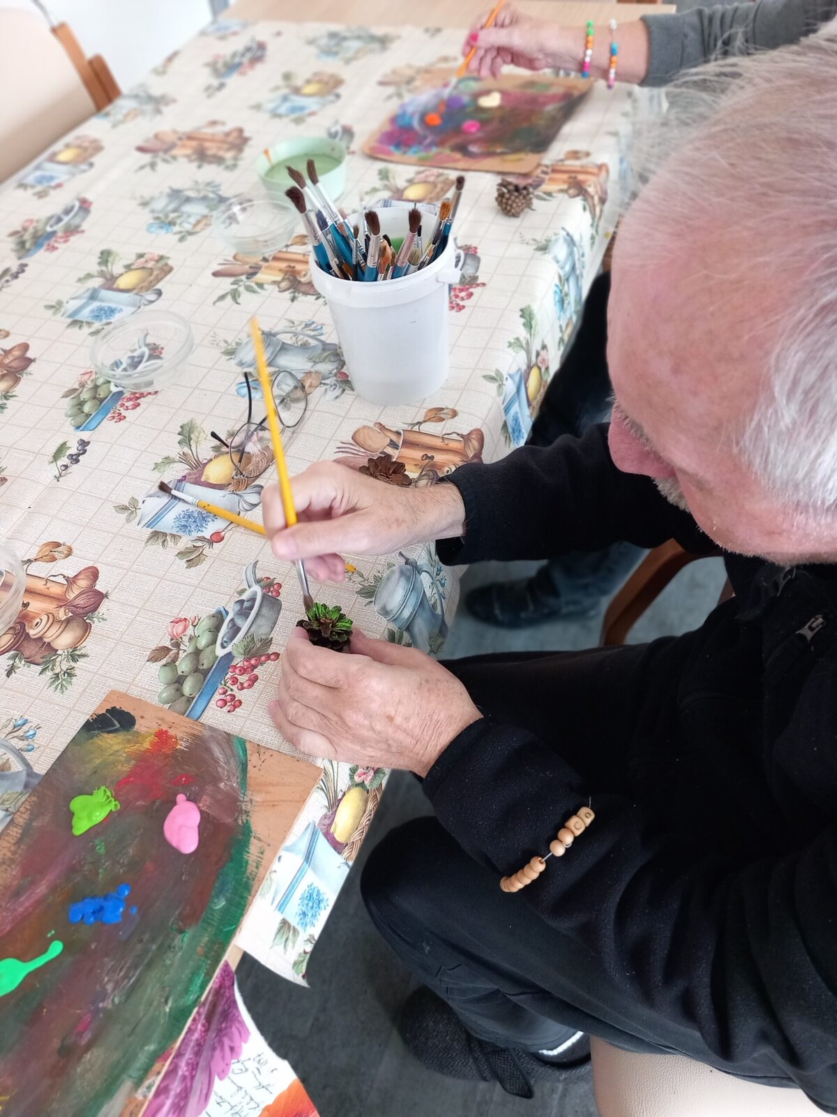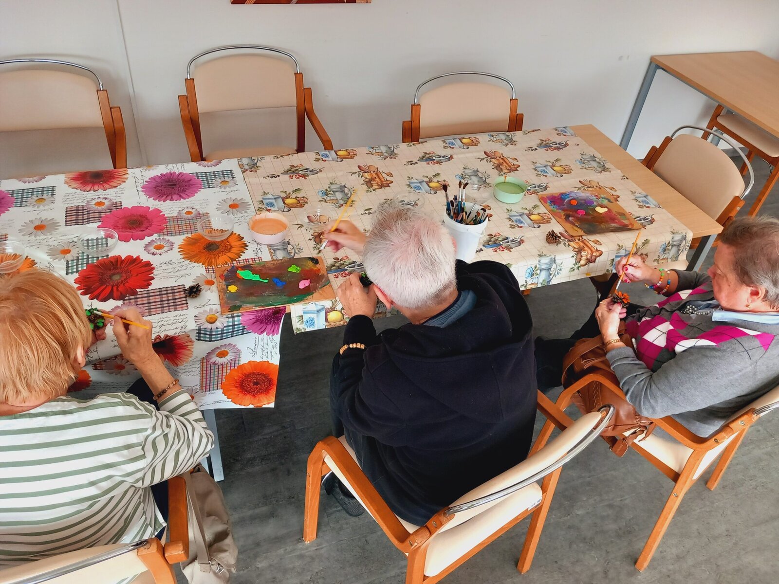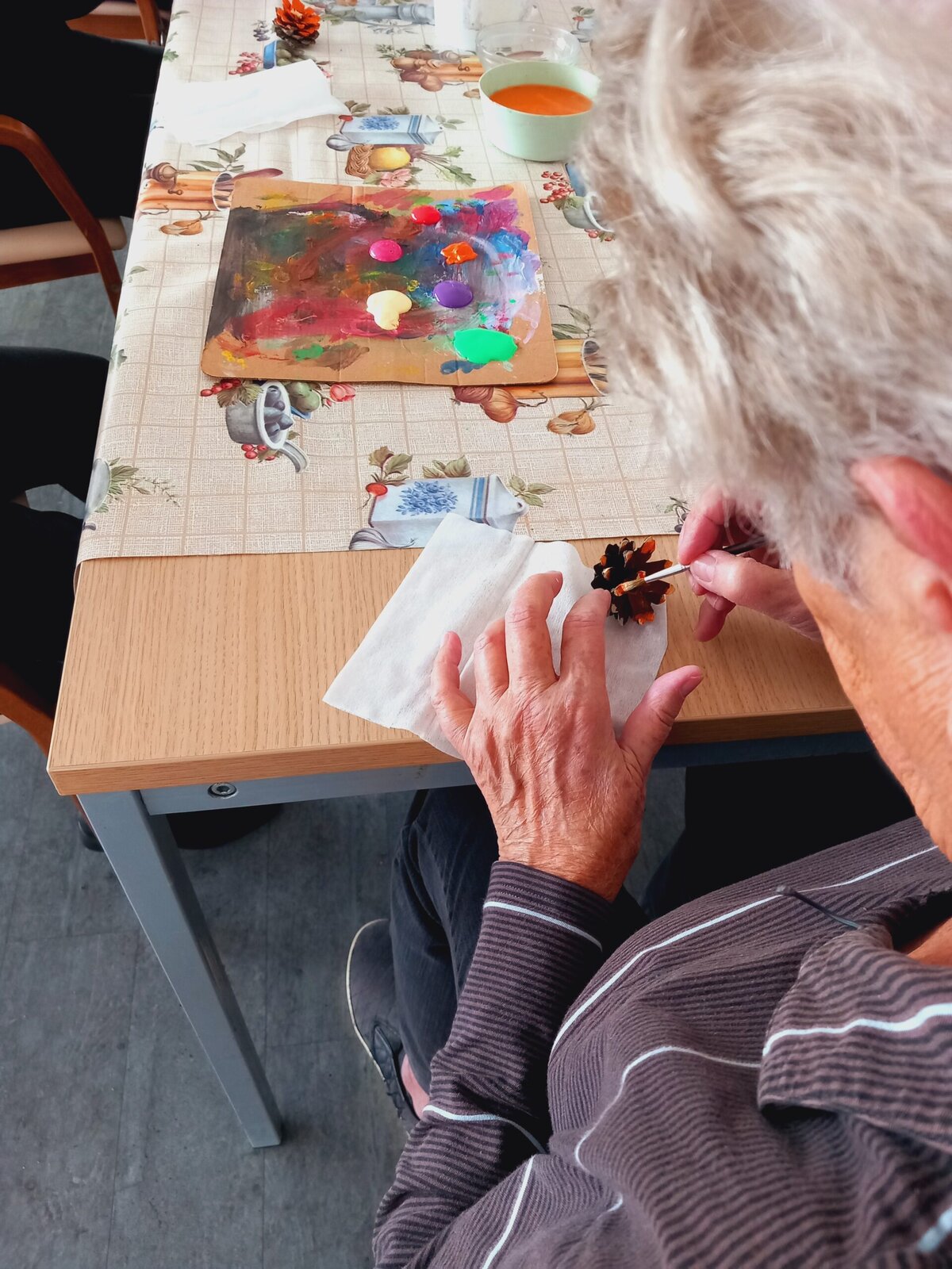 V Senevida Pitkovice jsme malovali na šišky. Z rozpůlených šišek jsme temperami vytvořili barevné květiny. Klienti malovali se zaujetím a podařilo se jim vykouzlit opravdu krásné květiny. Z hotových výrobků vytvoříme obraz pro naše malé přátele z MŠ Křeslice.