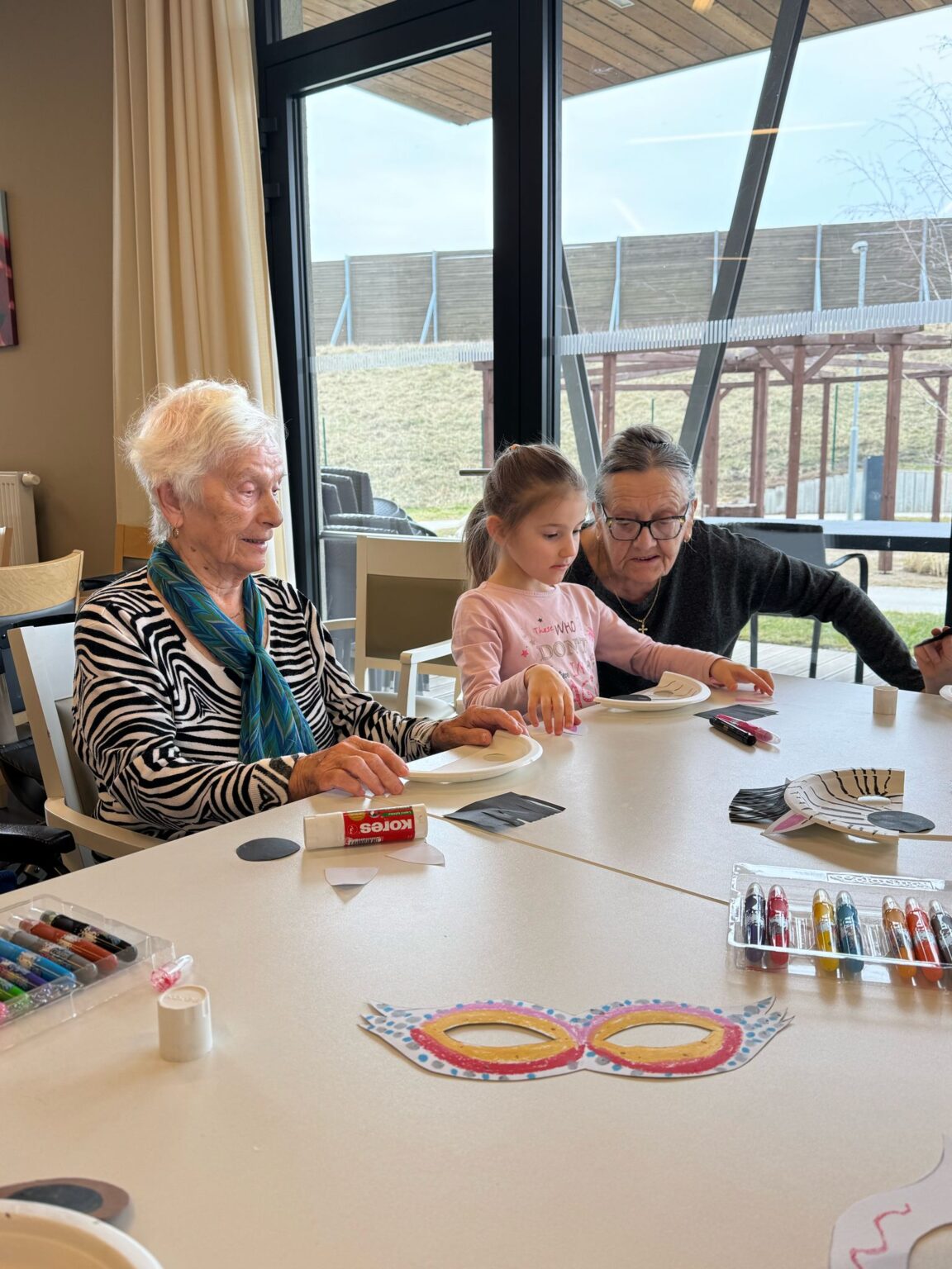 Náš domov navštívily děti z mateřské školky Dolní Měcholupy. Spolupráci zajišťuje organizace „Mezi námi“, propojující generace prostřednictvím různorodých zájmových aktivit. Pod společným vedením jsme vyrobili masky pro Masopustní průvod, kterého se naši klienti zúčastnili během odpoledního programu.