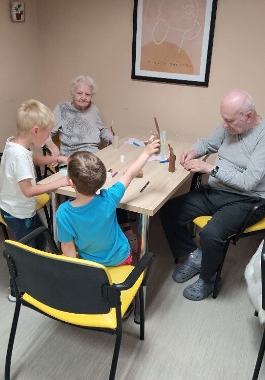 Tento týden nás v ALZEIMER HOME Modřany opět navštívili děti z MŠ EduArt. 👦👧Pod vedením paní Janouškové přinesli opět spoustu dobré nálady, podíleli se na společném tvoření motýlů z papíru.🦋 Z dětské společnosti mají naši klienti velkou radost, tak se těšíme opět na další setkání.🤝❤️