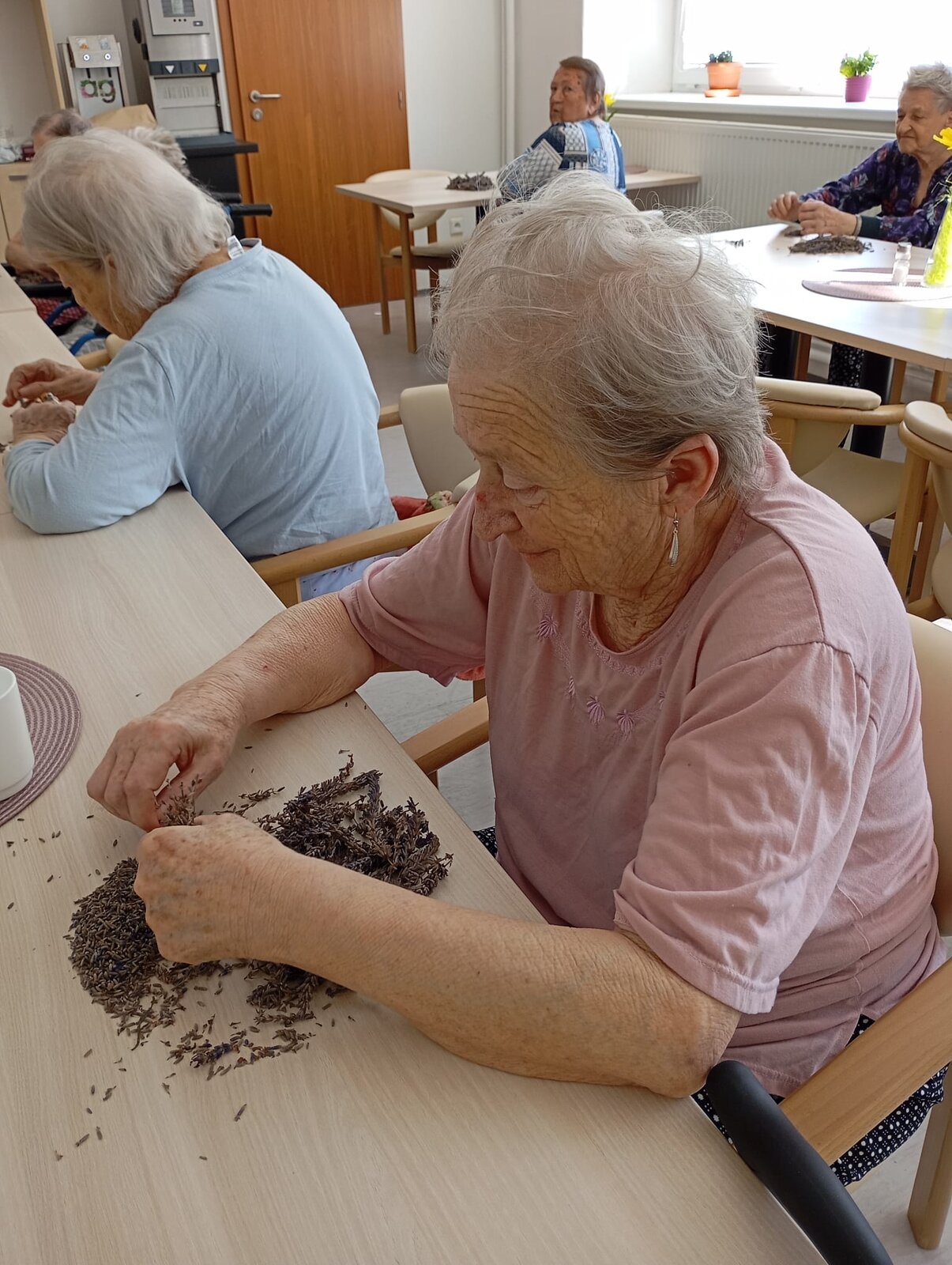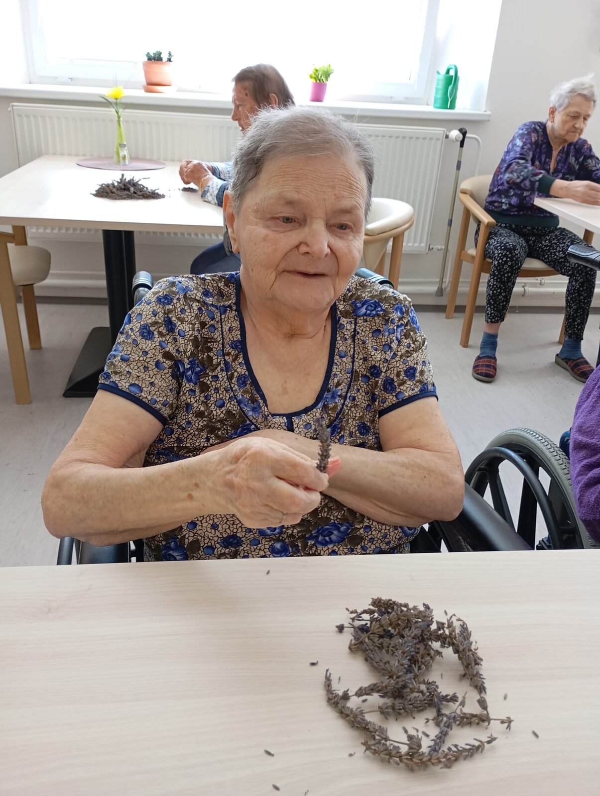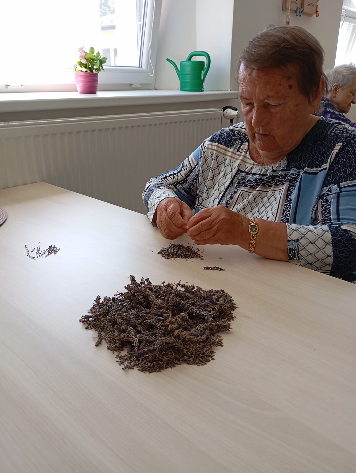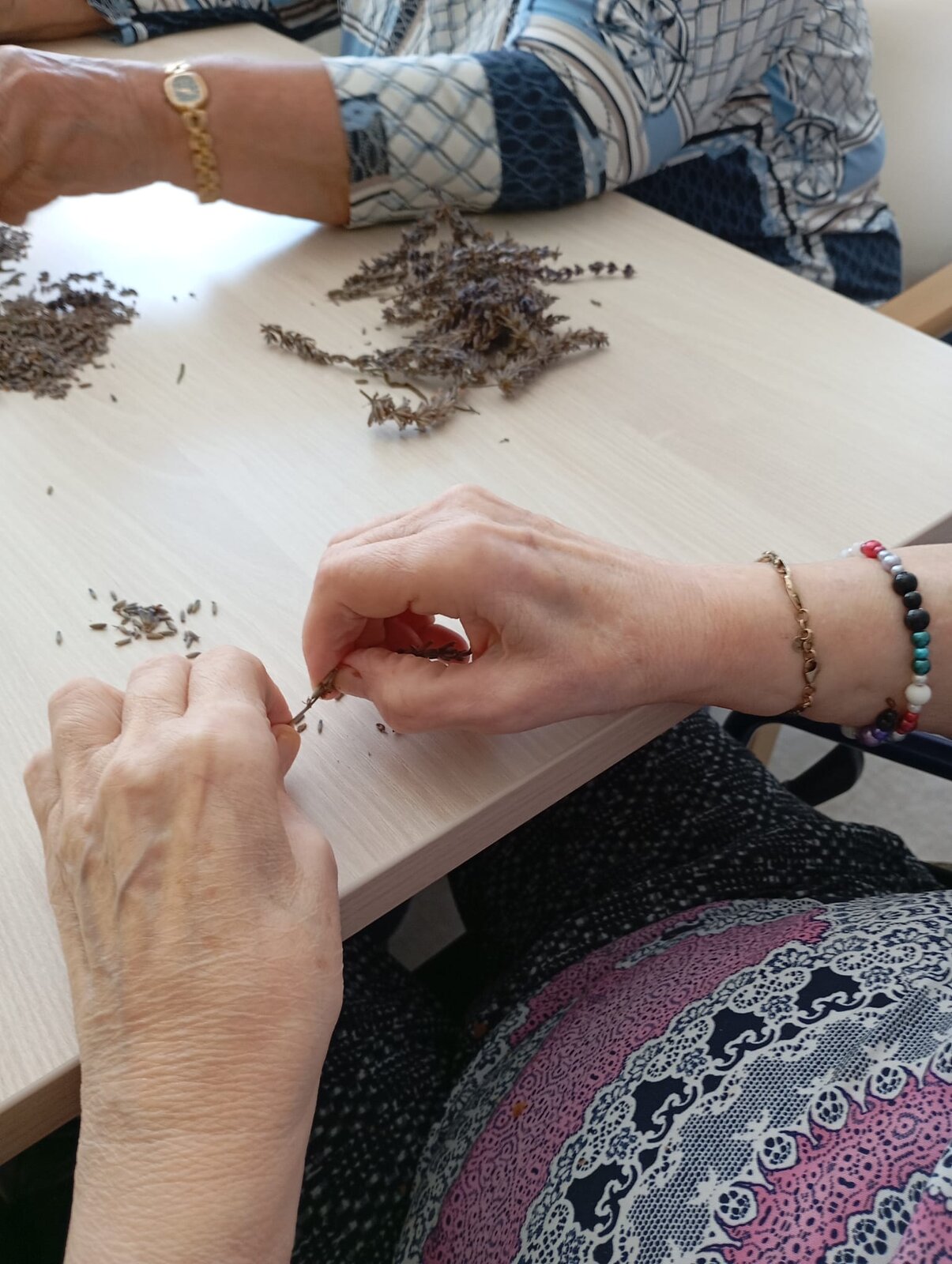 S klienty Senevida Jablunkov společně zpracováváme letošní úrodu levandule. V dalších dnech s ní budeme plnit látkové sáčky, které nám budou připomínat letní čas a provoní náš domov. Celou aktivitu propojujeme se smyslovou stimulací – klienti si užívají vůni, dotek i barvu levandule. Povídáme si o vzpomínkách na zahrádky a při práci si pouštíme písně o květinách.