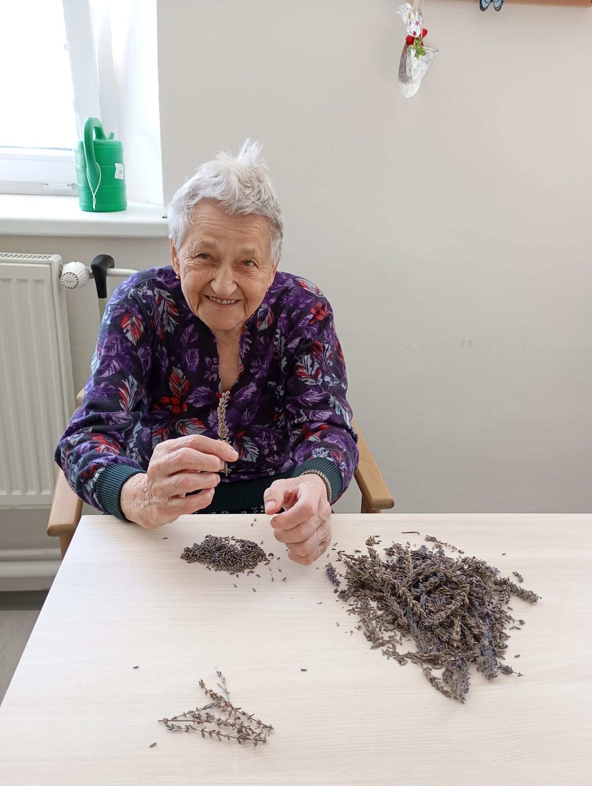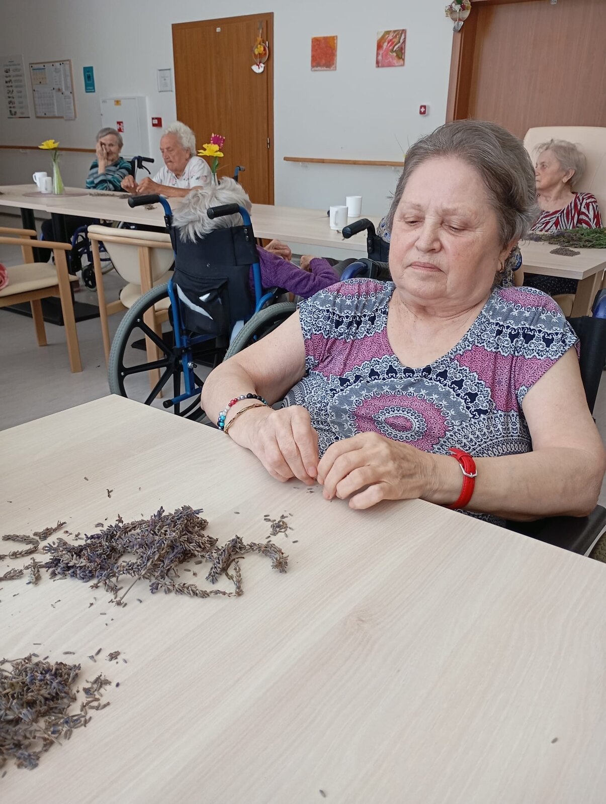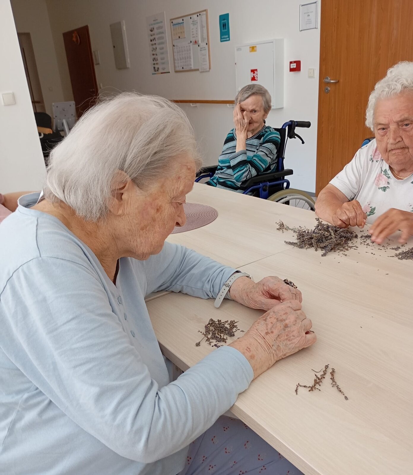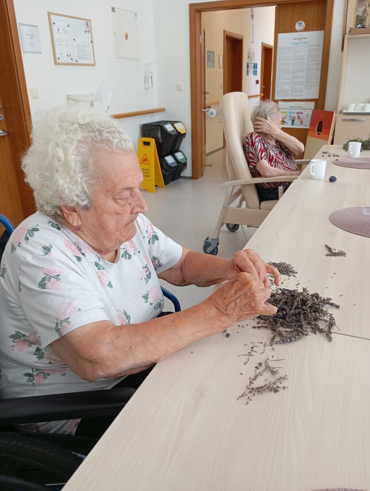 S klienty Senevida Jablunkov společně zpracováváme letošní úrodu levandule. V dalších dnech s ní budeme plnit látkové sáčky, které nám budou připomínat letní čas a provoní náš domov. Celou aktivitu propojujeme se smyslovou stimulací – klienti si užívají vůni, dotek i barvu levandule. Povídáme si o vzpomínkách na zahrádky a při práci si pouštíme písně o květinách.