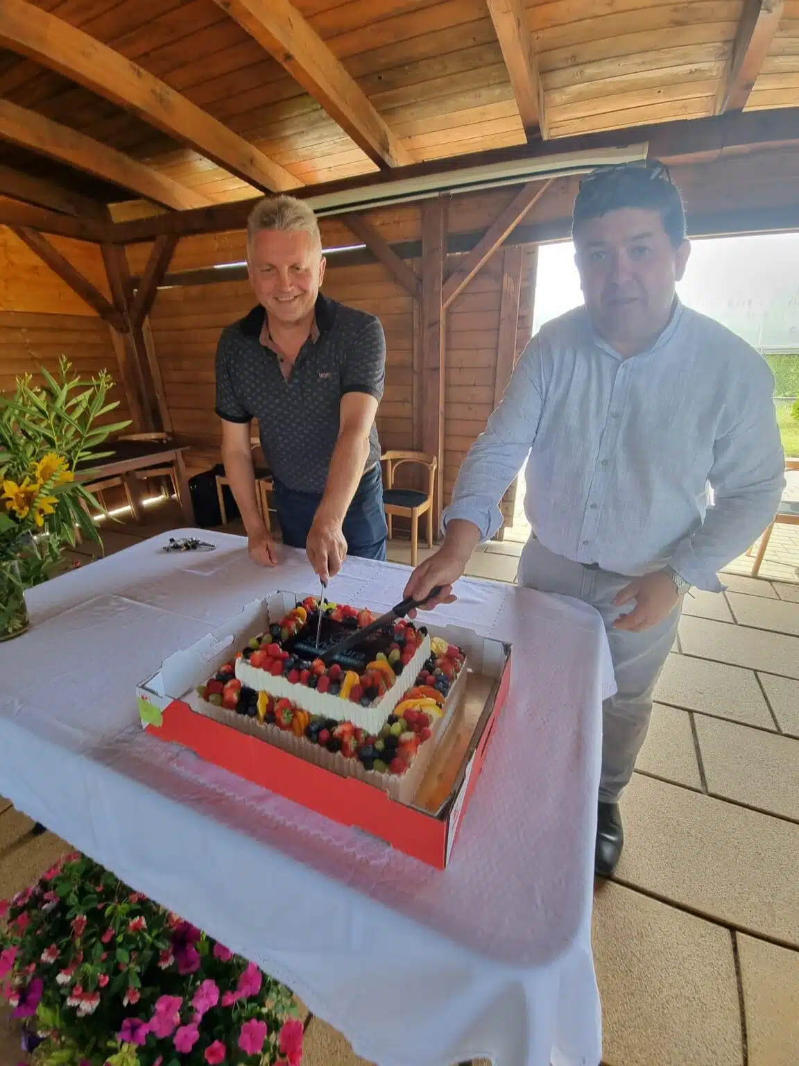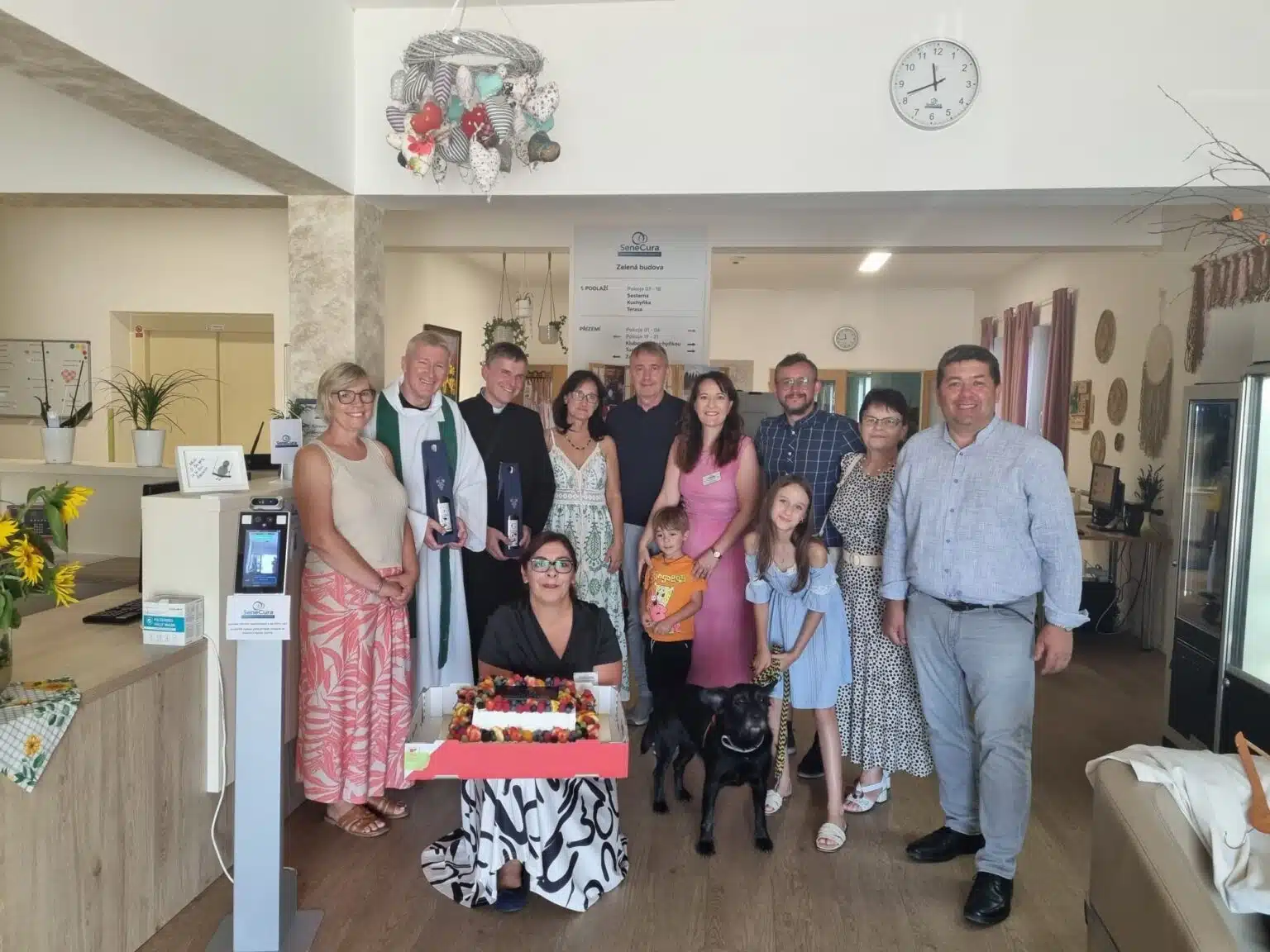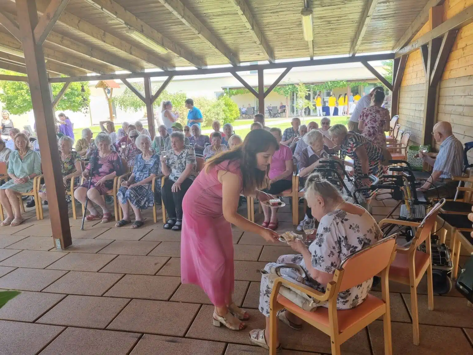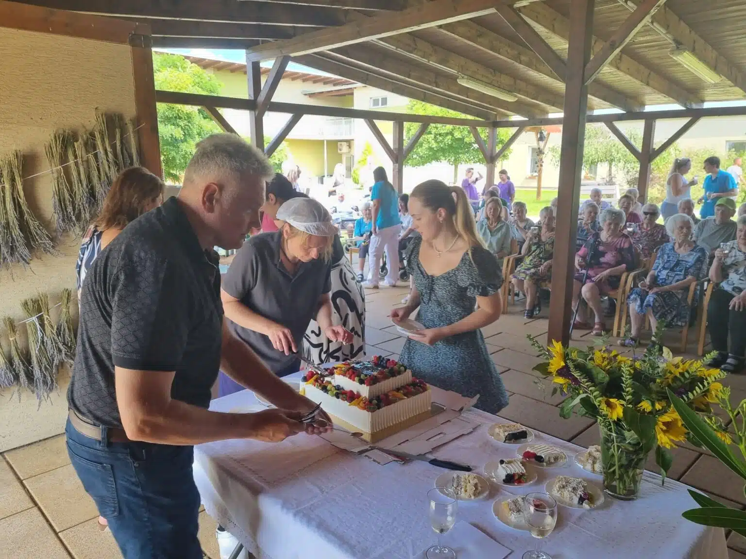 Ve 14:00 zaznělo slavnostní poděkování ředitele Domova pana Michala Veleby a starosty obce pana Petra Škarka, poté po poděkování vedoucí sociální pracovnice paní Jany Tesařové a vrchní sestry paní Lucie Ficové došlo k očekávanému rozkrojení obrovského dortu, o který se podělili všichni přítomni klienti, rodiny a zaměstnanci, kteří se přišli podívat. O občerstvení se postaral tým šéfkuchařky Domova paní Jany Gazdové za přispění manažera stravování Senevida pana Tomáše Pondělíčka, o dobrou náladu se postaral tradičně harmonikář pan Žídek.