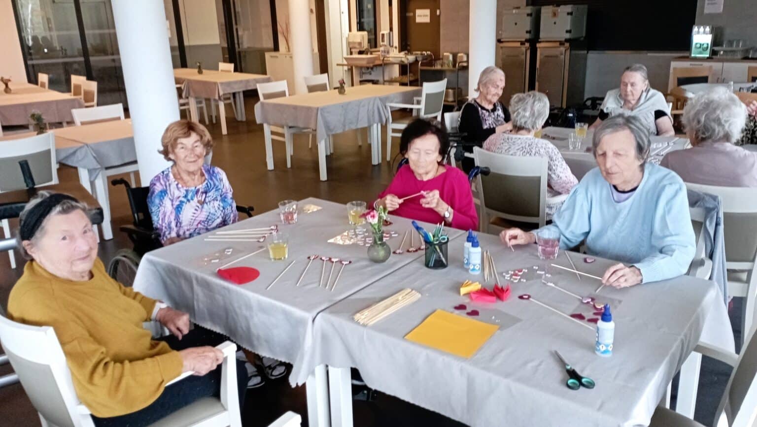 Začali jsme zvelebováním našeho domova. Ve společné jídelně, kde je dostatek prostoru a světla, jsme se sešli na kreativní tvoření.