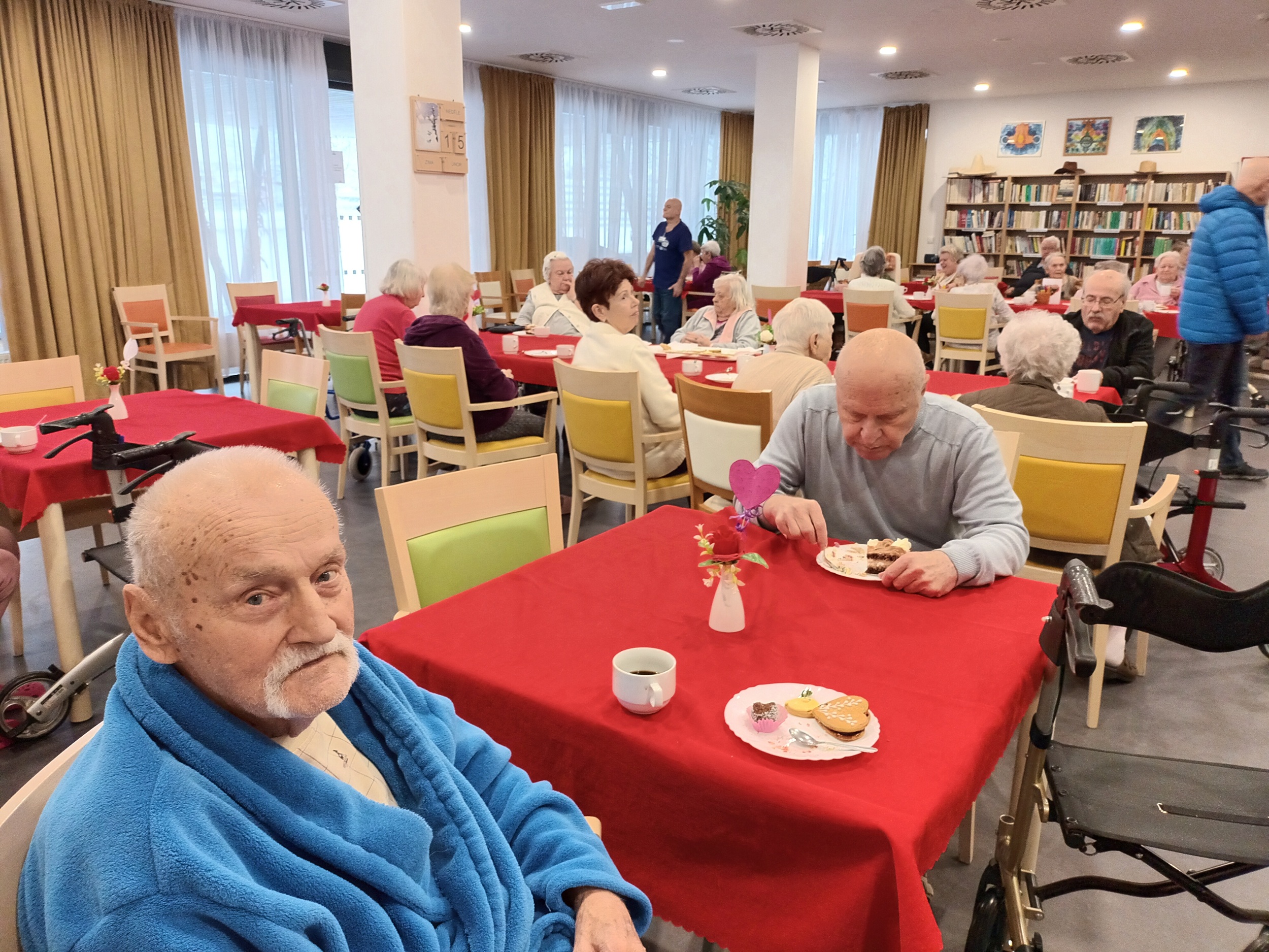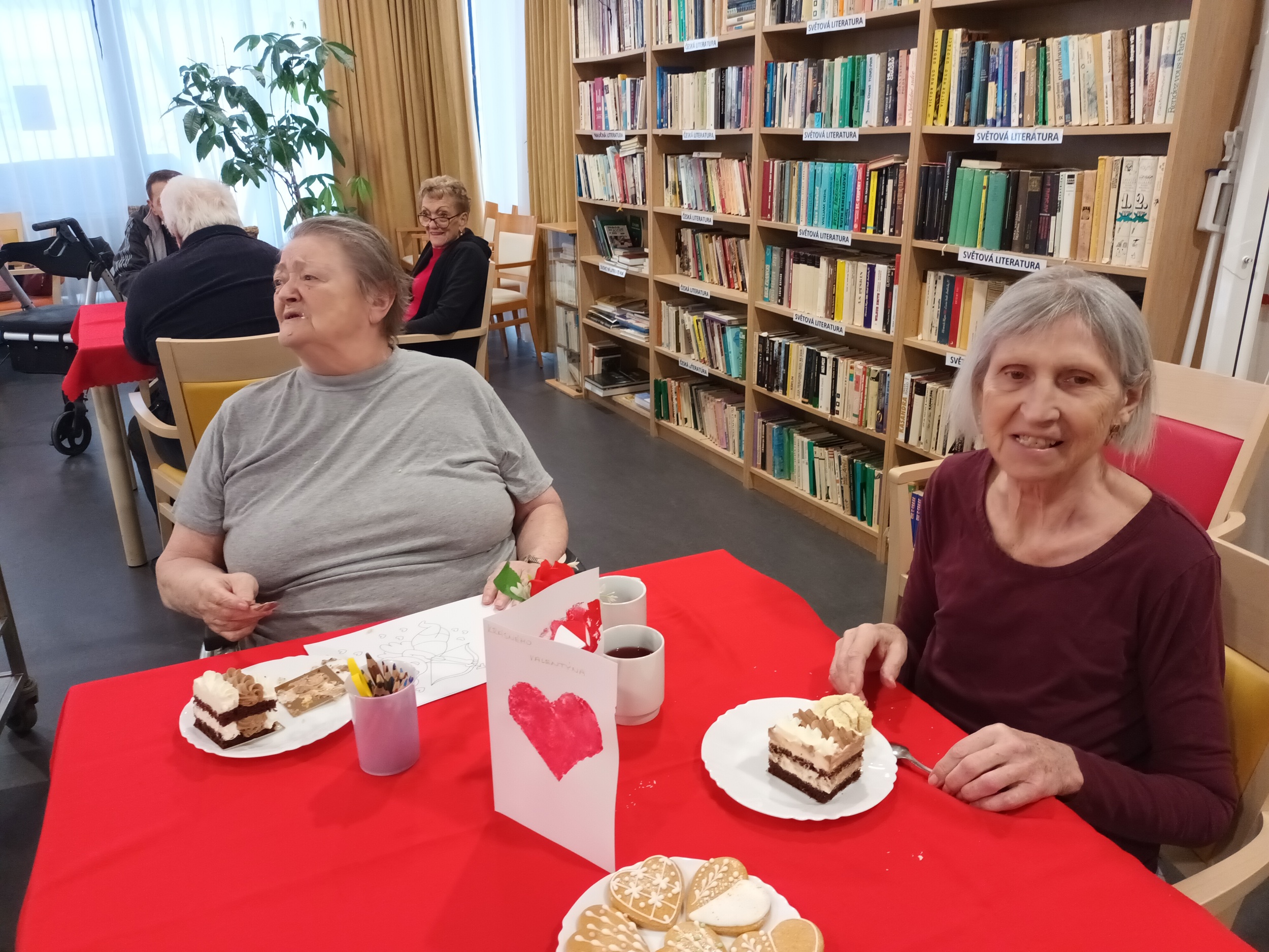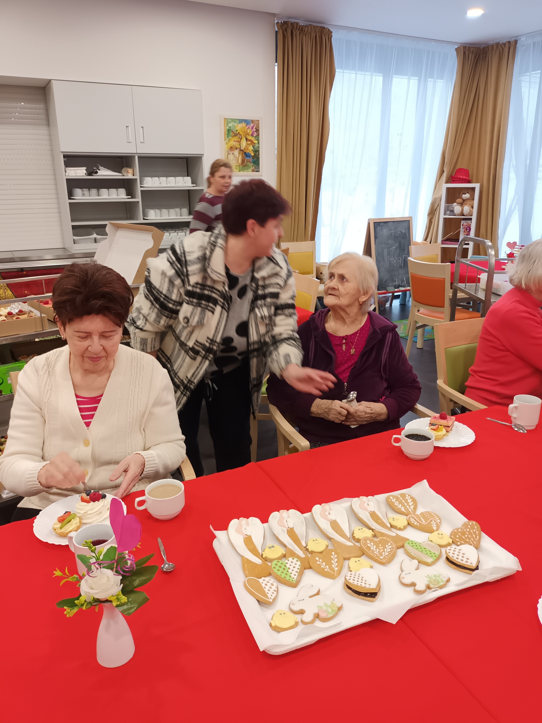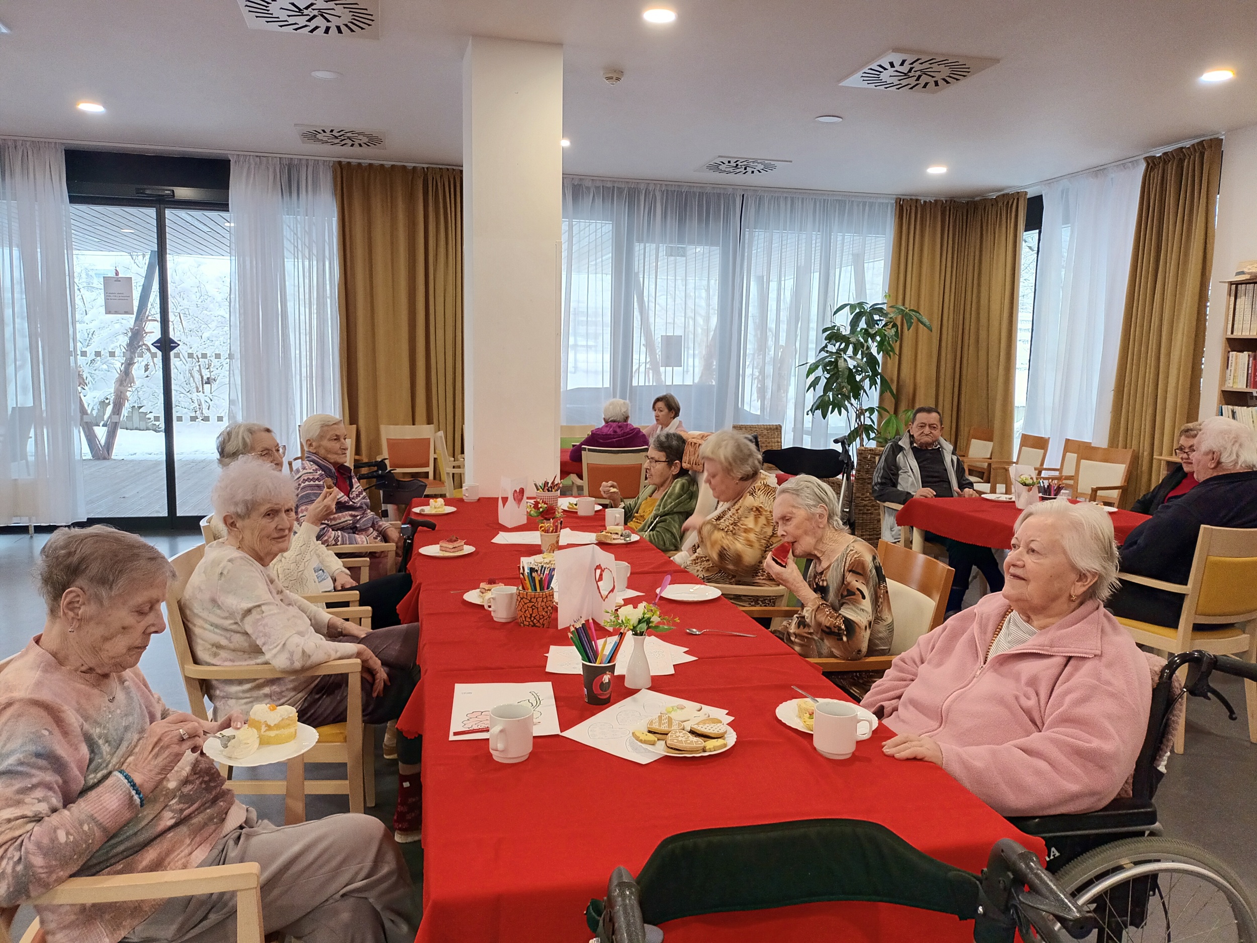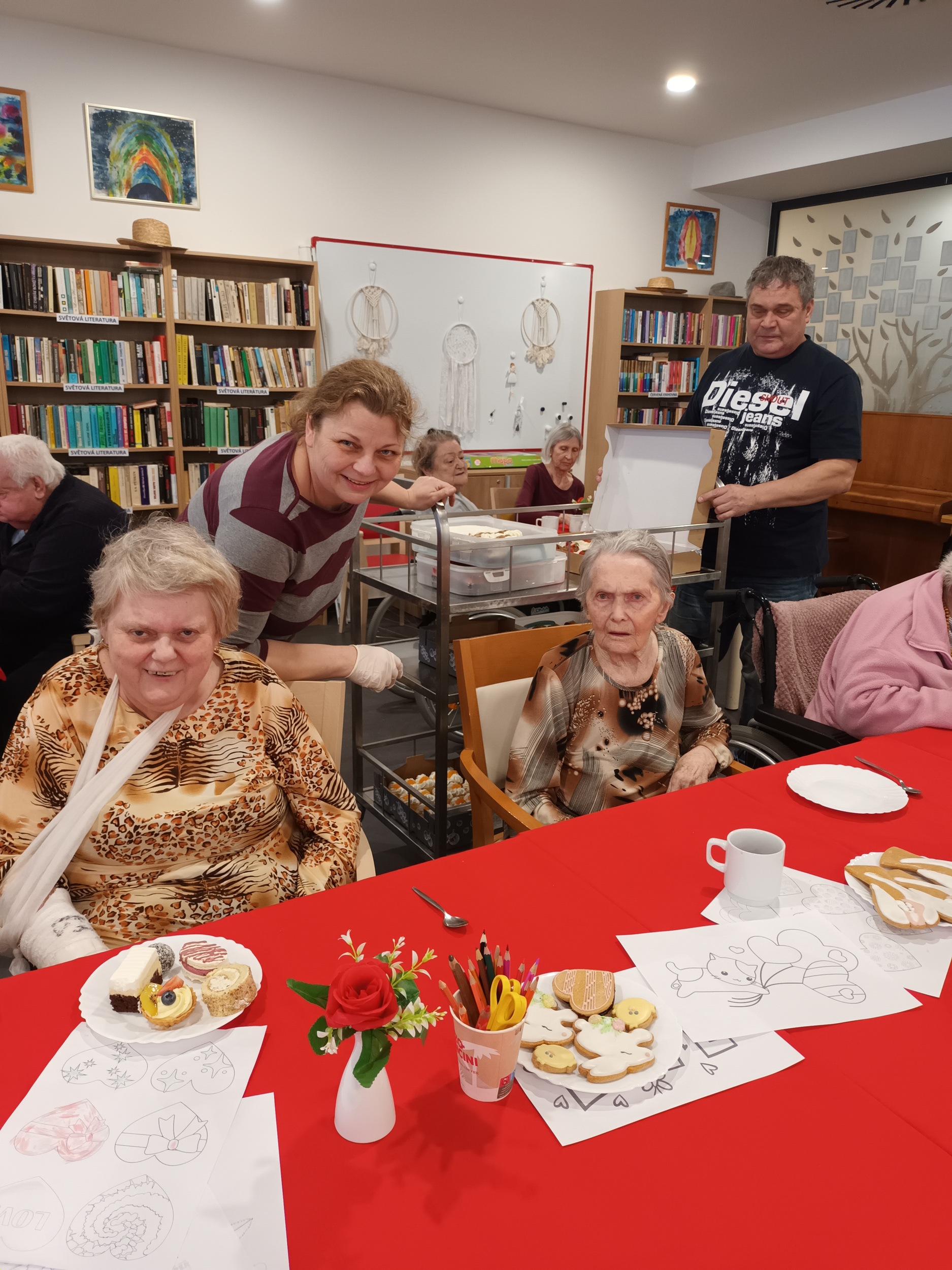 Návštěva cukrářek byla sladkou tečkou za aktivitami s valentýnským tématem, které naše klienty provázely celý předcházející týden. V rámci tvoření a kreslení vyráběli klienti dekorace s motivem srdce a vybarvovali tematické omalovánky. V neděli pak naší hlavní jídelnou zněly zamilované písně a klienti si rovněž mohli poslechnout povídání o lásce a jejím patronovi, svatém Valentýnovi.