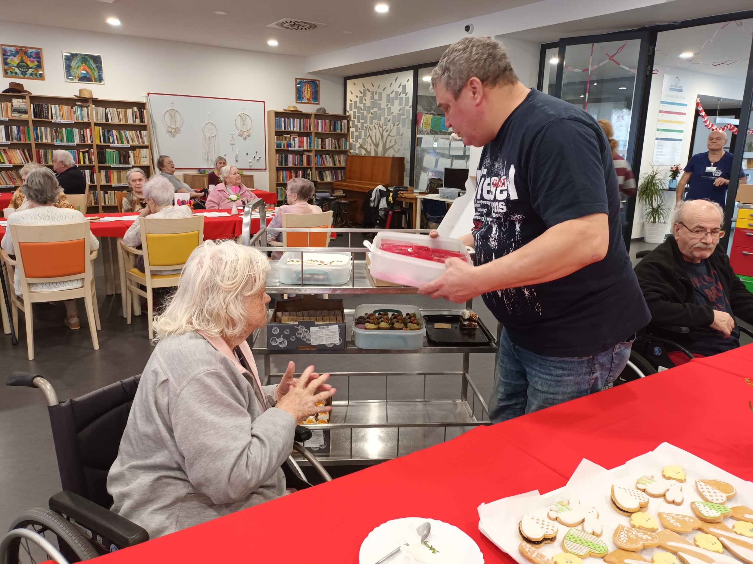 Pro nás letos pekla paní Lalinská, která k nám přišla i s manželem, dobroty připravovala také paní Václavíková, paní Vejražková a paní Šejvlová. Všem touto cestou posíláme velké poděkování a pochvalu za jejich laskavost, lidskost, a také skvěle odvedenou práci. Jejich zákusky a perníčky byly nejen nesmírně chutné, ale také krásně a precizně provedené. Po akci jsme od našich klientů slyšeli jen samou chválu. Jedna z klientek se svěřila, že v cukrárně nebyla snad padesát let, my jsme ji tak mohli cukrárnu dopřát přímo v našem domově.