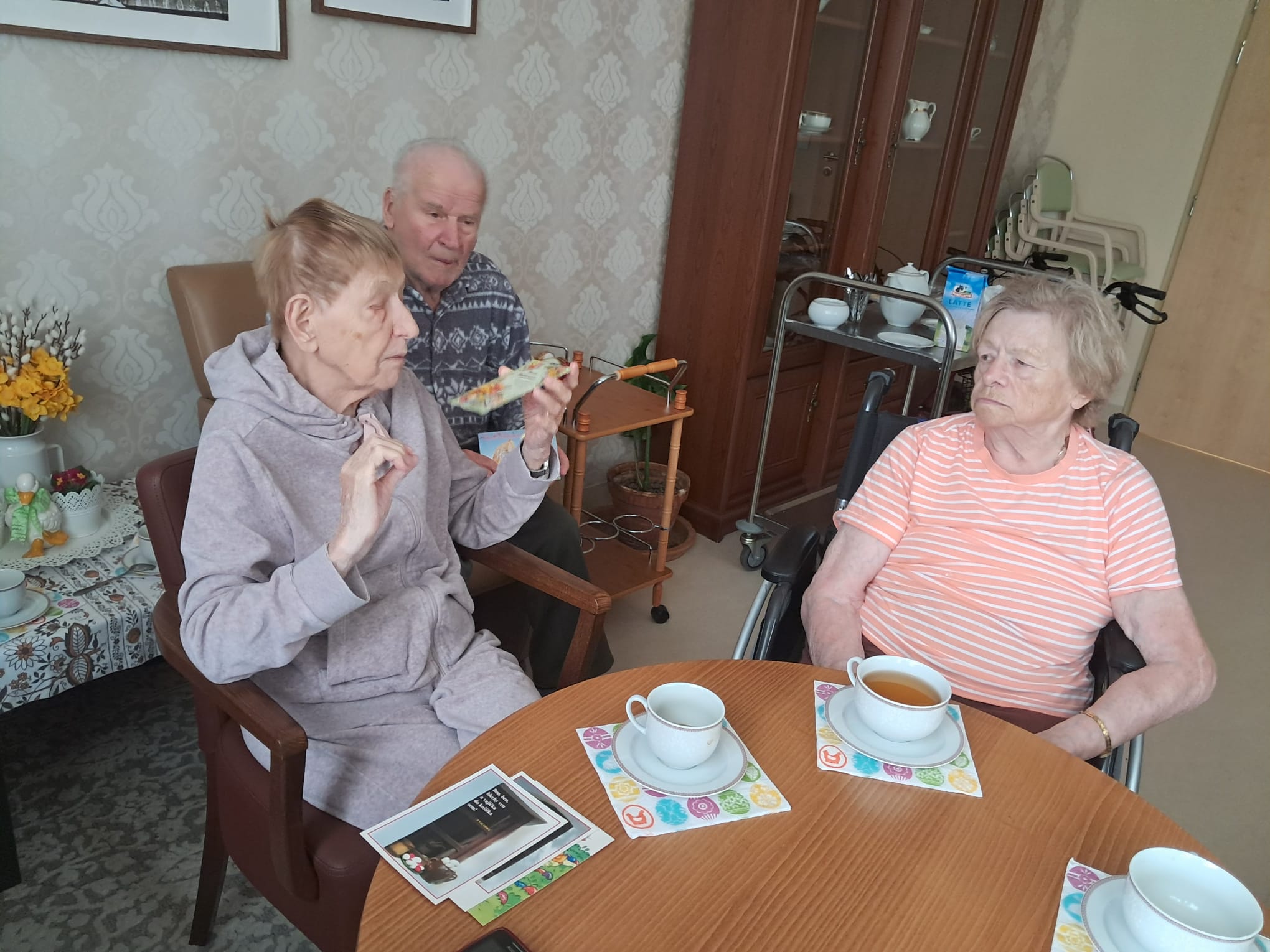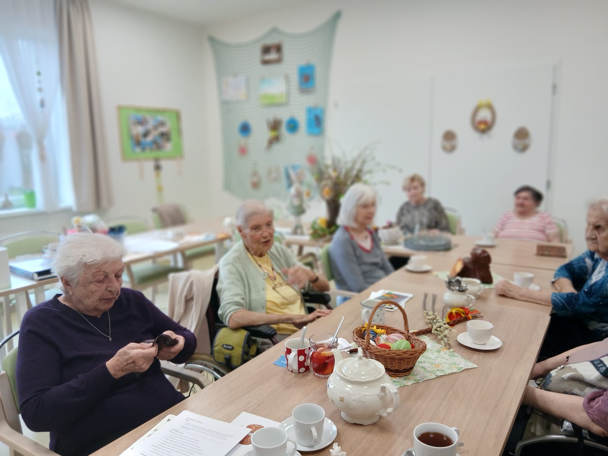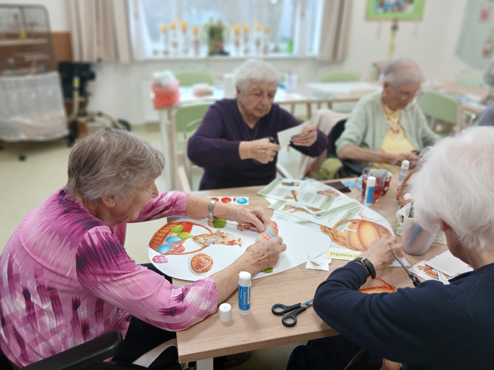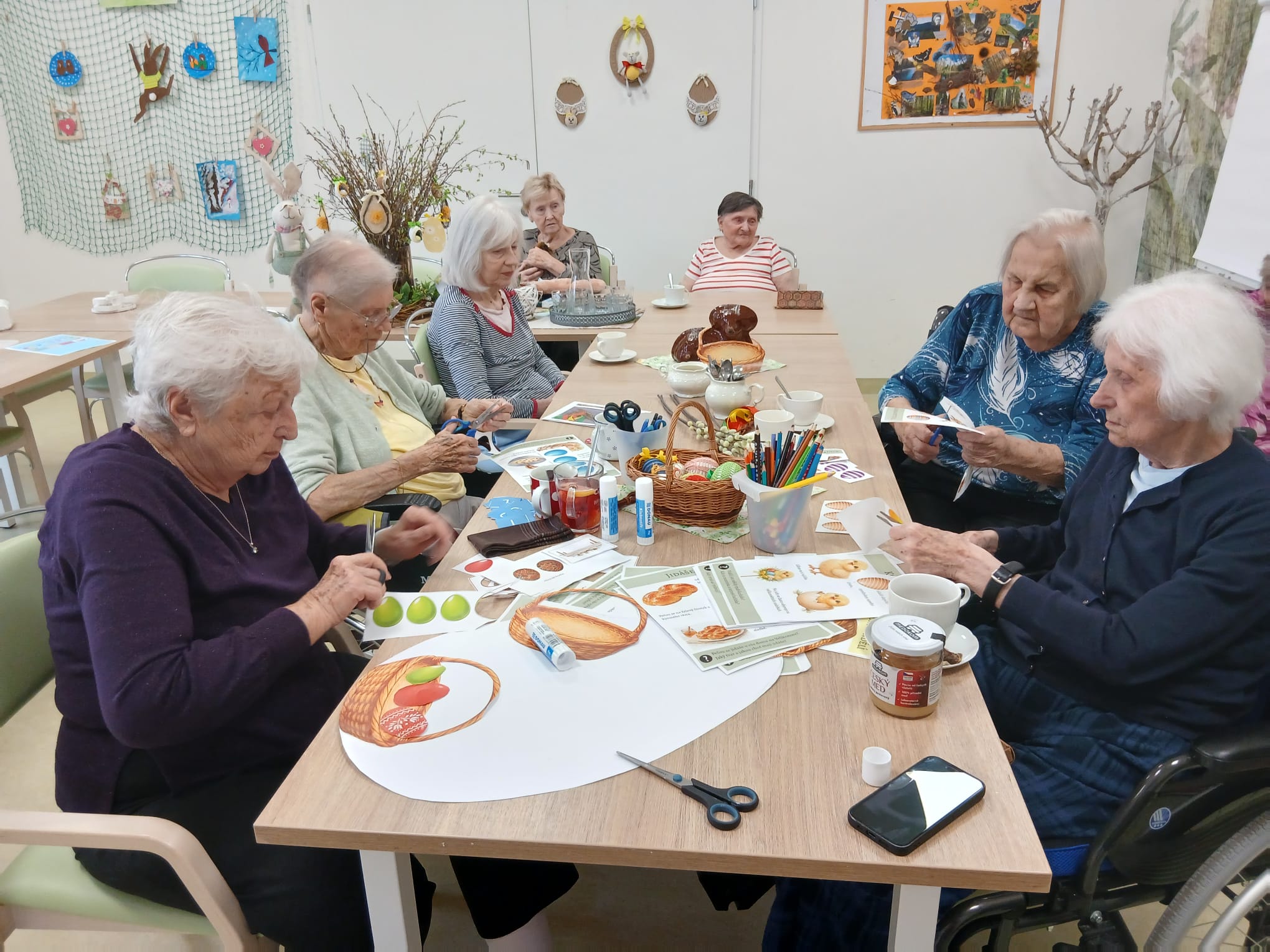 Povídali jsme si o malování vajíček, pletení pomlázek i o koledování. Každý přidal svou vzpomínku a společně jsme si připomněli, jak krásné tyto svátky vždy byly. Nakonec jsme vytvořili velikonoční koláž.