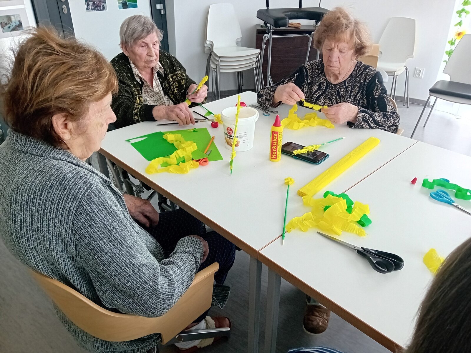 Je po Velikonocích, tak jsme v ALZHEIMERHOME SLAVKOV vyráběli nové dekorace. Volba padla na zlatý déšť a pampelišky. U stříhání a lepení si klienti procvičili jemnou motoriku rukou. S výsledkem jsme spokojení. Už jsme s kytičkou vyzdobili jídelnu.