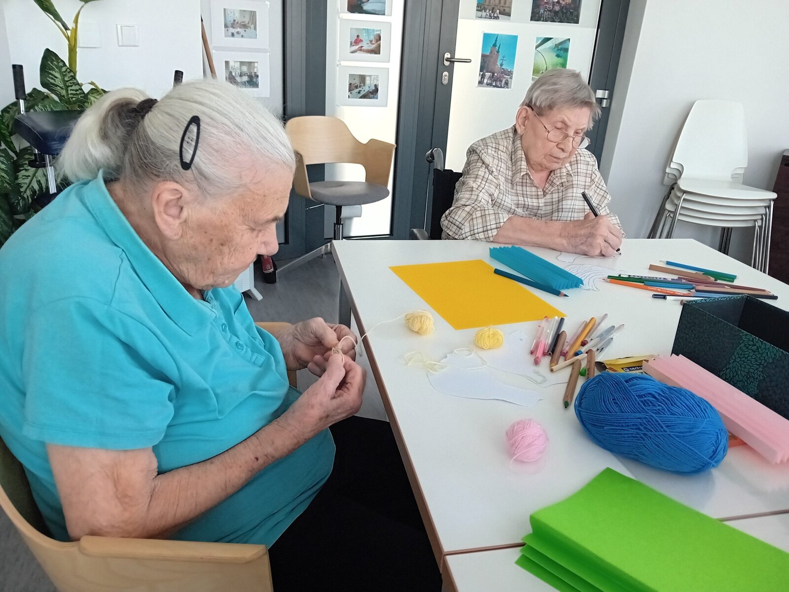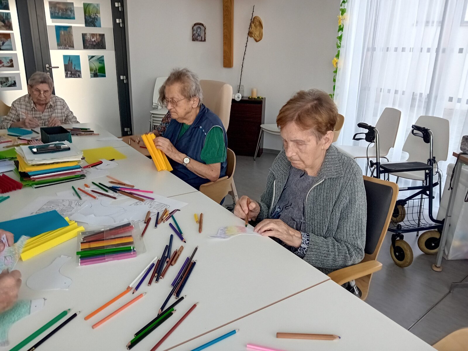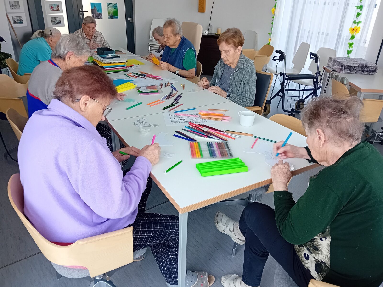 Čtvrteční dopoledne se neslo v duchu tvořivosti. Abychom s klienty aktivně přívítali jaro nejen při pobytu na zahradě, sešli jsme se tentokrát v naší společenské místosti při výrobě barevných ptáčků, které nám opět budou zdobit naše společné prostory v Senevida Slavkov u Brna.