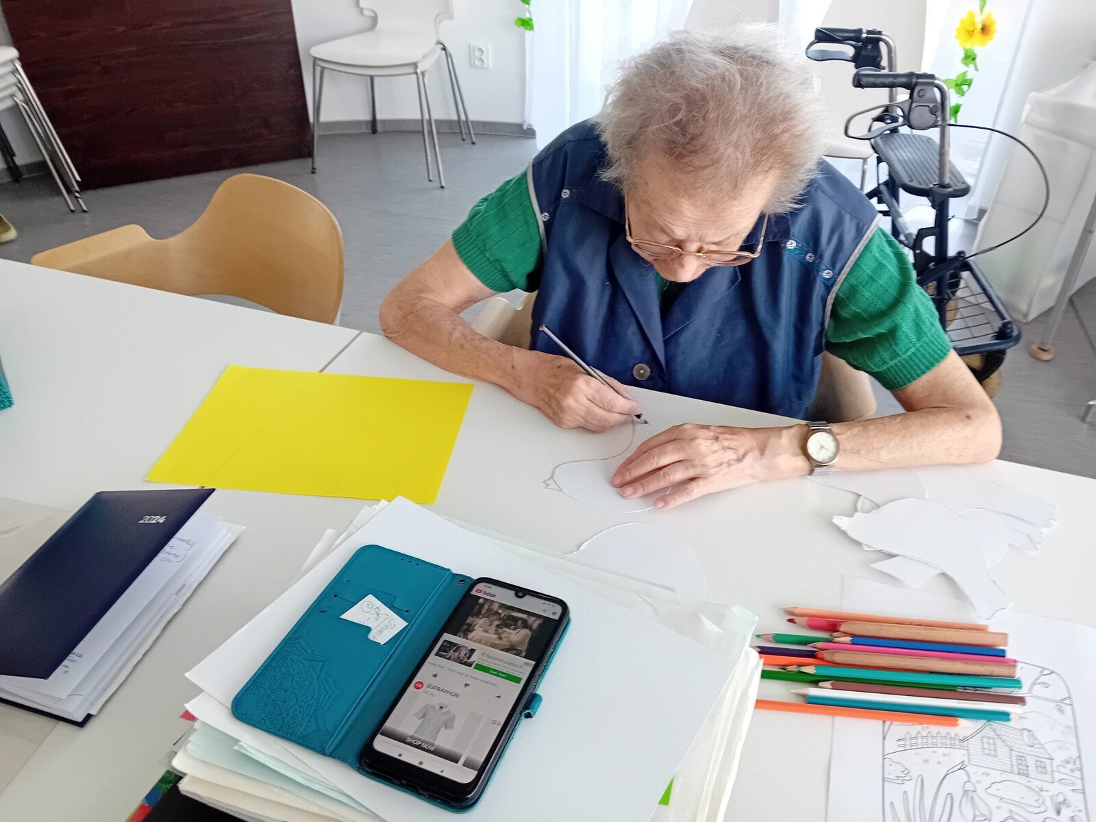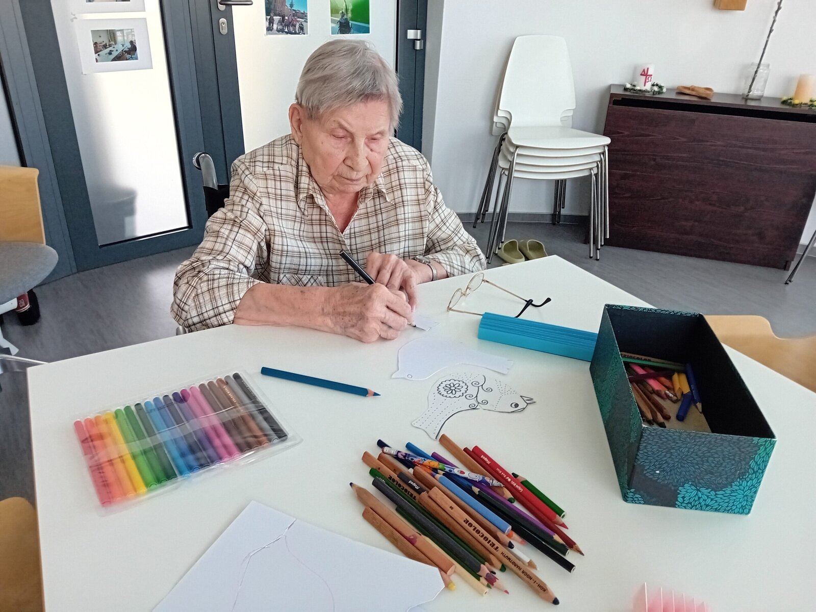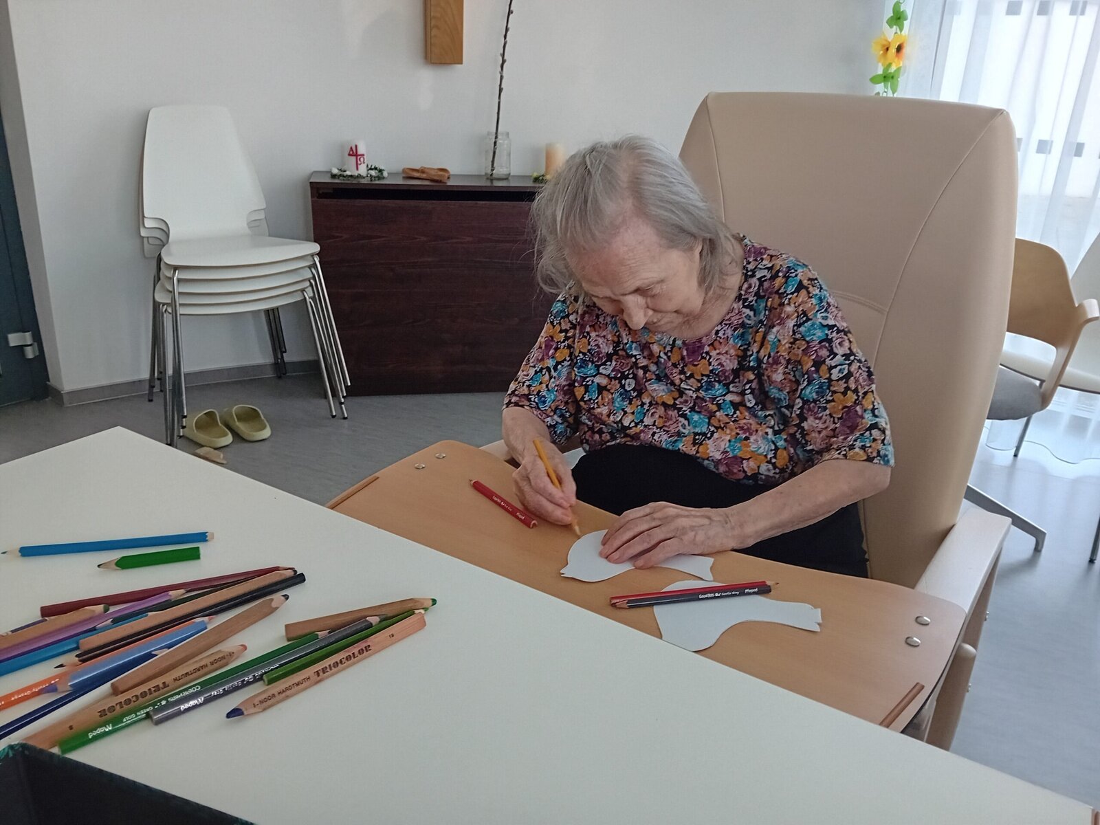 Čtvrteční dopoledne se neslo v duchu tvořivosti. Abychom s klienty aktivně přívítali jaro nejen při pobytu na zahradě, sešli jsme se tentokrát v naší společenské místosti při výrobě barevných ptáčků, které nám opět budou zdobit naše společné prostory v Senevida Slavkov u Brna.