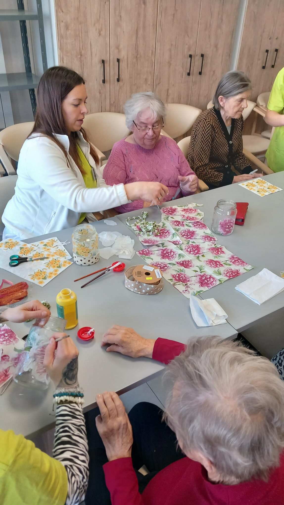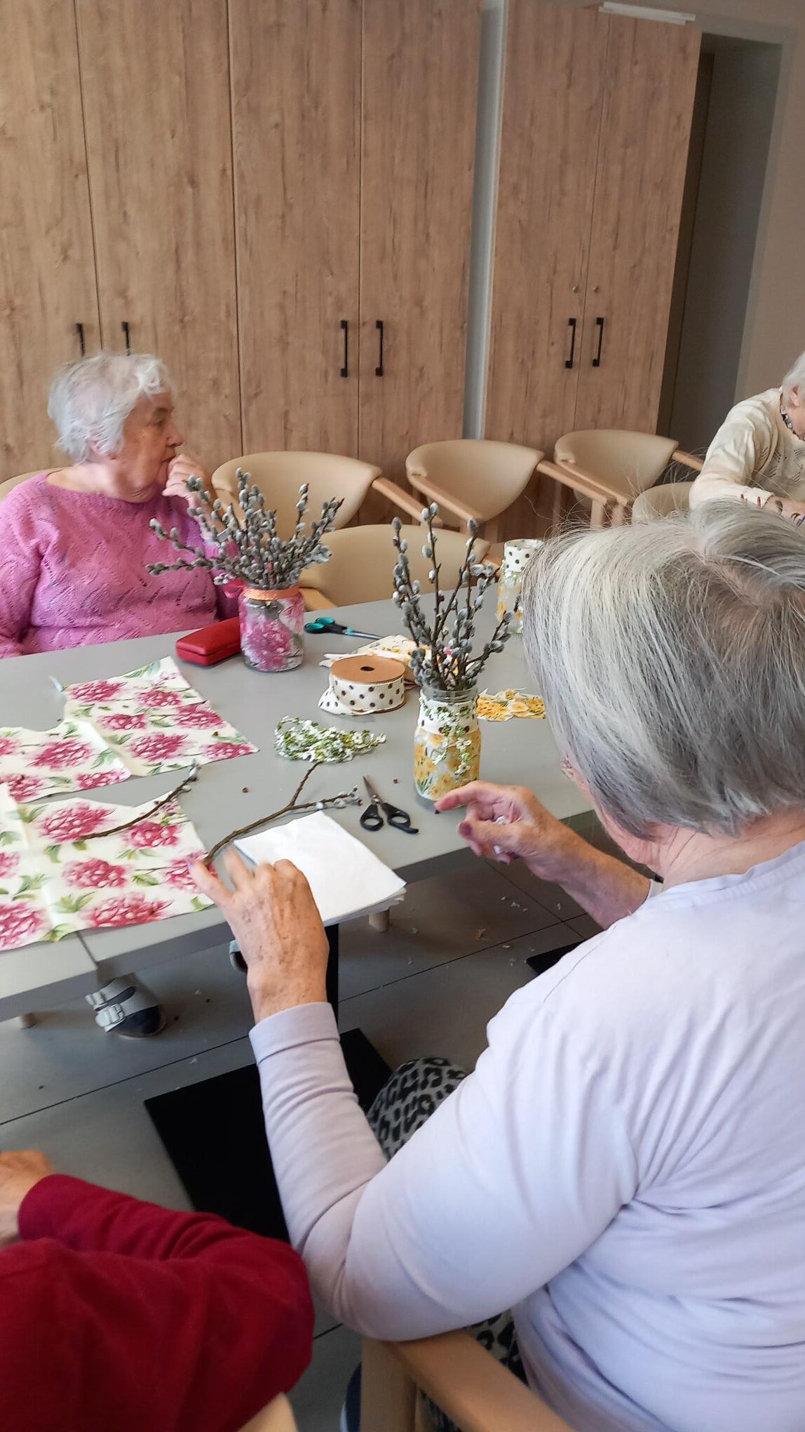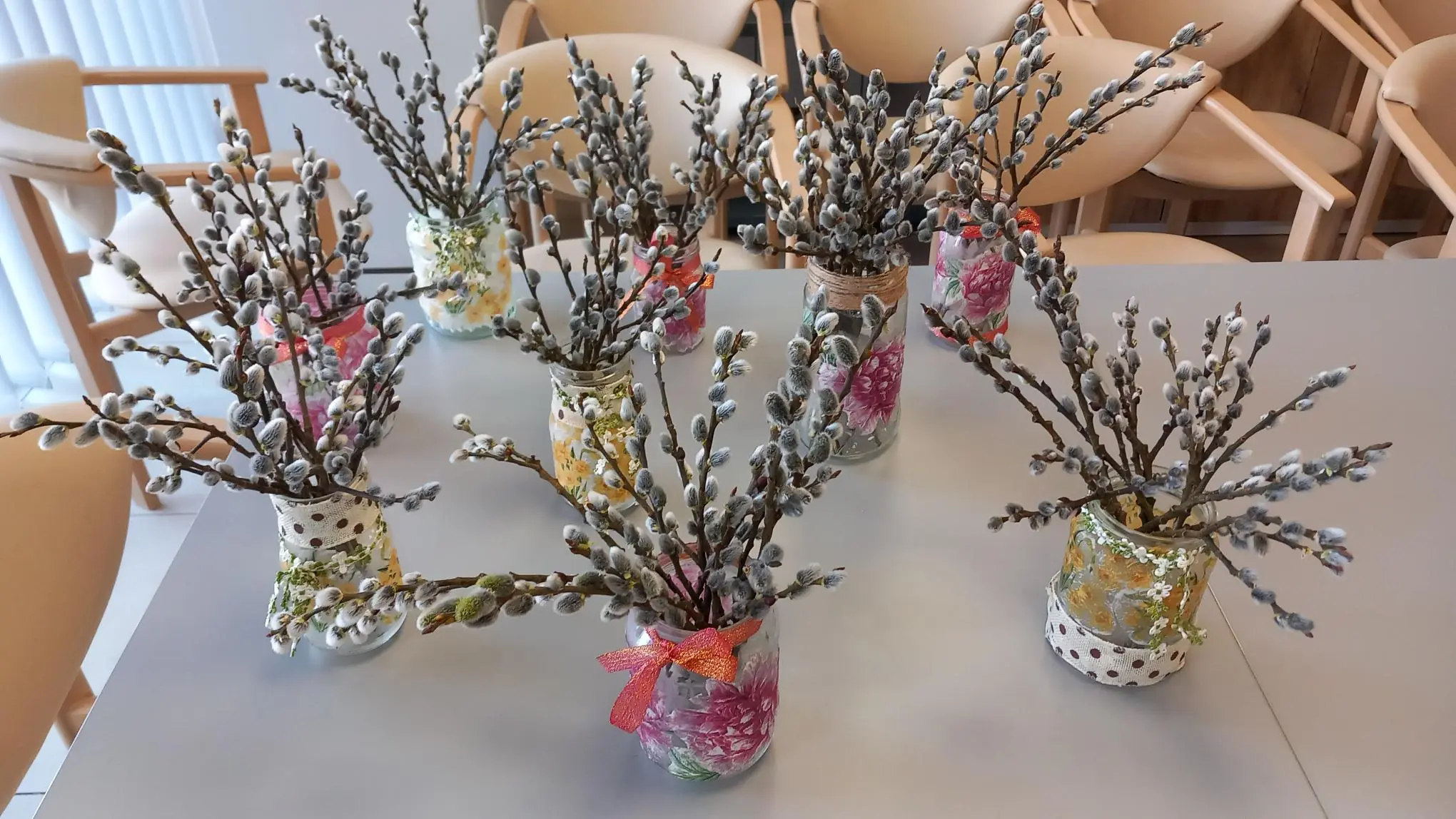 Ze zavařovacích sklenic jsme společně vyráběli jarní vázičky, které jsme zdobili ubrouskovou technikou a barevnými stužkami. Do hotových váziček jsme pak dali větvičky kočiček, které krásně navodili přicházející jarní atmosféru. 🌞 🙂