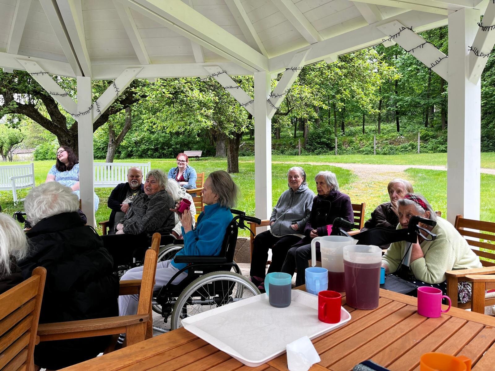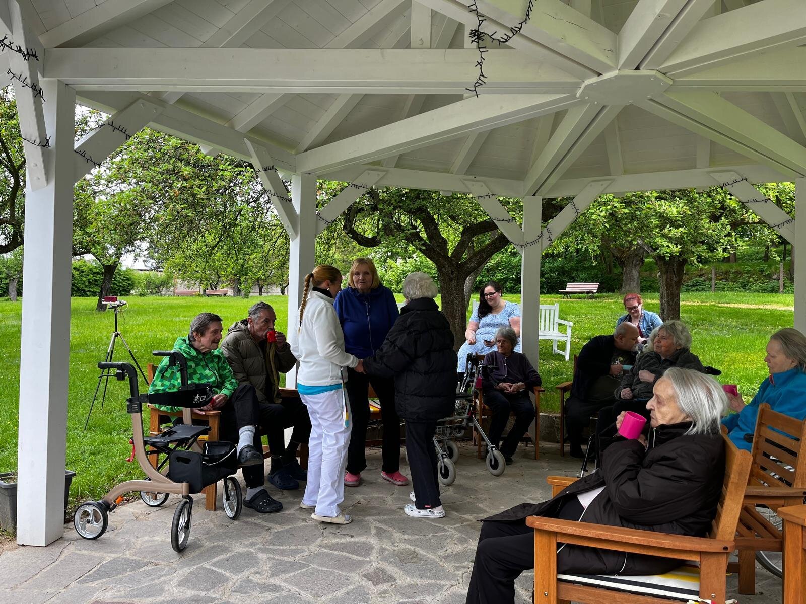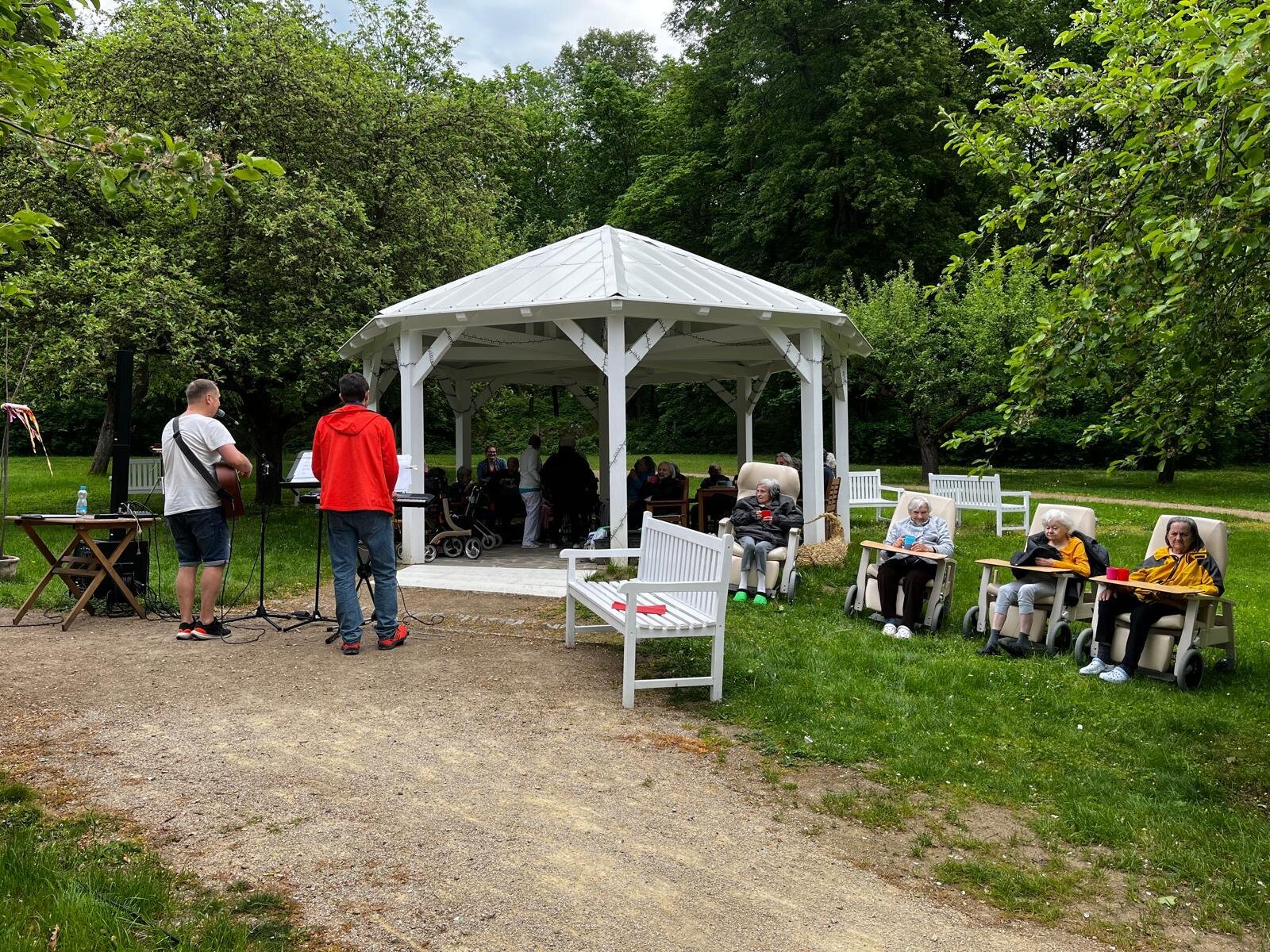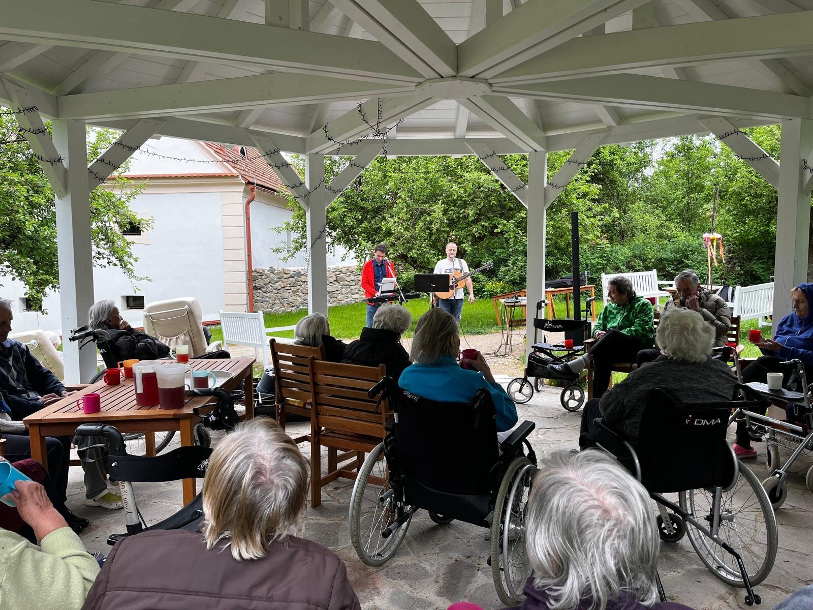 Vystoupení kapely G - SUS v Alzheimer Home Pyšely bylo krásné. Klienti si zazpívali, zatancovali, poslechli milá slova, a to celé venku na čerstvém vzduchu v našem altánku s teplým čajem v ruce.