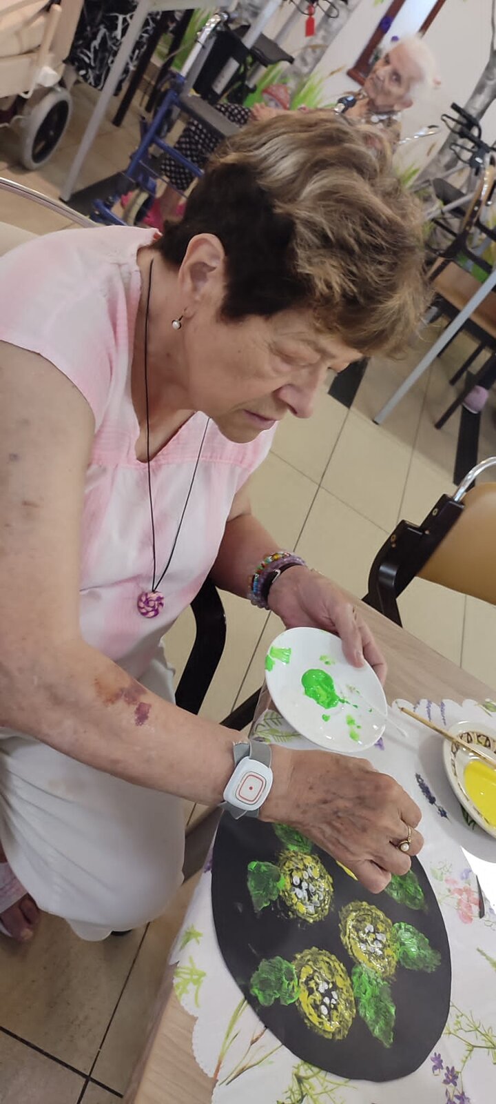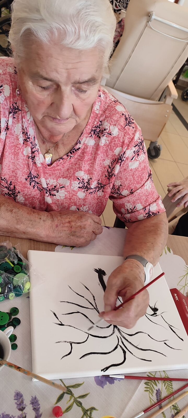 V rámci výtvarné dílny v Senevida Sychrov jsme si vyzkoušeli techniku tisku. Pomocí bublinkové fólie a barev jsme tiskli hortenzie. Klienti dále malovali na plátno siluety stromů, které následně dotvořili pomocí knoflíků.😊🌸