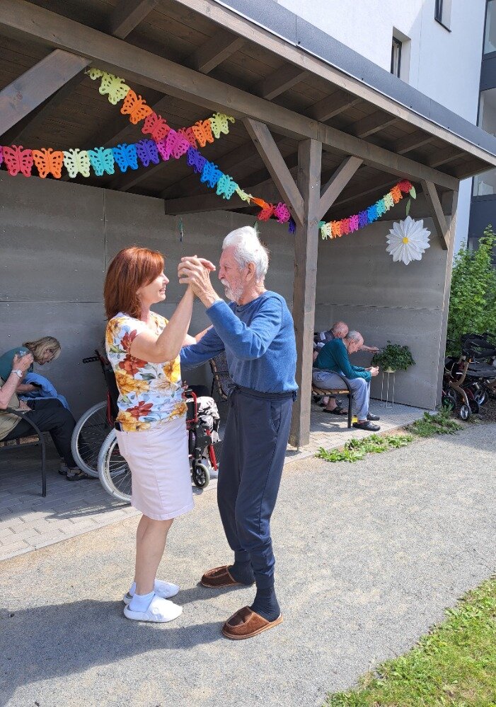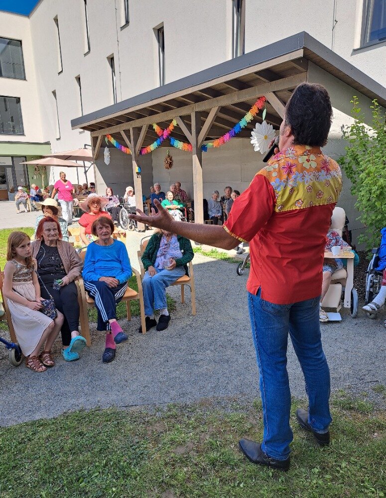 Léto jsme přivítali ve velkém stylu – příjemným venkovním posezením s hudbou, které se konalo v areálu našeho Senevida Boskovice a bylo určeno nejen pro naše milé klienty, ale i pro jejich rodiny. Na výzdobě zahrady a přípravě pohoštění se aktivně podíleli naši klienti s aktivizačními pracovnicemi. O hudební doprovod se postaral pan Jaromír Adamec, který vystupuje jako Waldemar Matuška.