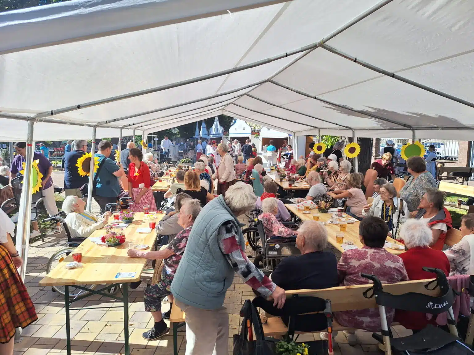 Ve čtvrtek 18. září 2025 jsme si užili krásné slunečné odpoledne v atmosféře pravé jihočeské vesnice – to bylo téma naší Zahradní slavnosti 2025. Na přípravě se podíleli z velké části naši klienti, kteří tvořili kulisy ve tvaru jihočeských domků i krásných rozkvetlých slunečnic. Dobrovolníci z obce Žďár u Protivína nám pomohli postavit dřevěné domky zapůjčené z MAS Strakonicko, ze kterých náš kuchařský team podával občerstvení všem zúčastněným.