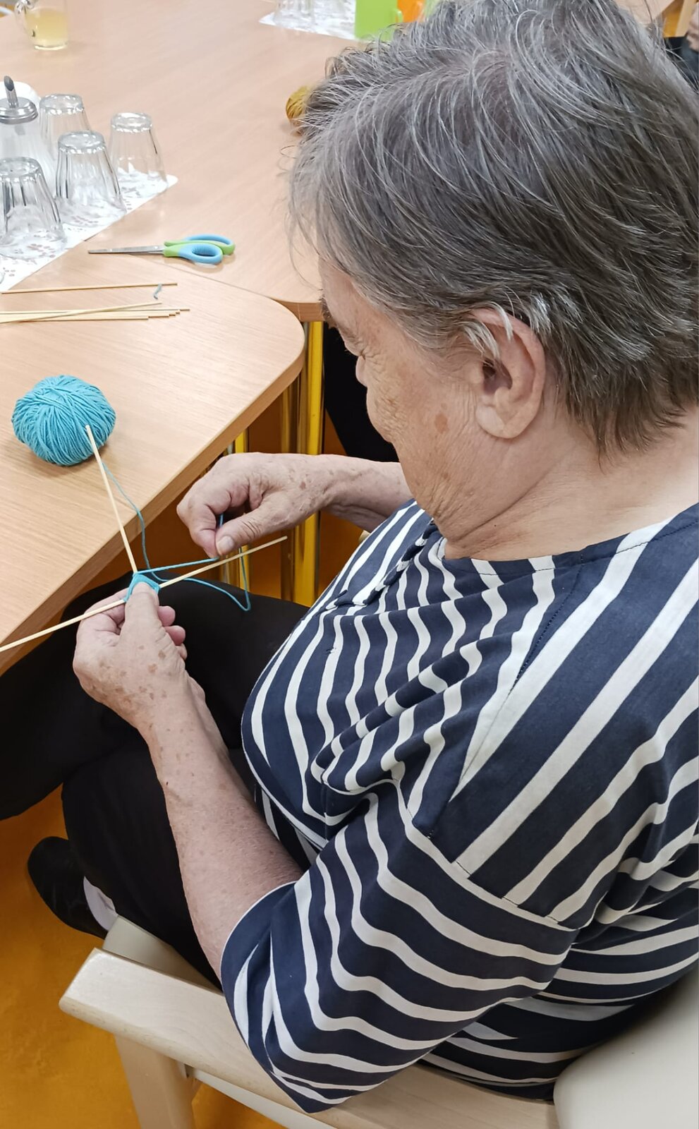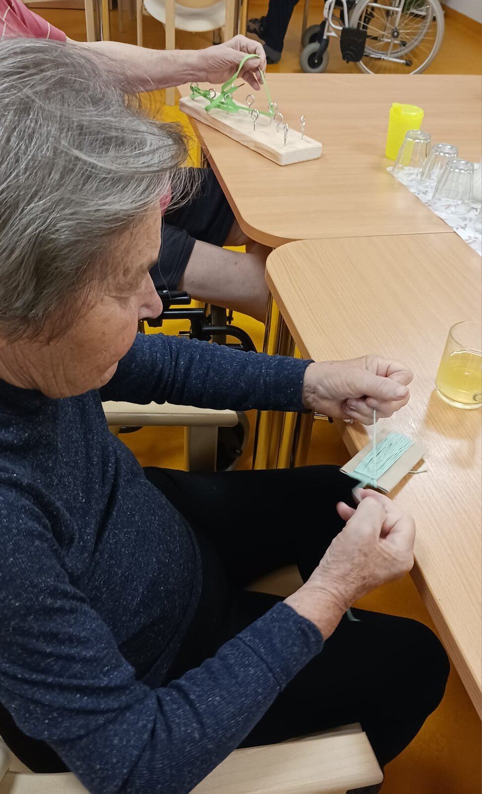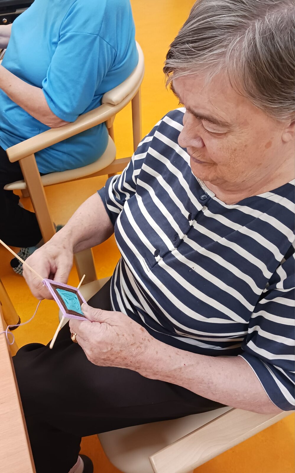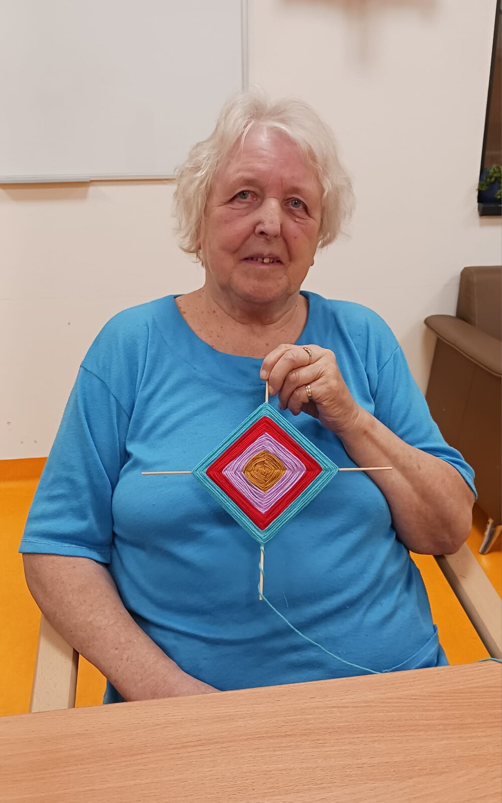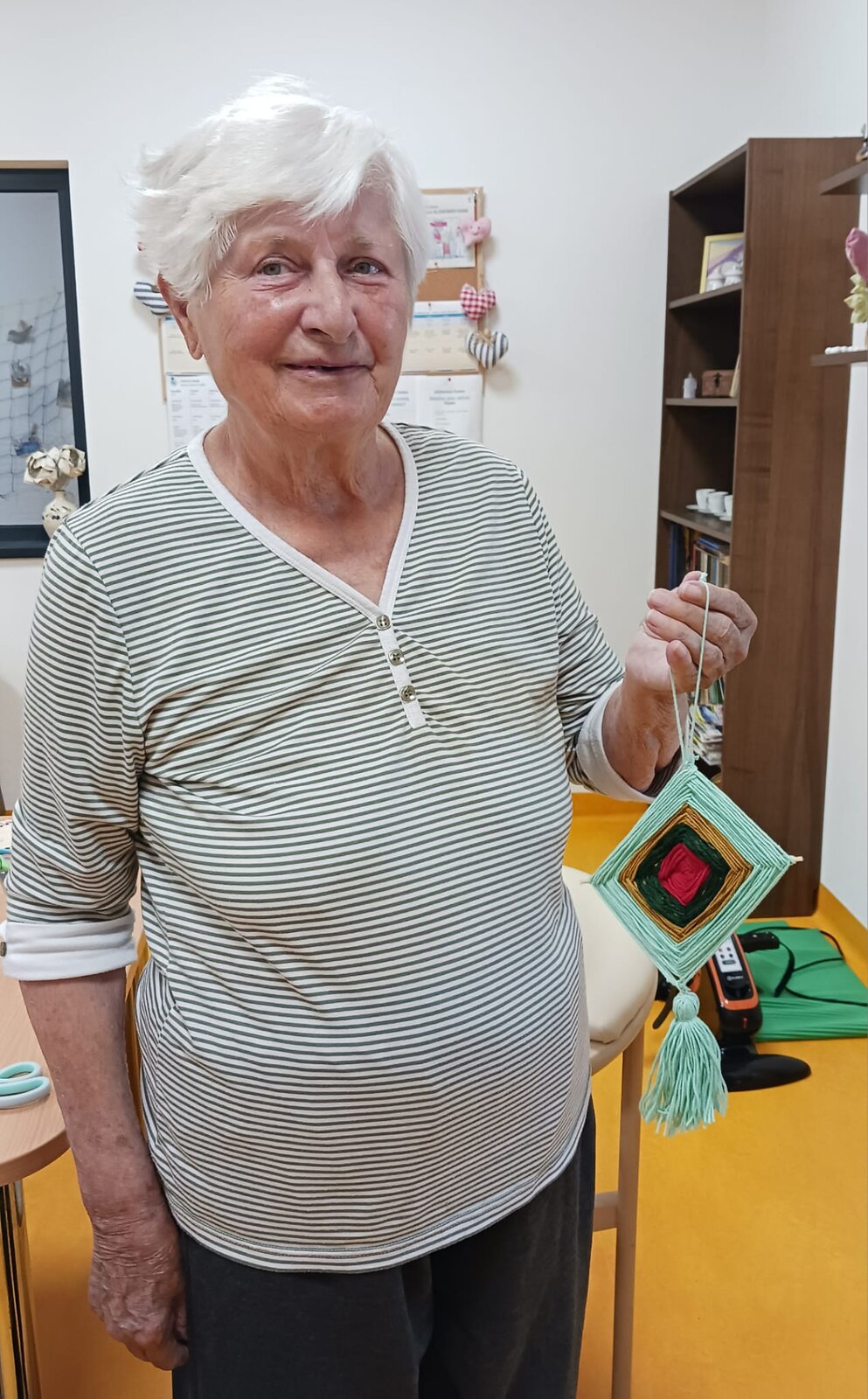 Naši klienti se v Senevida Kamenice nad Lipou pustili do tvoření krásných závěsných dekorací z barevných bavlnek. S velkou trpělivostí a pečlivostí omotávaly nitky kolem dřevěných špejlí, až vznikly barevné geometrické vzory, které hrají všemi odstíny.