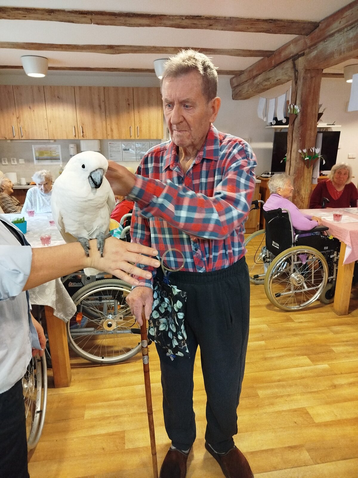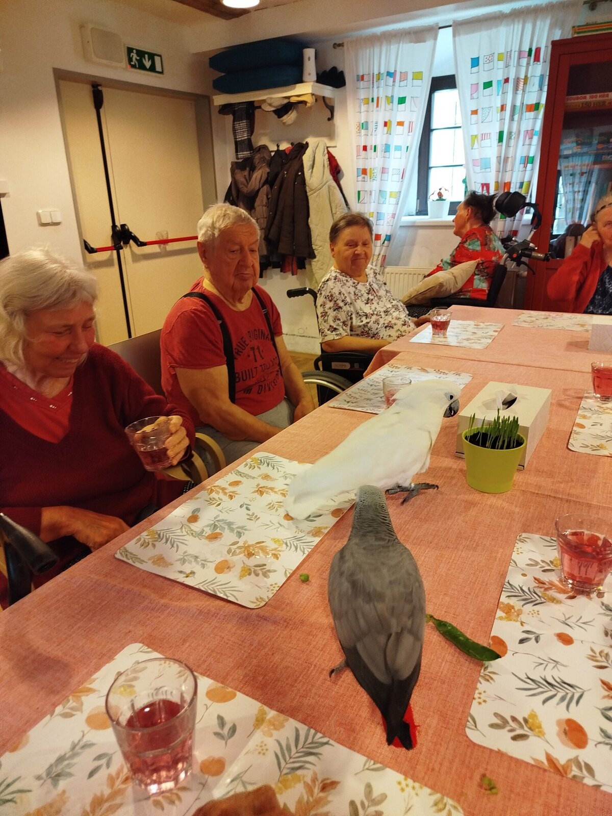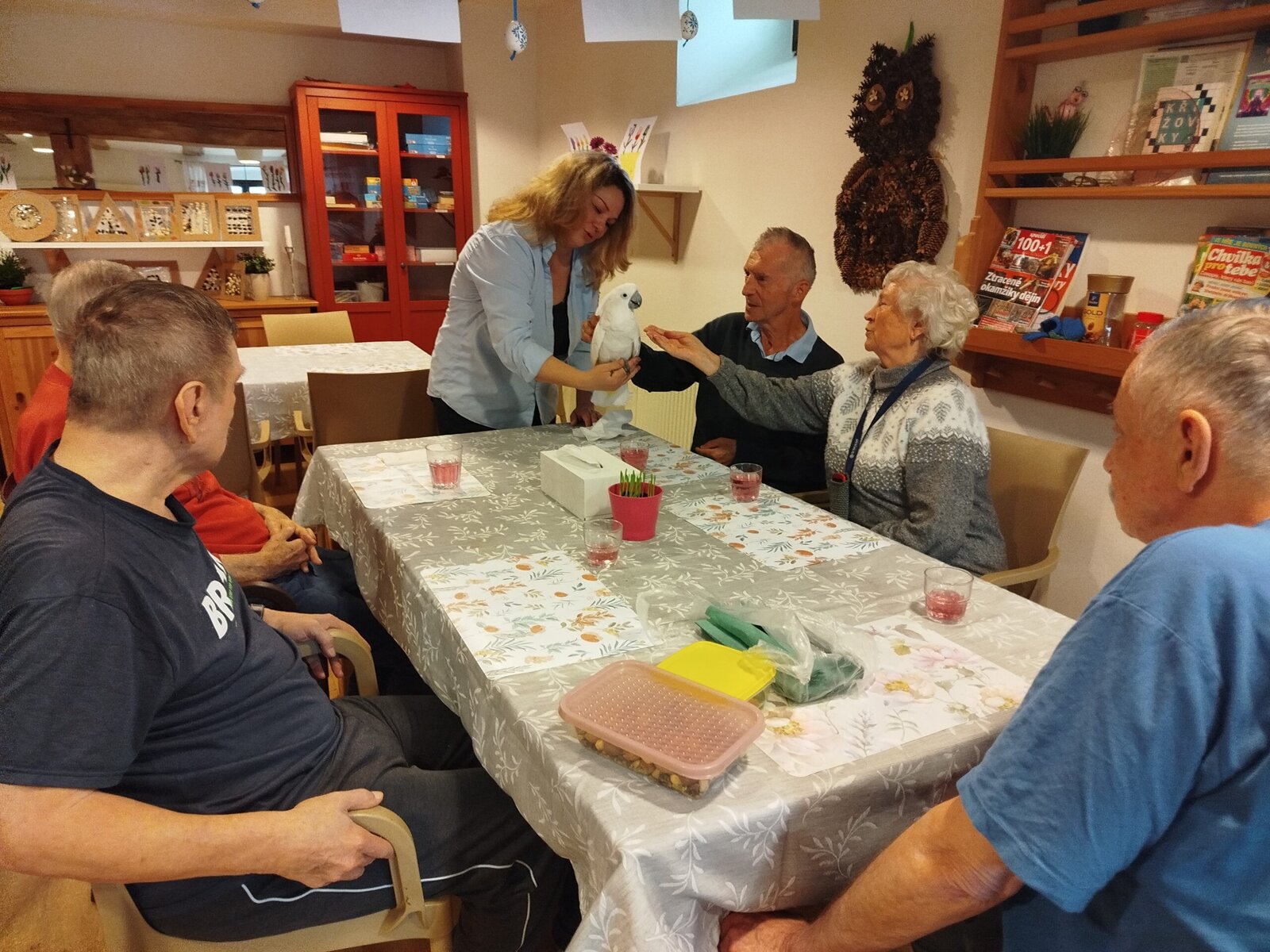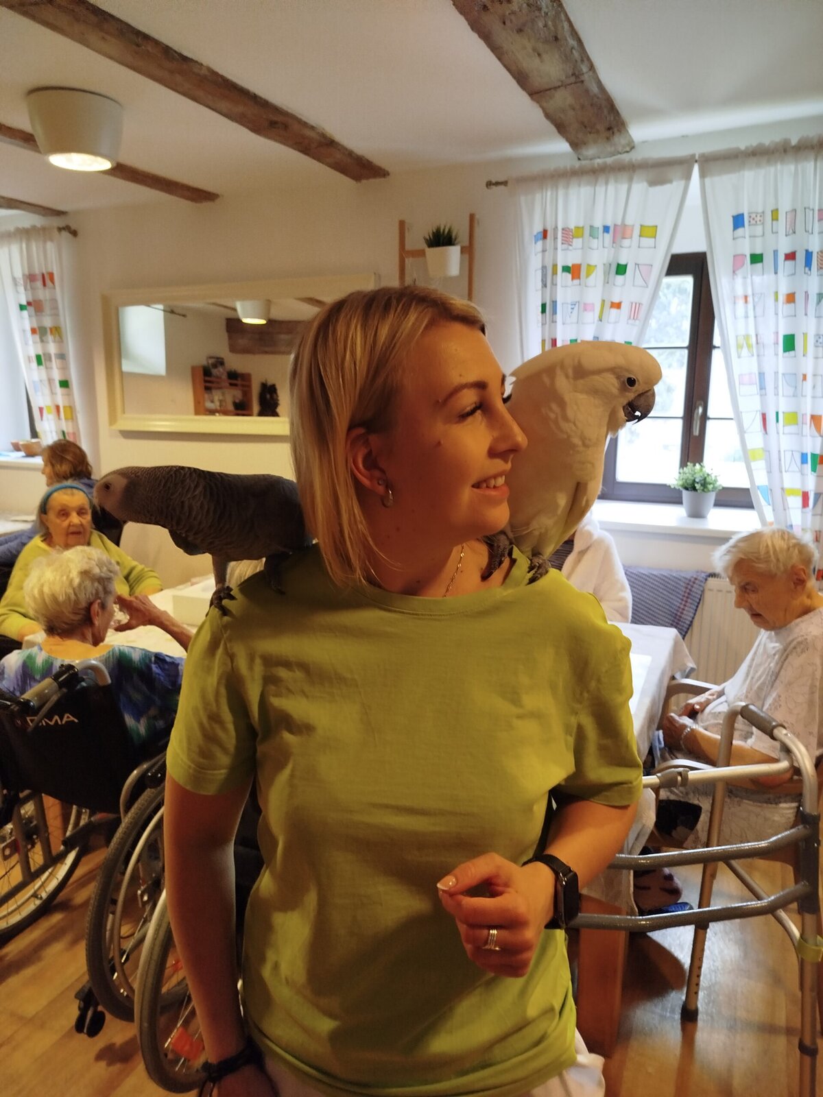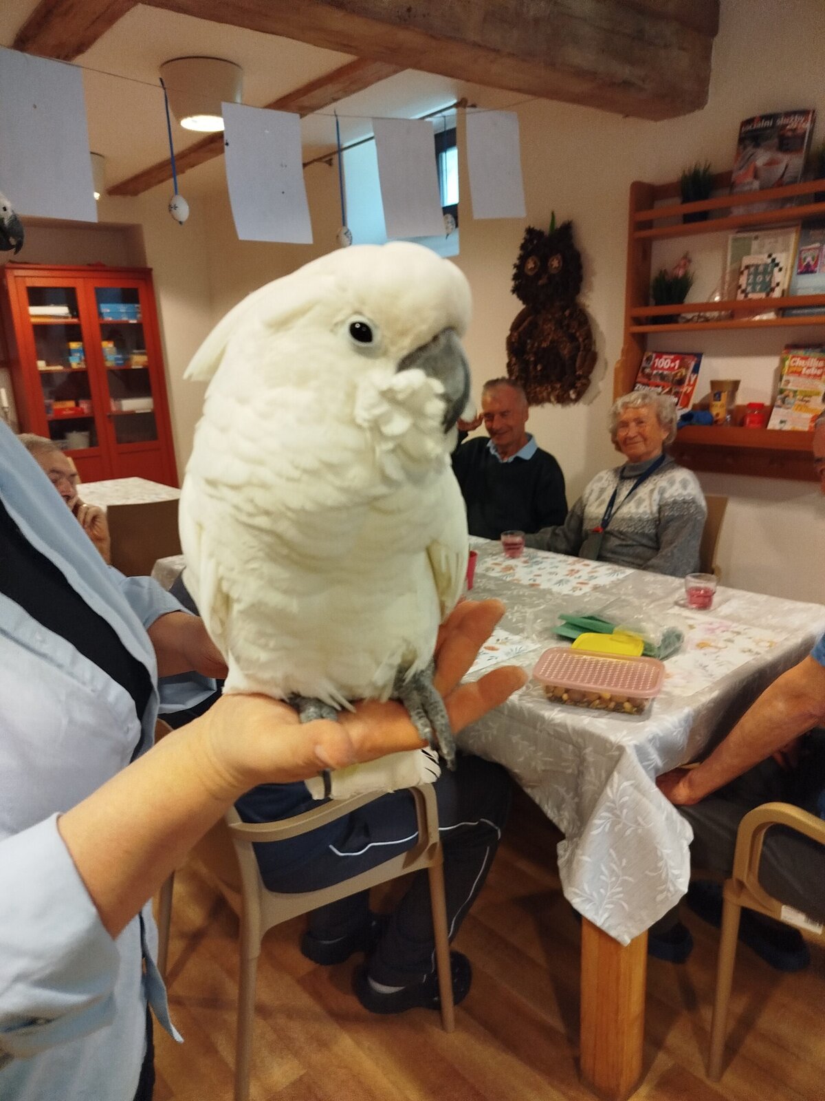 Dnes nás v Senevida Pyšely navštívili dva papoušci. Po tom, co se rozkoukali, lítali po celé místnosti. Občas na někoho přilétli, aby si nás prohlédli zblízka. Mohli jsme si je pohladit a dát jim něco dobrého na zub. Bylo to moc příjemné setkání. Už teď se těšíme na další návštěvu