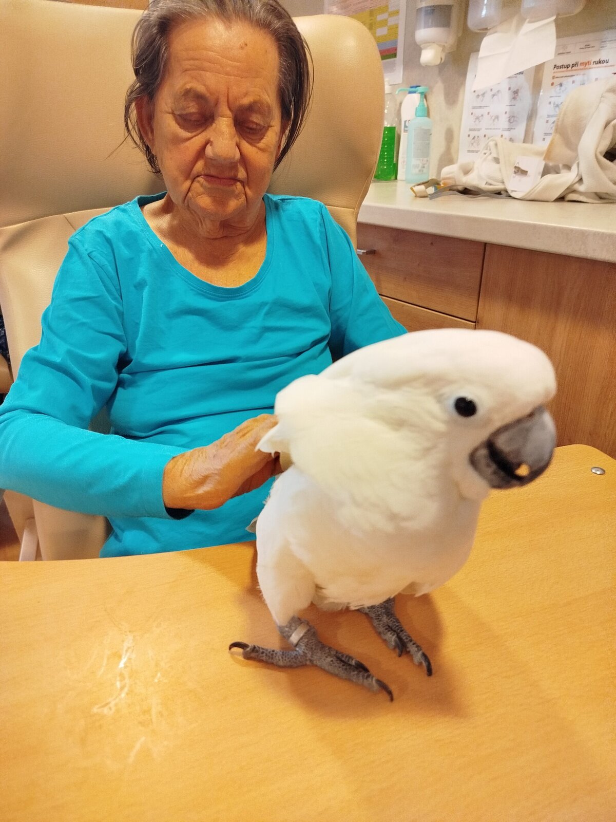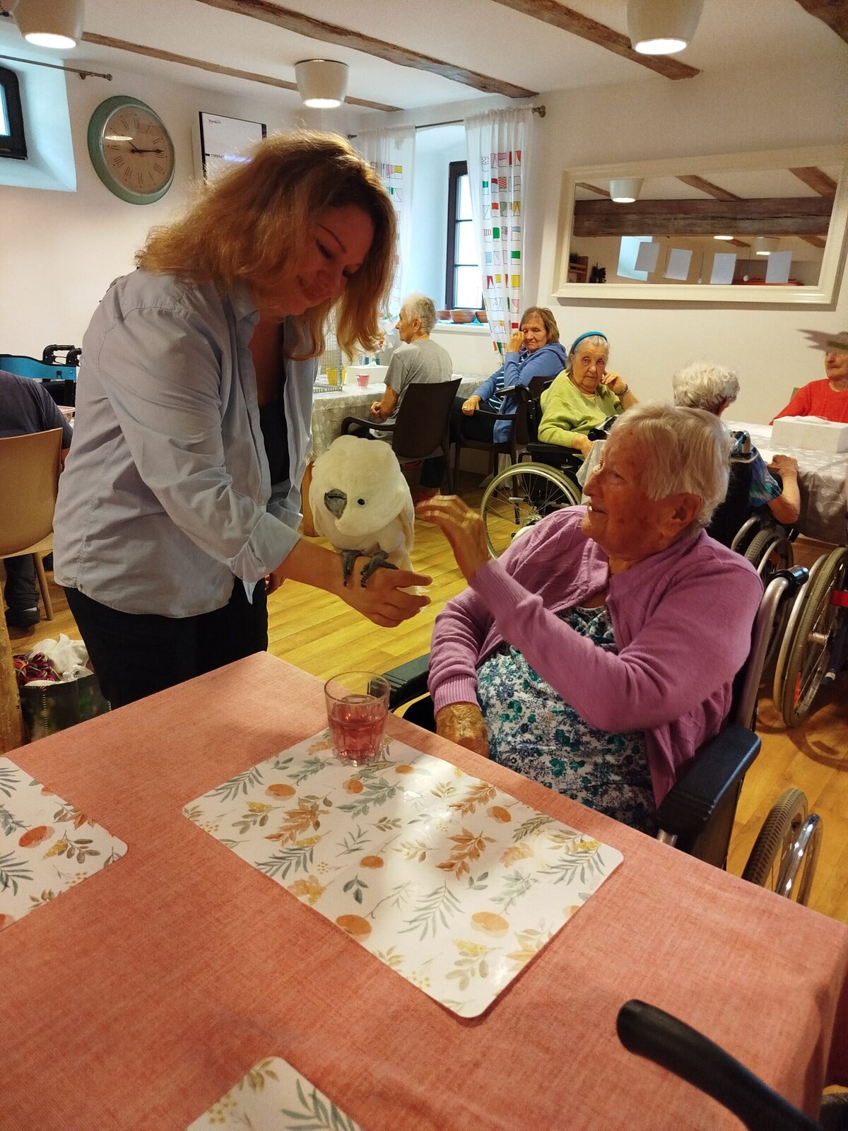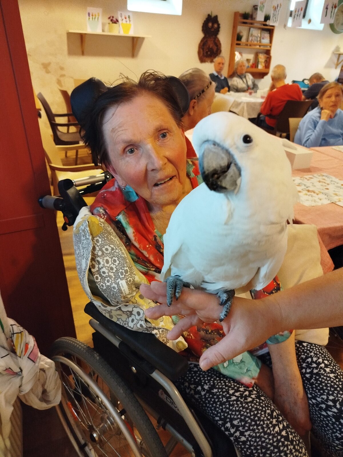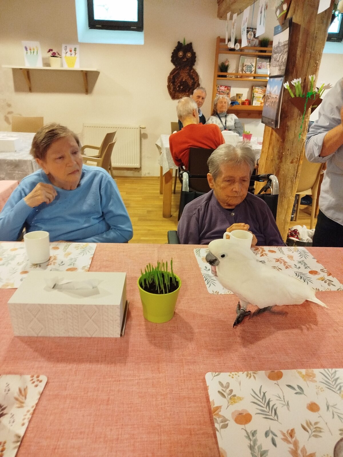 Dnes nás v Senevida Pyšely navštívili dva papoušci. Po tom, co se rozkoukali, lítali po celé místnosti. Občas na někoho přilétli, aby si nás prohlédli zblízka. Mohli jsme si je pohladit a dát jim něco dobrého na zub. Bylo to moc příjemné setkání. Už teď se těšíme na další návštěvu